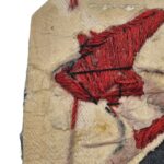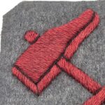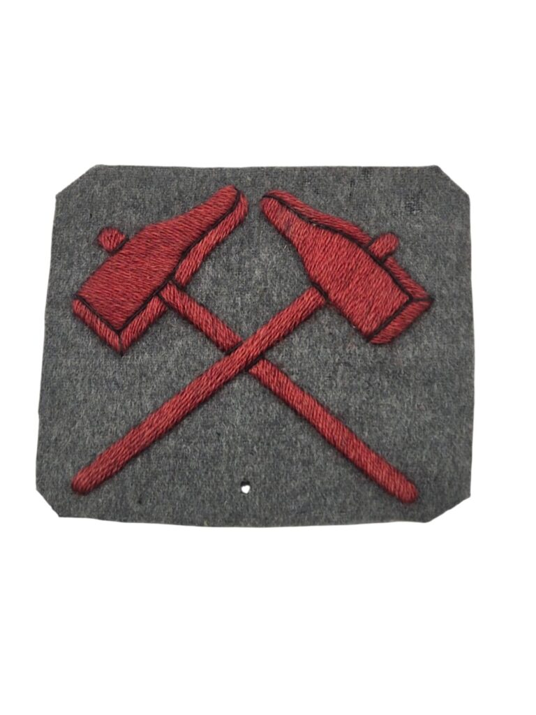Zeldzaam 1e model Nederlands manschappen vaardigheidsembleem voor monteur. Dit embleem is alleen in gebruik geweest van 24 juli 1922 t/m 11 september 1923 en werden toen vervangen door het embleem met de blauwe hamers. Het embleem is gemaakt van veldgrijze stof met daarop 2 in scharlakenrode wol gekruiste hamers, wat betekend dat het het vaardigheidsembleem is voor een monteur in de rang van soldaat of korporaal. Het embleem verkeerd in een goede staat met 1 klein motgaatje aan de voorzijde. Aan de achterzijde staat nog een naam.