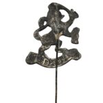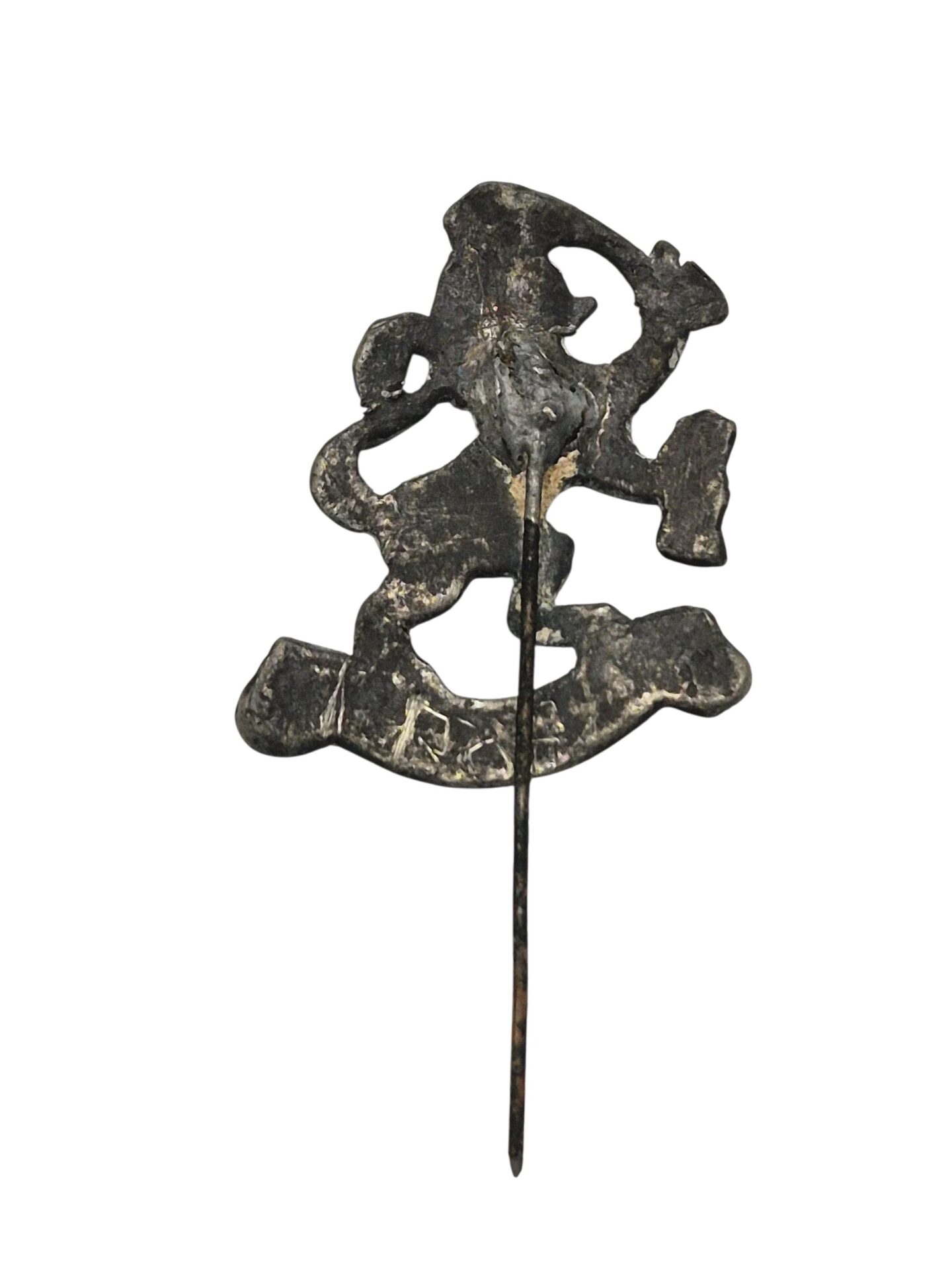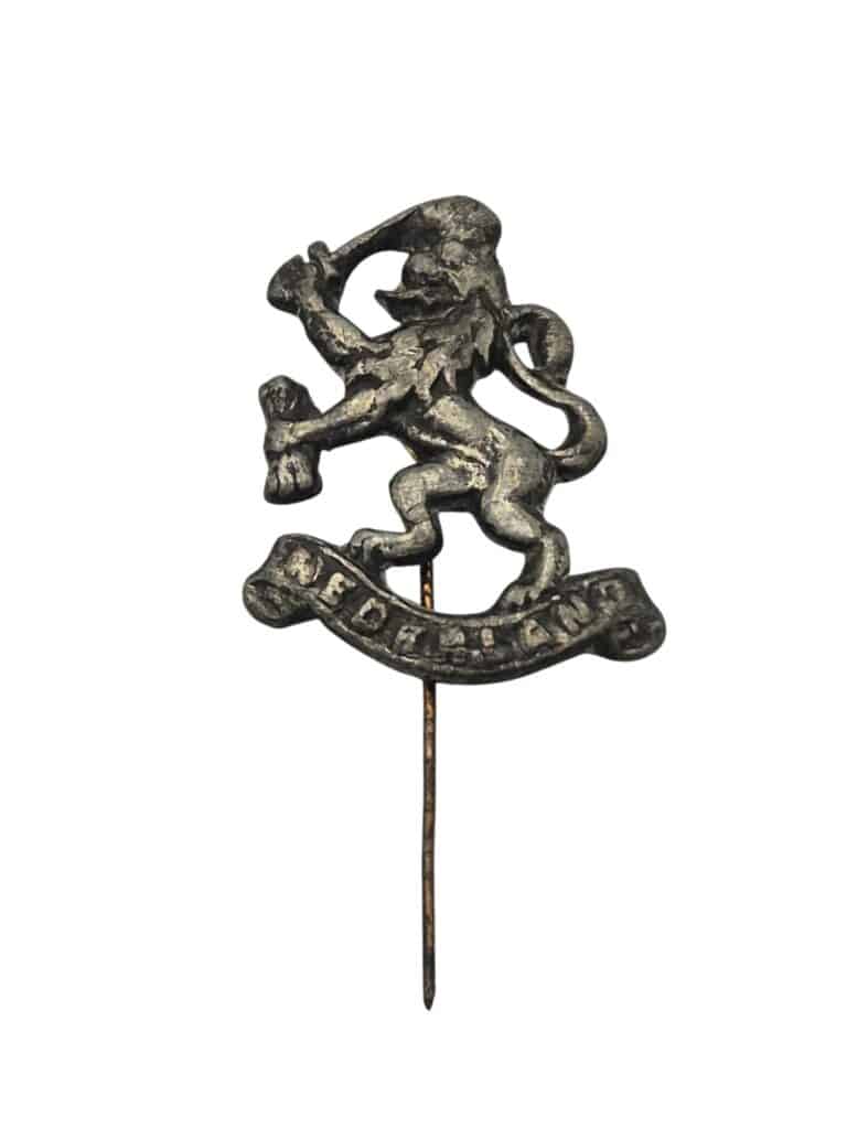 Nederlandse baretembleem vermaakt tot speld. Dit betreft een Indië aanmaak baret leeuwtje, hij is op een vrij primitieve manier gegoten en afgewerkt.