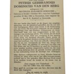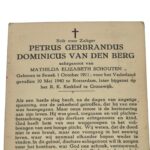 Bidprentje van een LVA soldaat die is omgekomen in Rotterdam op 10 mei 1940. Het bidprentje is nog in een goede conditie met foto. Petrus Gerardus Dominicus van den Berg is omgekomen tijdens het bombardement op de Waalhaven. Geboren 1 oktober 1911 in Sneek