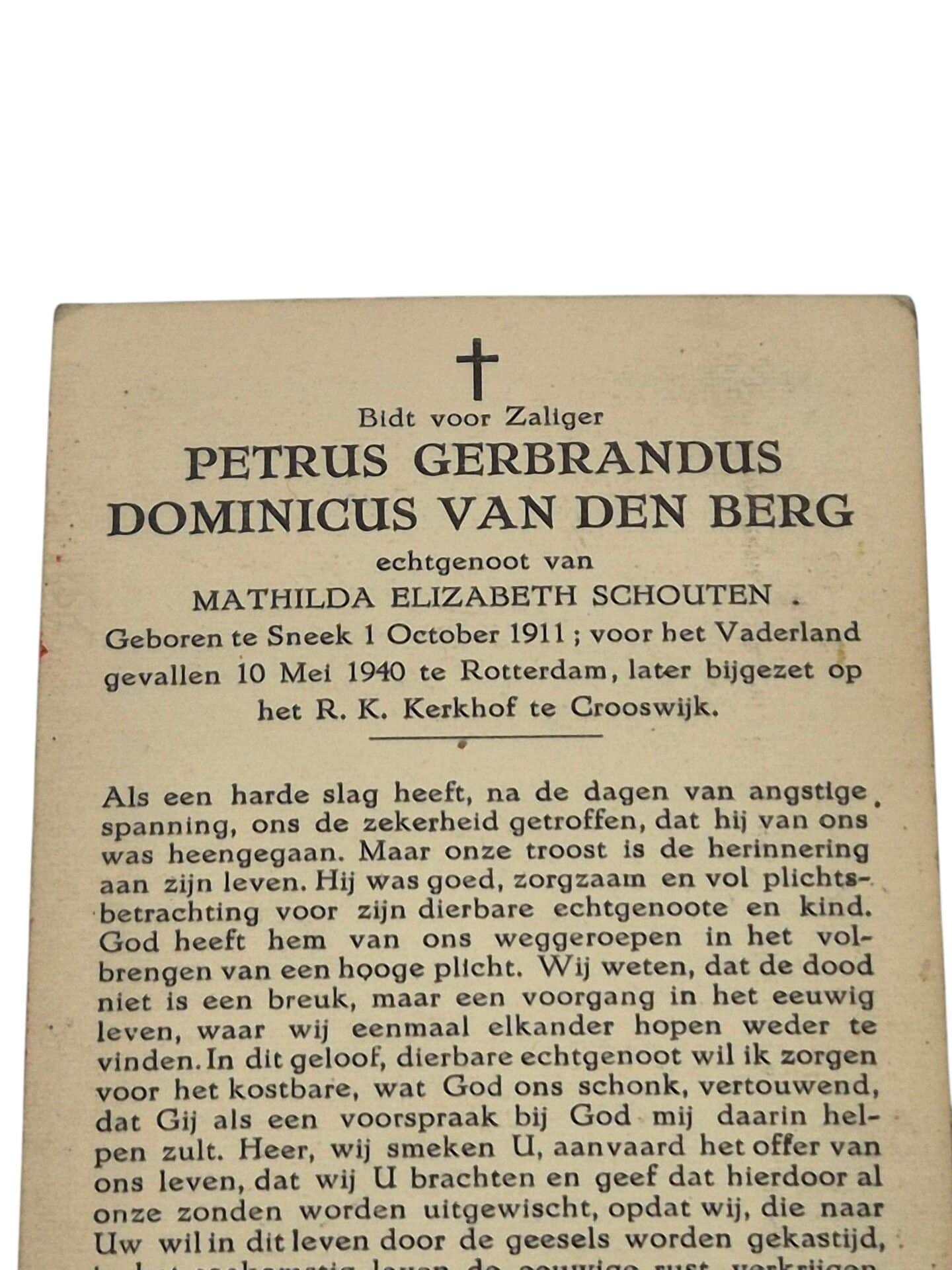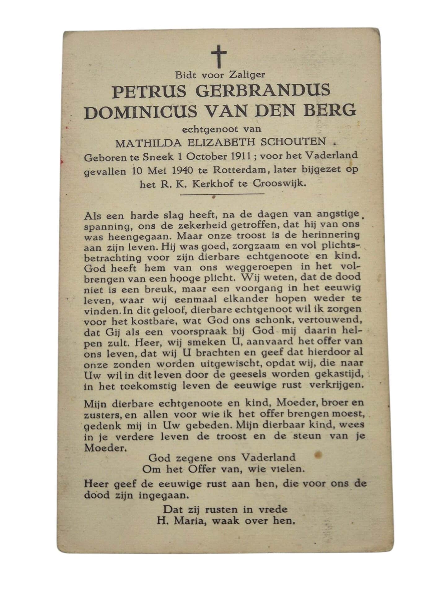 Bidprentje van een LVA soldaat die is omgekomen in Rotterdam op 10 mei 1940. Het bidprentje is nog in een goede conditie met foto. Petrus Gerardus Dominicus van den Berg is omgekomen tijdens het bombardement op de Waalhaven. Geboren 1 oktober 1911 in Sneek