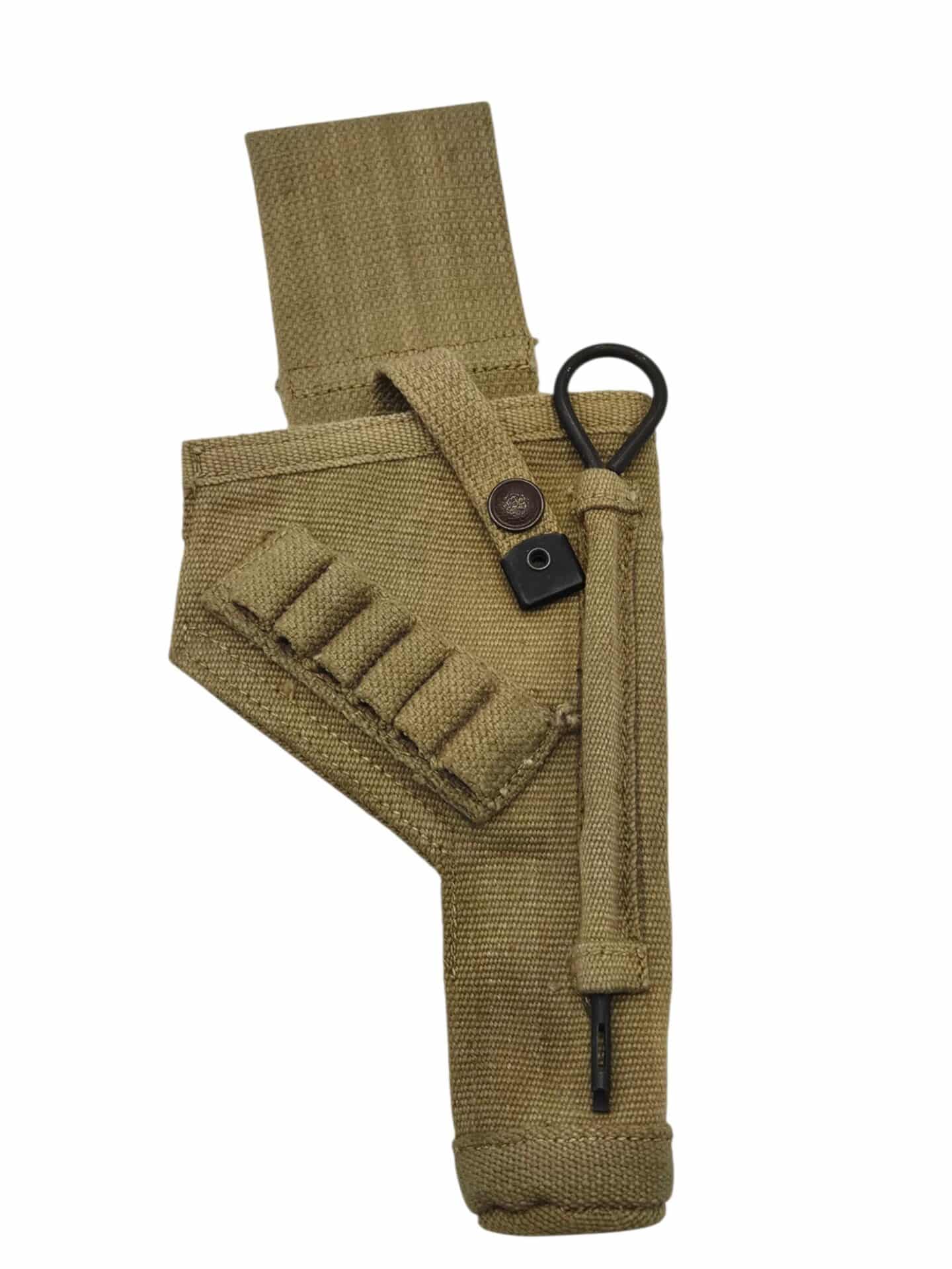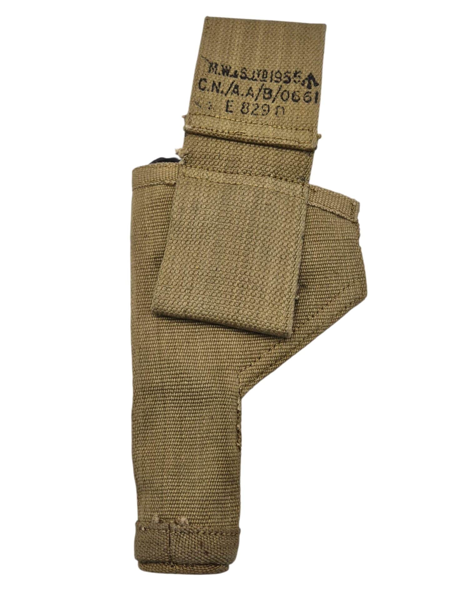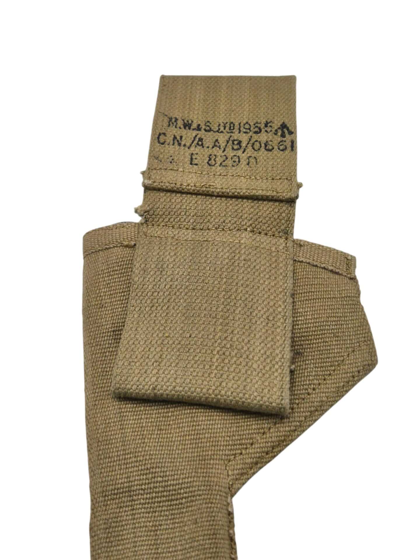 British tank crew holster, this holster is dated 1955 but it is still exactly the same model as the 2nd model used in the second world war. The holster is in a mint condition. It is complete with the closing strap and cleaning rod. The back is marked and dated 1955 with the broad arrow. Great to complete a WW2 tank crew overall or for reenactment.