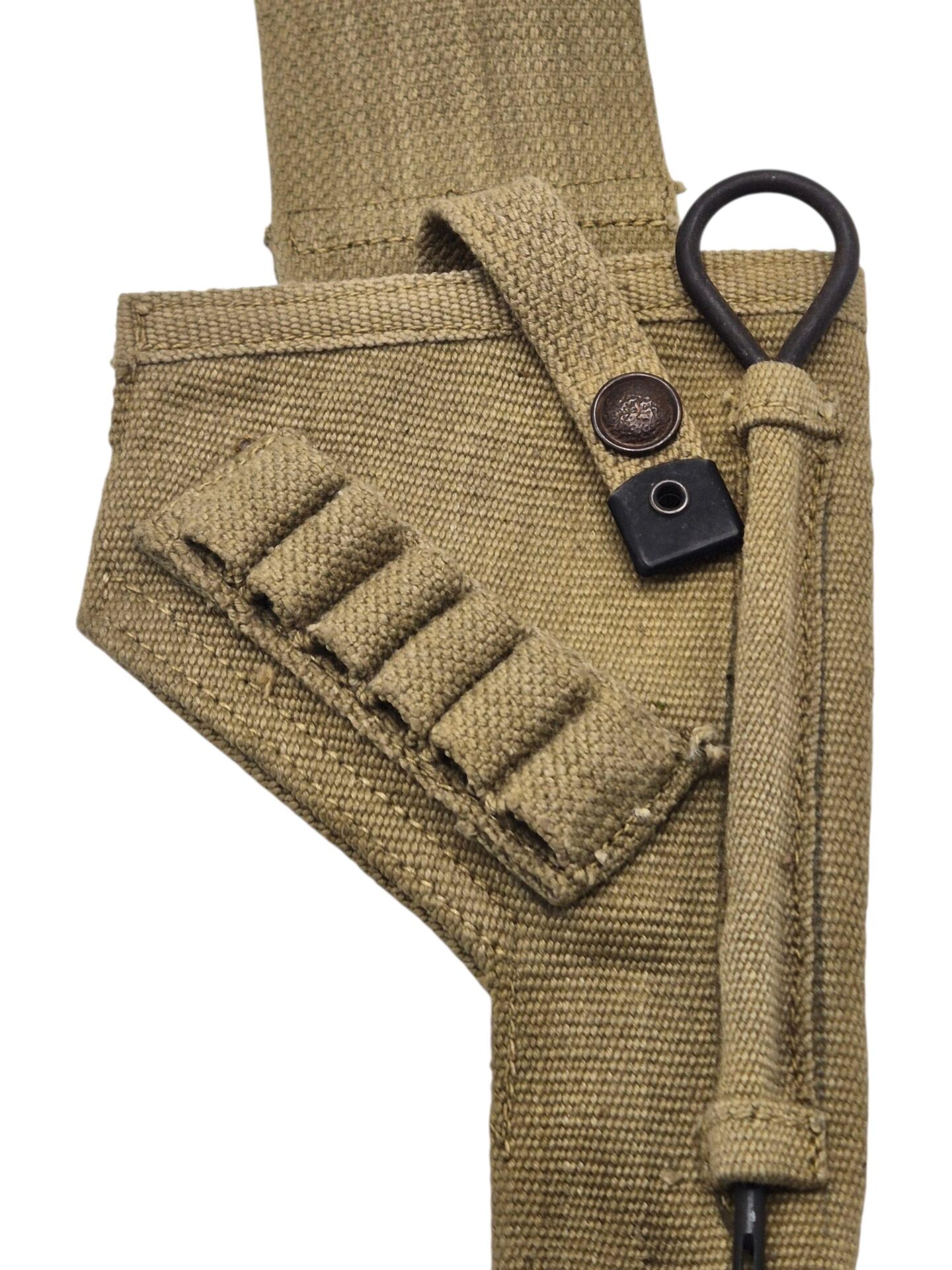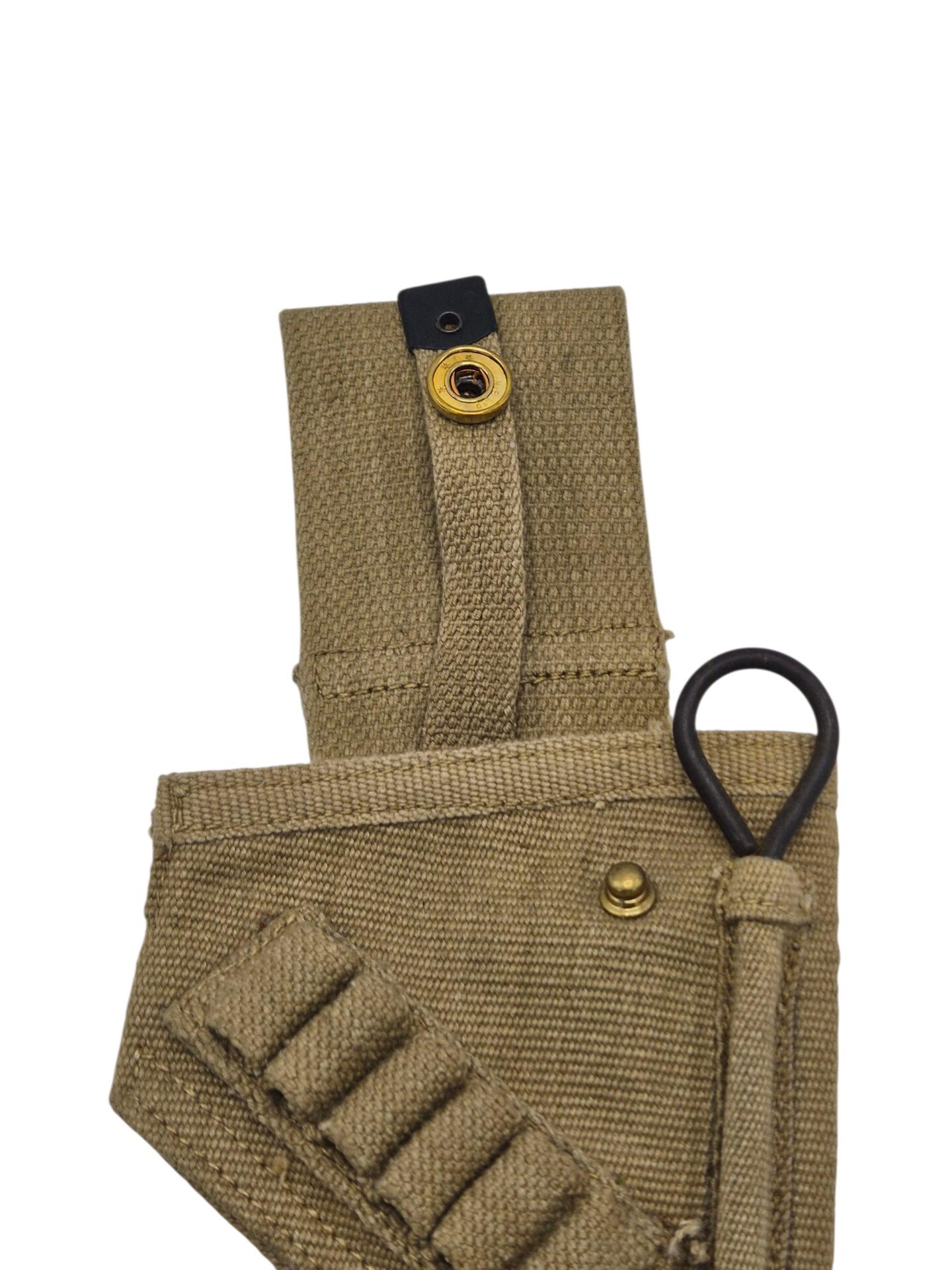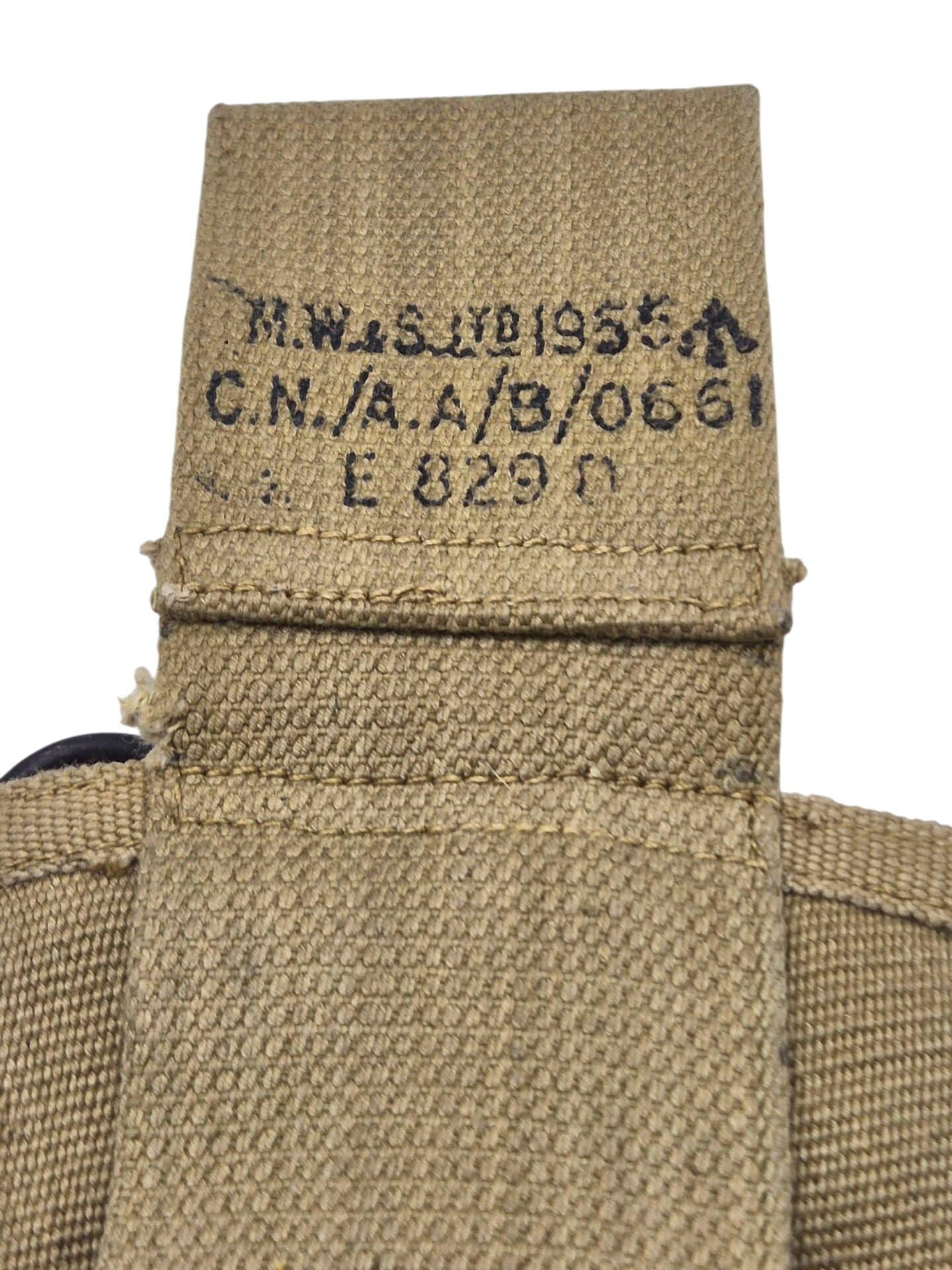 British tank crew holster, this holster is dated 1955 but it is still exactly the same model as the 2nd model used in the second world war. The holster is in a mint condition. It is complete with the closing strap and cleaning rod. The back is marked and dated 1955 with the broad arrow. Great to complete a WW2 tank crew overall or for reenactment.