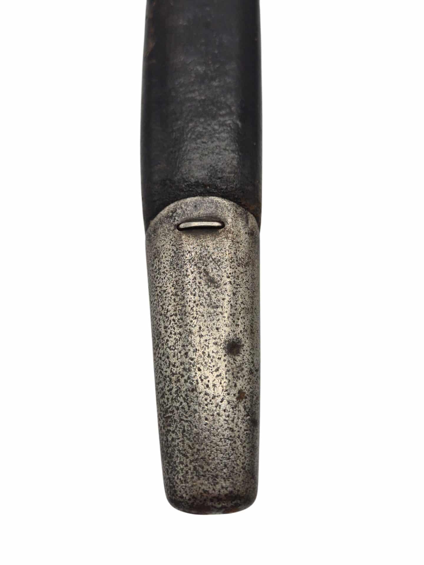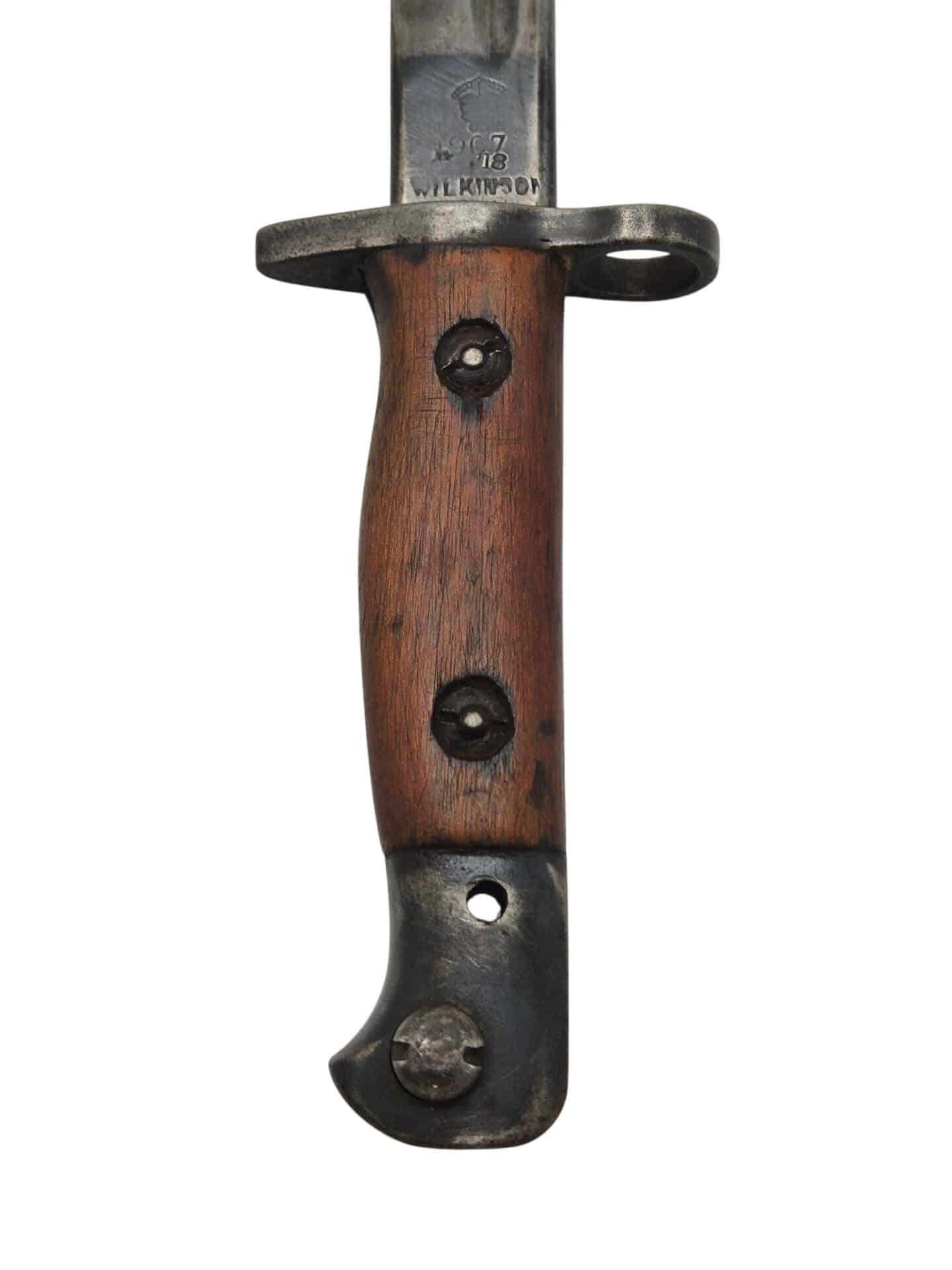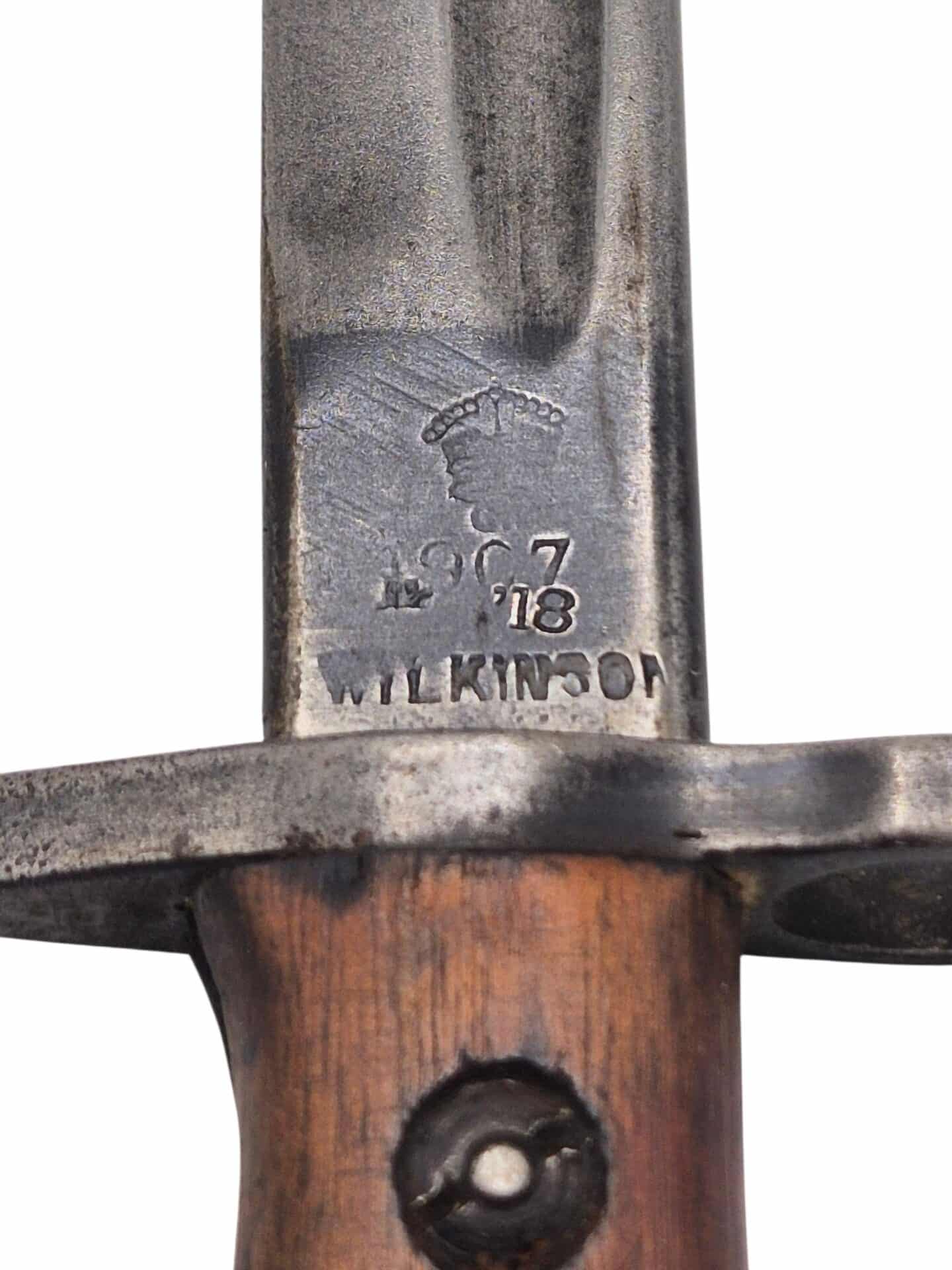 British Wilkinson 1907 pattern Enfield Bayonet scabbard and frog. The bayonet is in a nicely used condition. Nice markings on the blade. The leather of the scabbard is in very good condition.