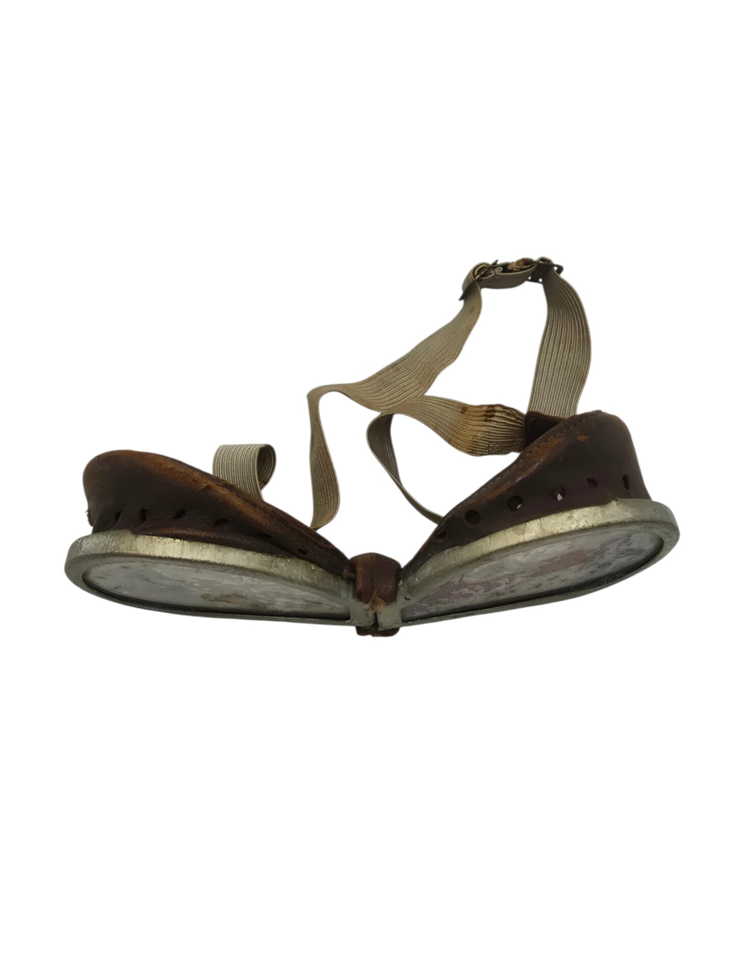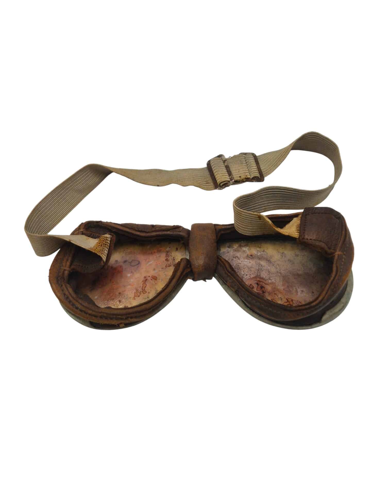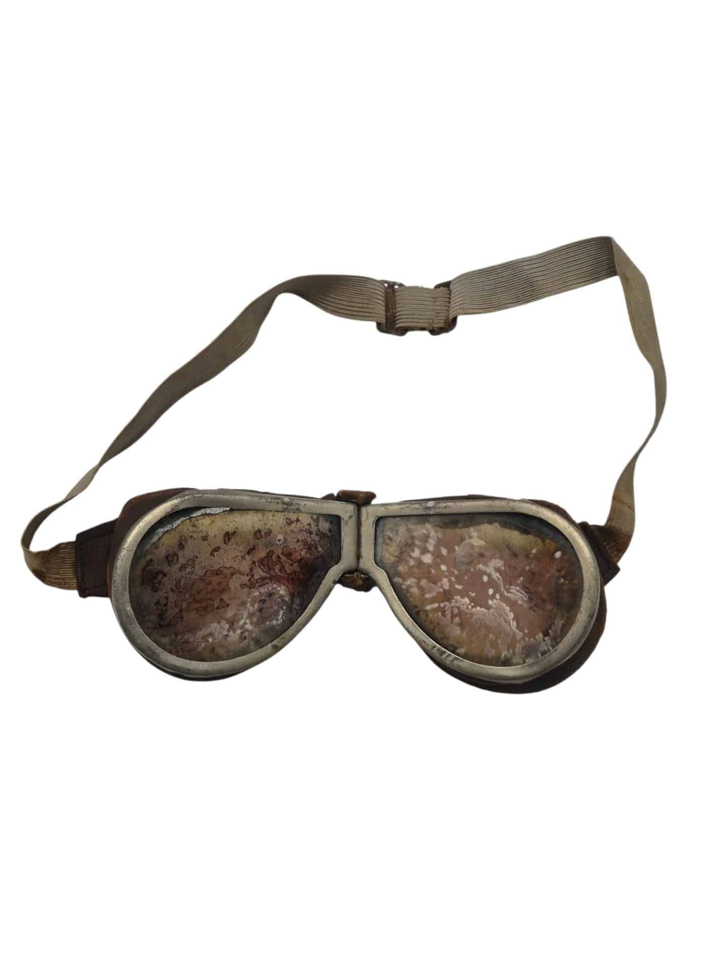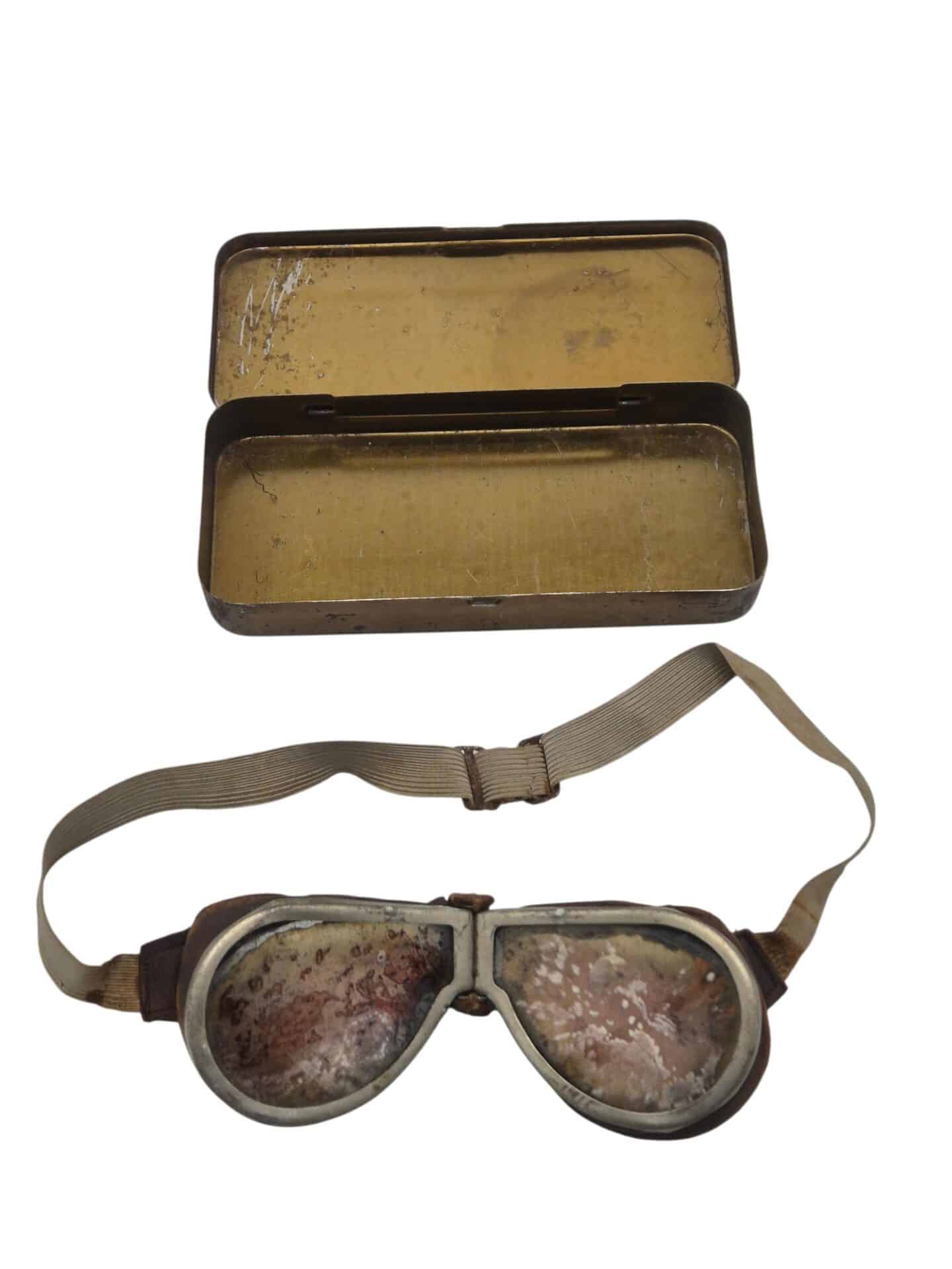 Nice motorcycle or tanker goggle set from the second world war! The set consists of a motorcycle dust goggle and the original metal case. The glasses are cloudy. The elastic band is still present. The metal case is in a used but good condition. On the front it is marked Francis and sons 1943 London.