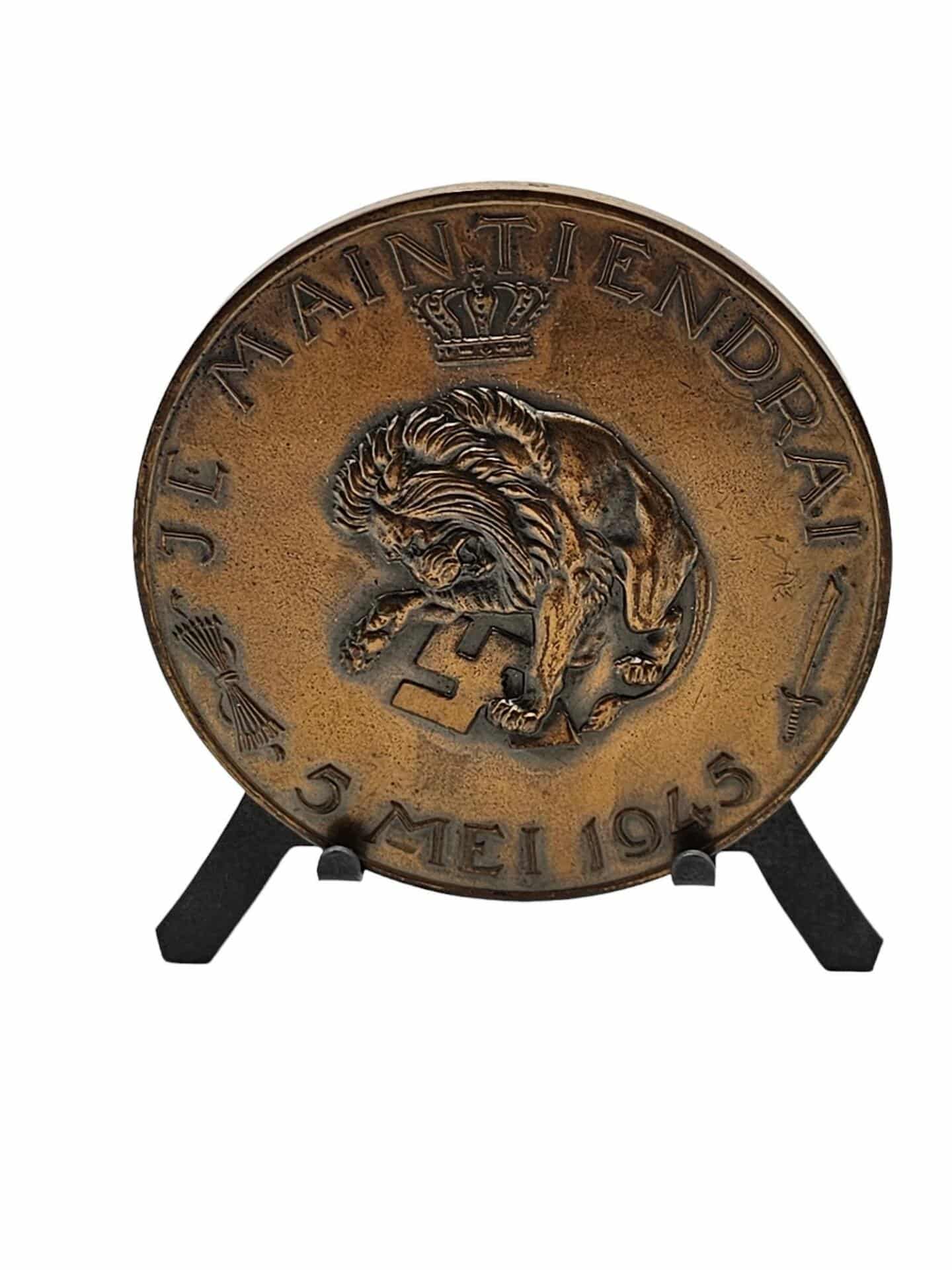 Mooie grote penning ter ere van de bevrijding. Afbeelding waar de Nederlandse leeuw het hakenkruis verscheurt. Aan de andere zijde een dame met zwaard en palmtak begeleid door de tekst vrijheid. De penning is in een zeer goede conditie en wat het bijzonder maakt nog voorzien van het originele standaardje dat bij de penning geleverd werd. Deze missen altijd.