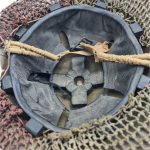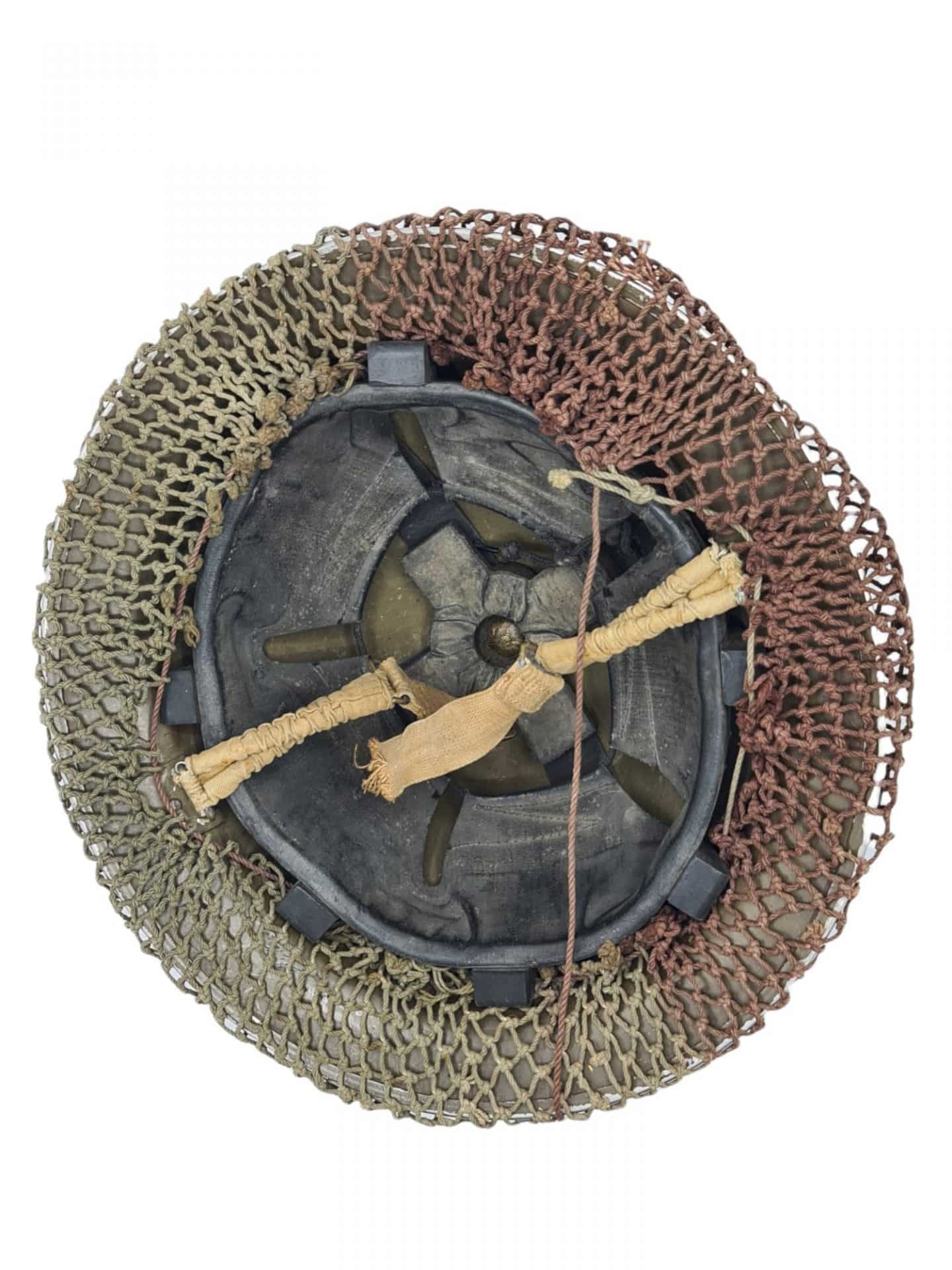 Canadian MKII helmet CLC 1942 with two tone camo net. The helmet is in a very good condition with all of it´s paint under the two tone camo net. It comes with the original liner and chin strap. The helmet is covered with a very nice two tone camo net also in good condition. The inside of the helmet is marked CLC 1942 Canadian Motorlamp Company of Windsor Ontario. A very nice example of a Canadian helmet worn by the liberators of Western Europe.