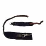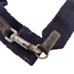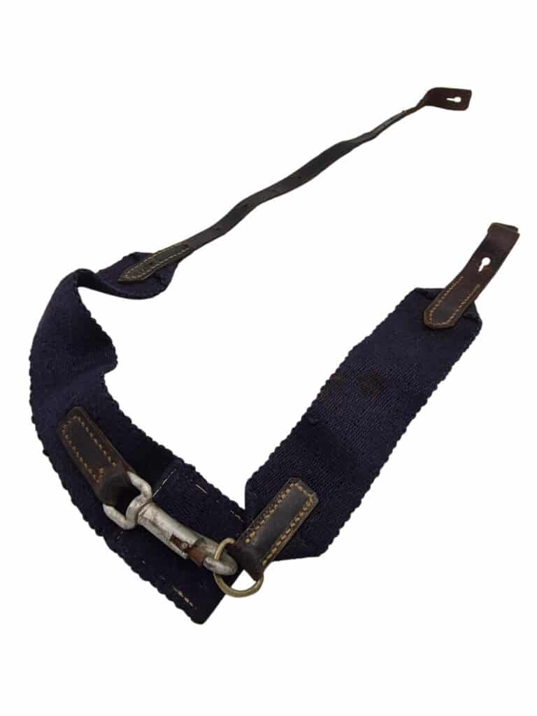 Nederlandse karabijnriem voor het M95 geweer. De riem is nog in een goede conditie maar mist alleen de bevestigingsknopen die door het leer heen gevoerd moeten worden. De riem is gemaakt van blauw canvas met in het midden een piston haak om de karabijn snel aan te kunnen leggen. De blauwe riemen werden bewezen gebruikt door de marechaussee echter zijn ze ook door andere eenheden in gebruik geweest. Niet zo zeldzaam als de groene variant maar een leuk alternatief voor de karabijn.