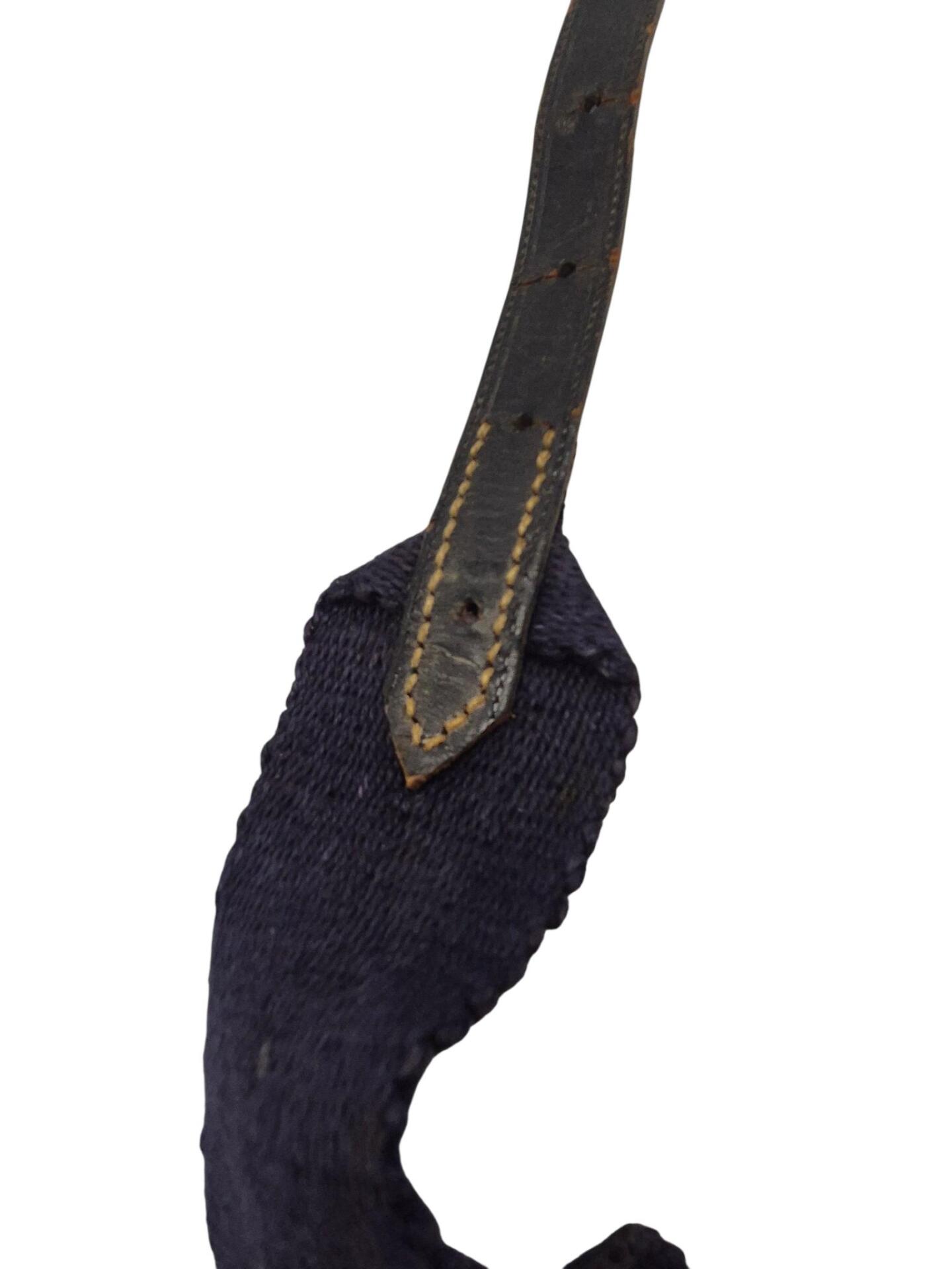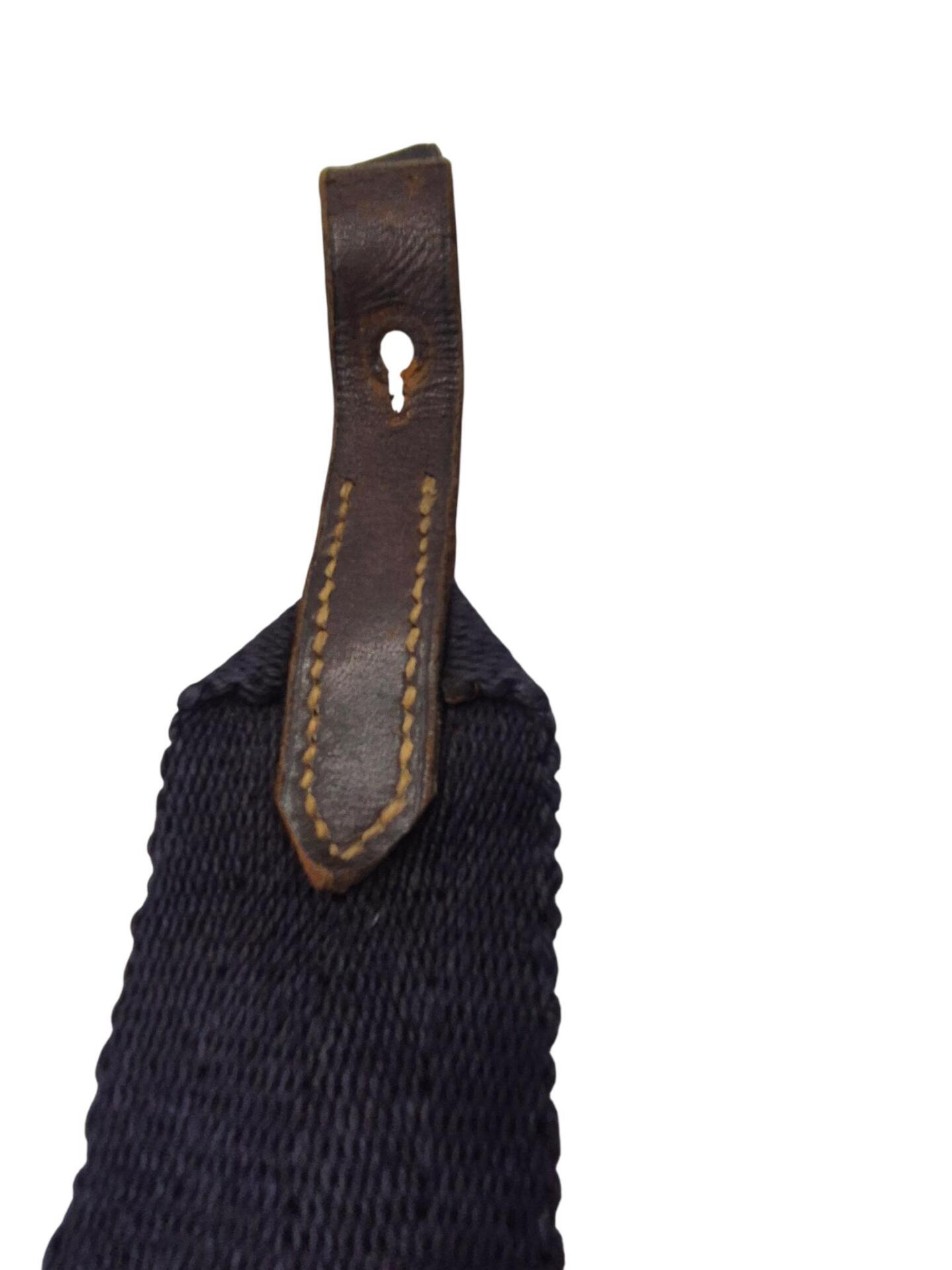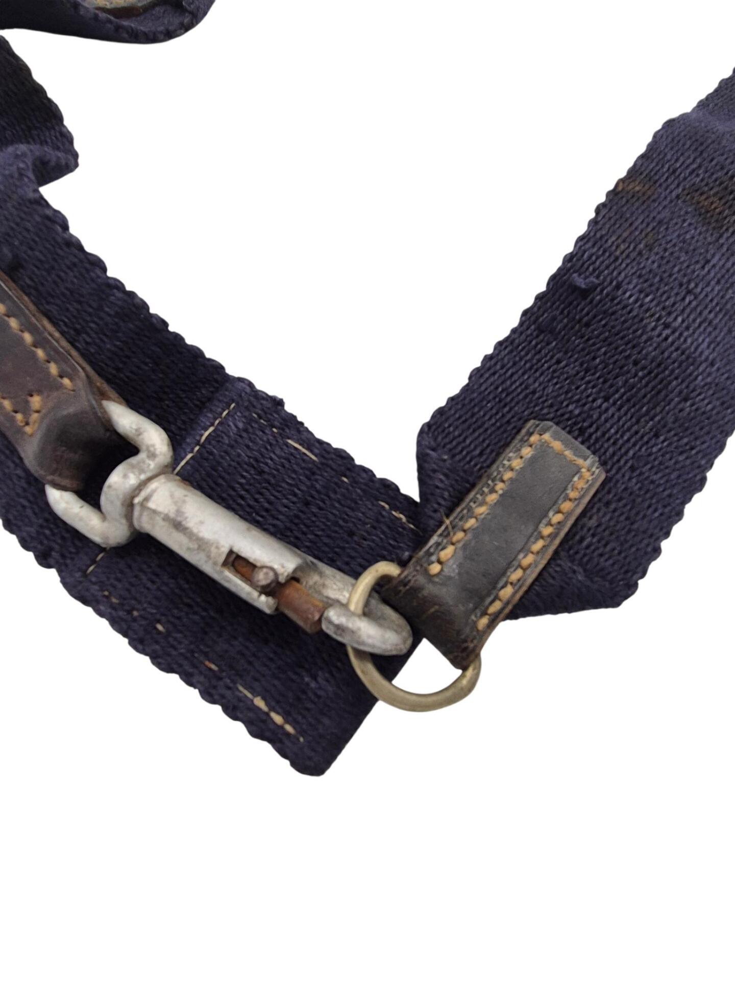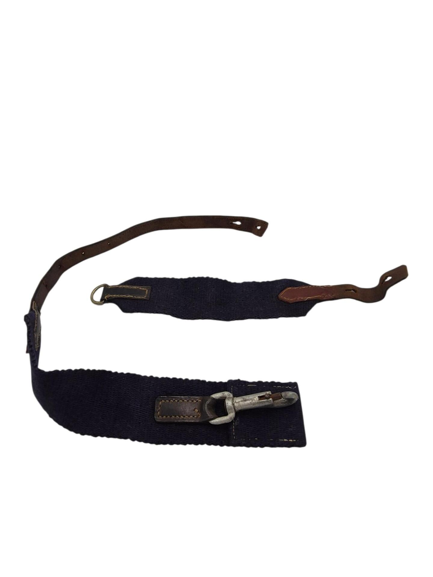 Nederlandse karabijnriem voor het M95 geweer. De riem is nog in een goede conditie maar mist alleen de bevestigingsknopen die door het leer heen gevoerd moeten worden. De riem is gemaakt van blauw canvas met in het midden een piston haak om de karabijn snel aan te kunnen leggen. De blauwe riemen werden bewezen gebruikt door de marechaussee echter zijn ze ook door andere eenheden in gebruik geweest. Niet zo zeldzaam als de groene variant maar een leuk alternatief voor de karabijn.