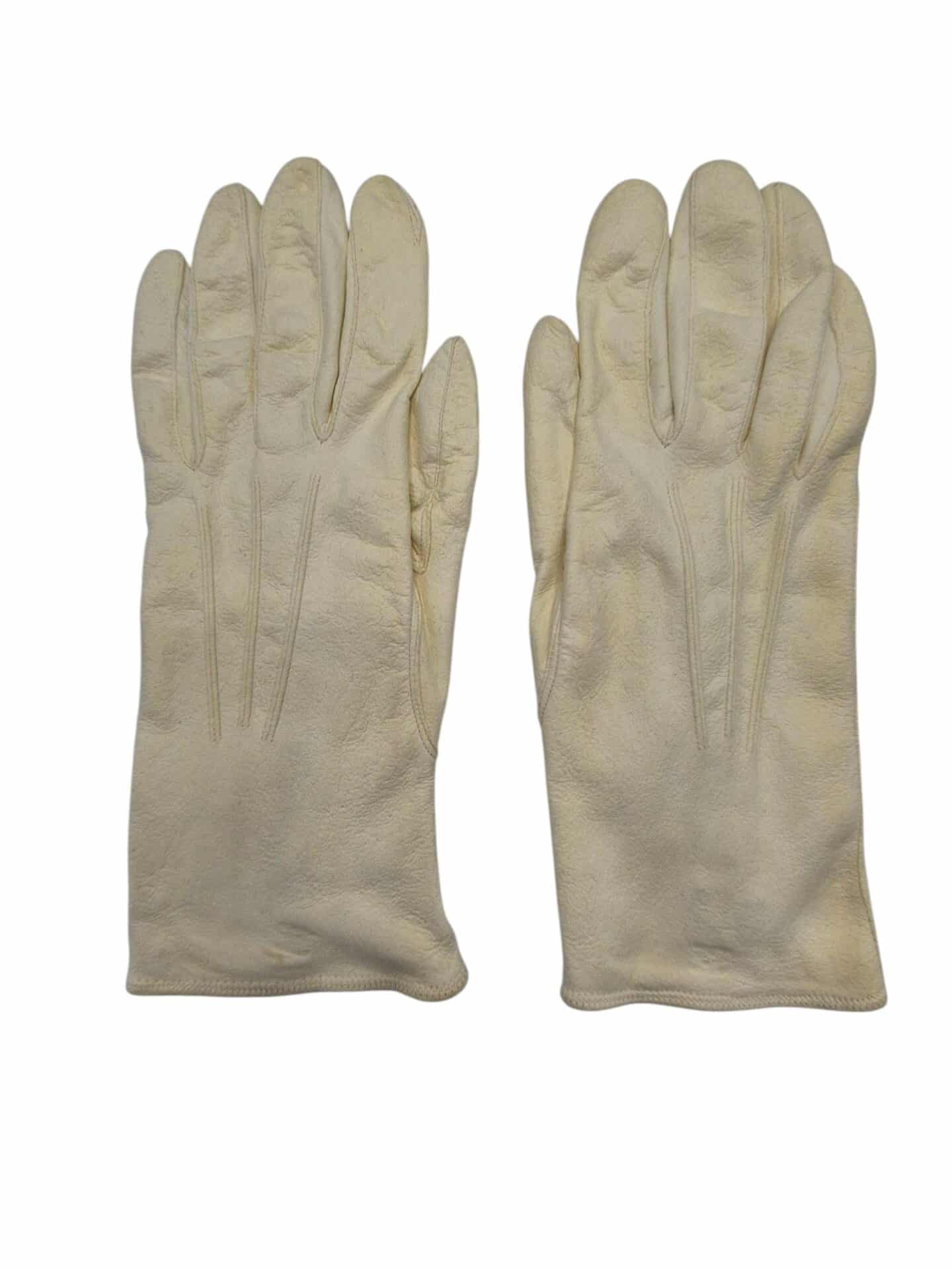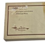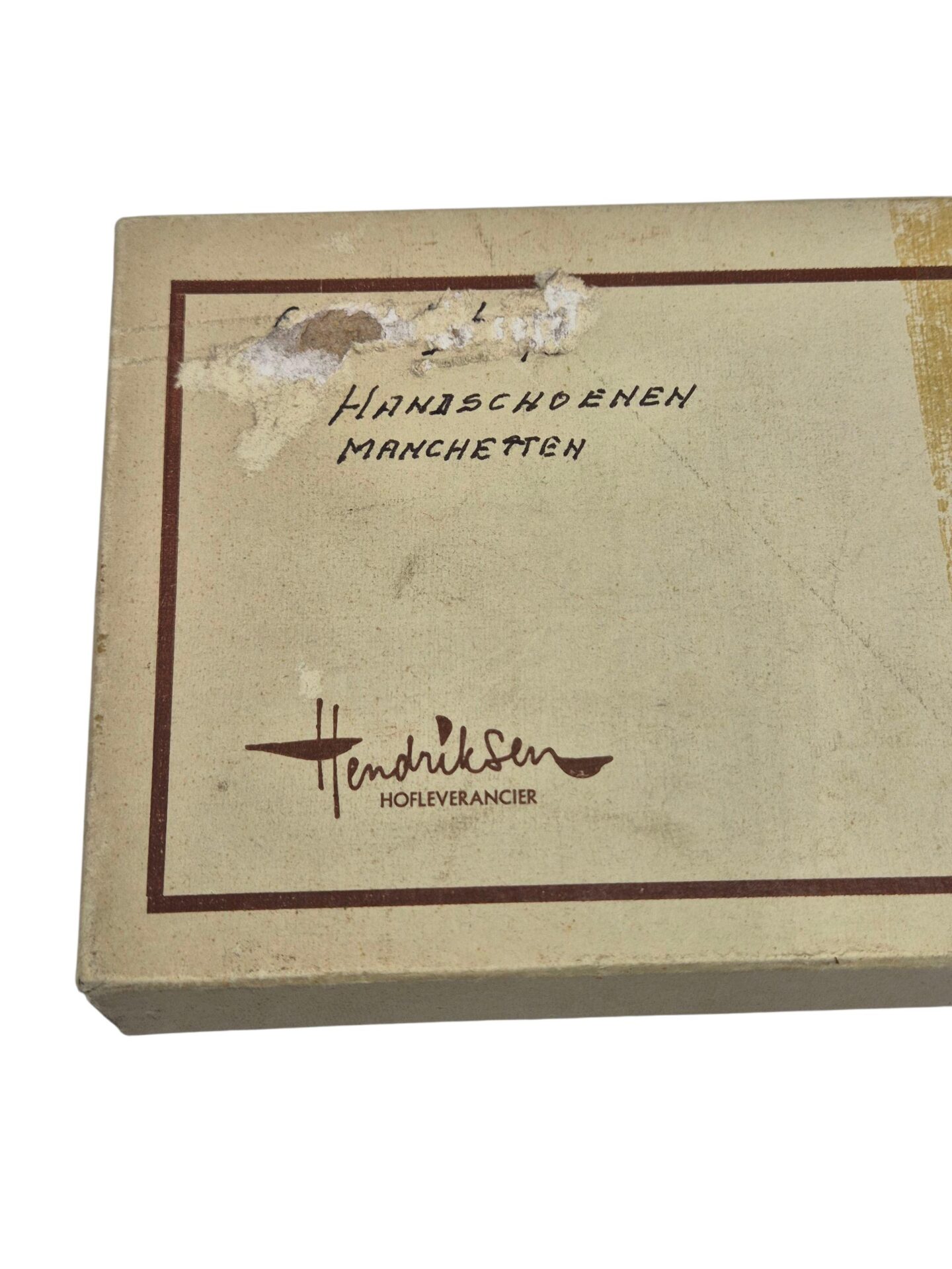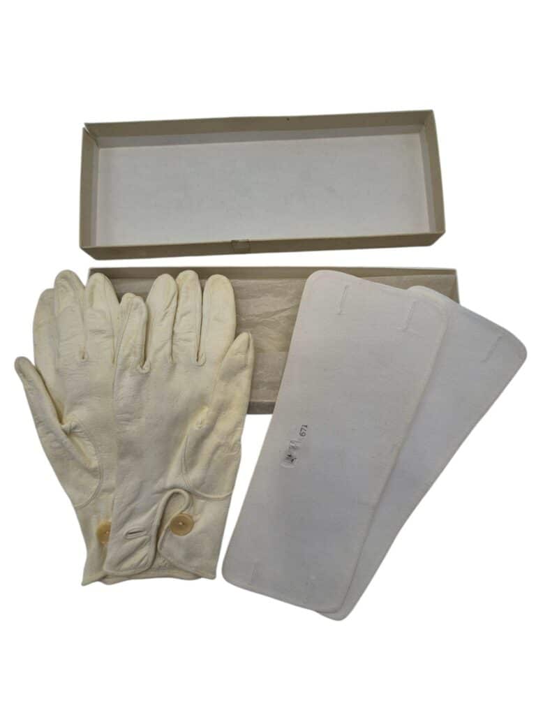 Mooi setje zeemleren handschoenen die gebruikt werden op het ceremoniële tenue en een setje manchetten voor in het overhemd, in het originele doosje. De naam aan de voorzijde is helaas verwijderd, gemaakt door Hendriksen hofleverancier.