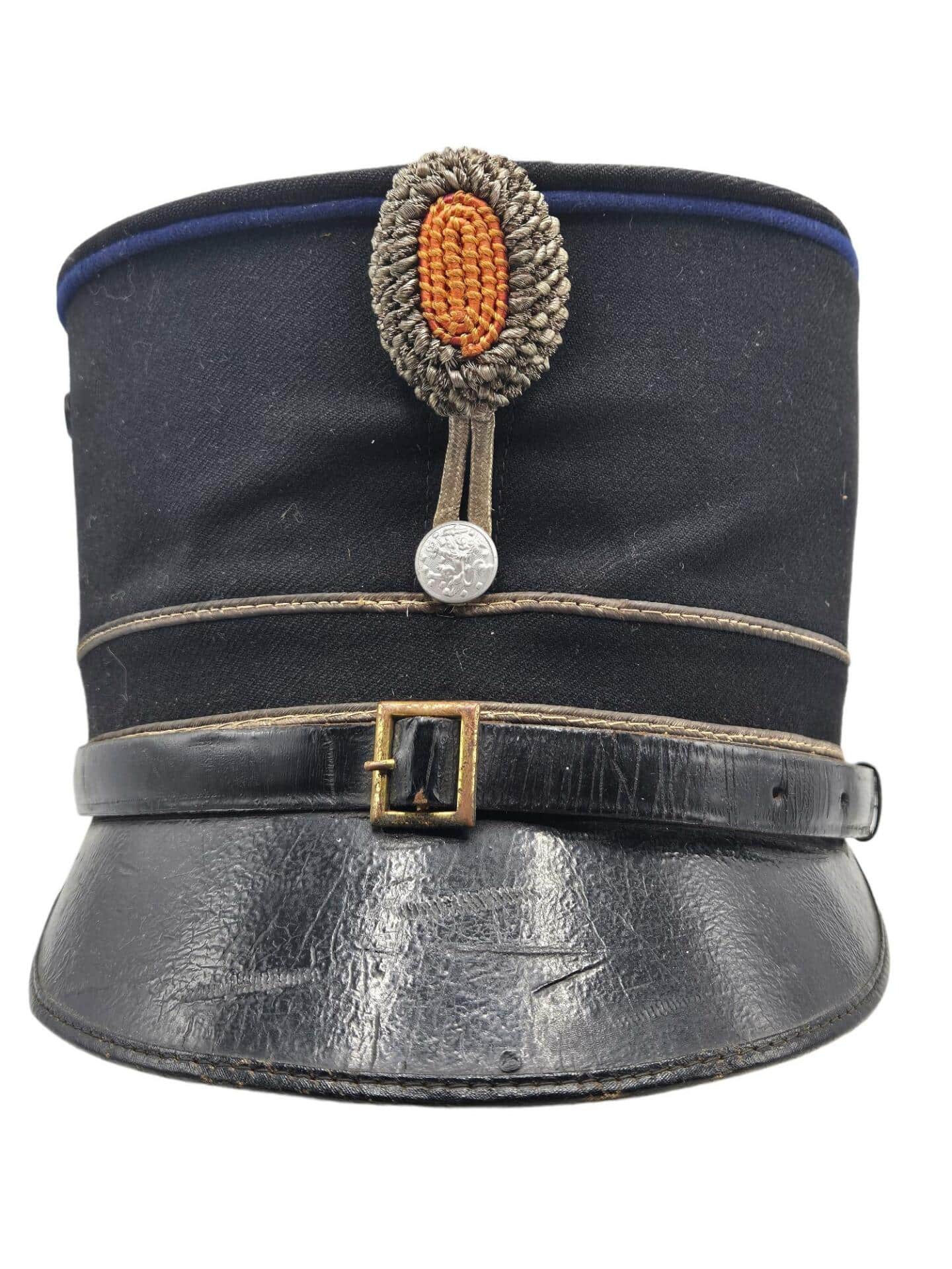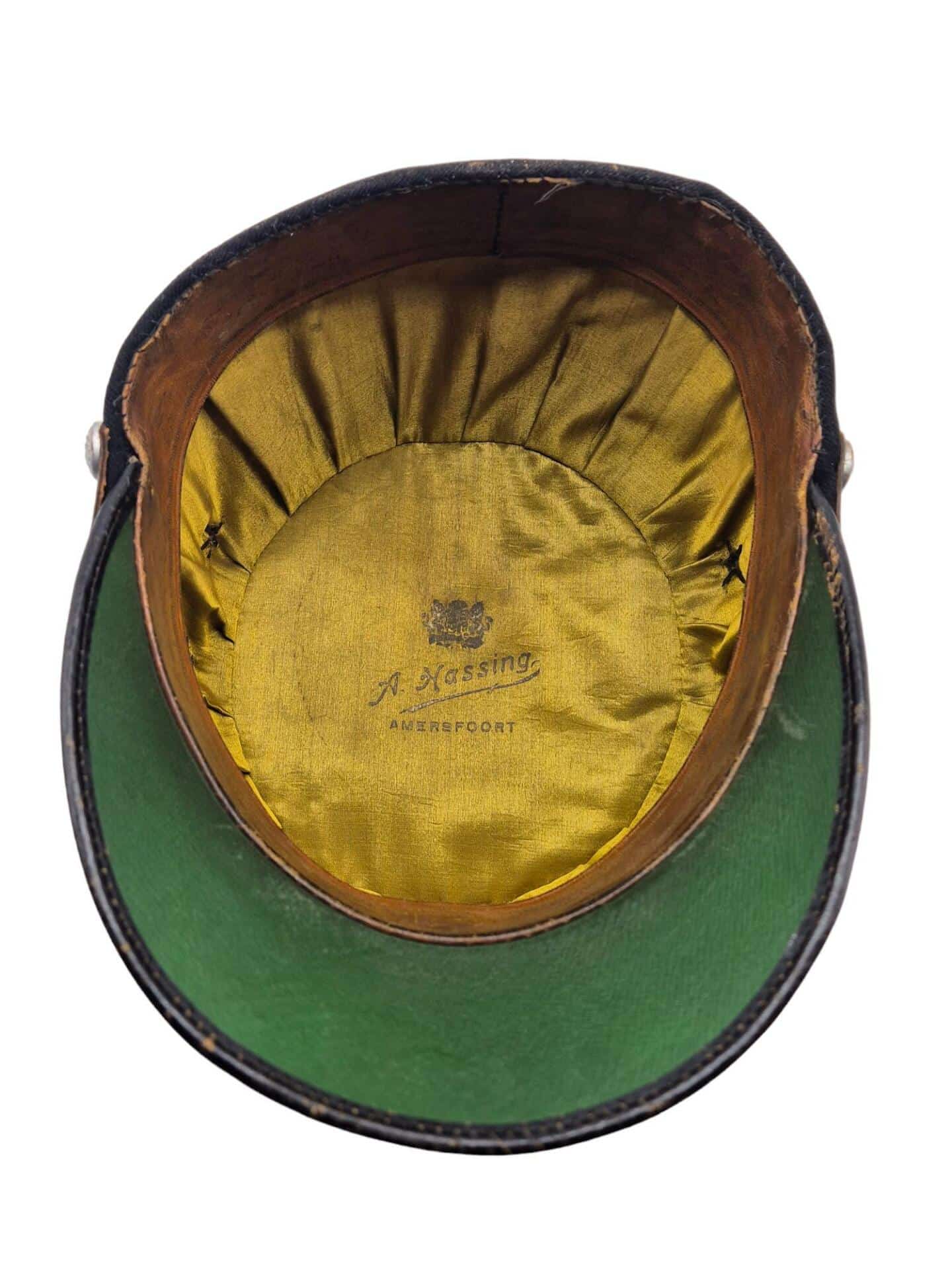 Prachtige Nederlandse kepie regiment van een der regimenten blauwe huzaren. De kepie verkeerd in een goede staat zonder motgaten met een kleine vervorming aan de voorzijde. De knoopjes zijn zilverkleurig en de kokarde is een zeer luxe model in zilverdraad. De kepie is in de zolder gemerkt Hassing Amersfoort wat een maker voor veel Cavalerie materiaal is geweest. Mooie kepie om een huzaar in Attila te completeren.