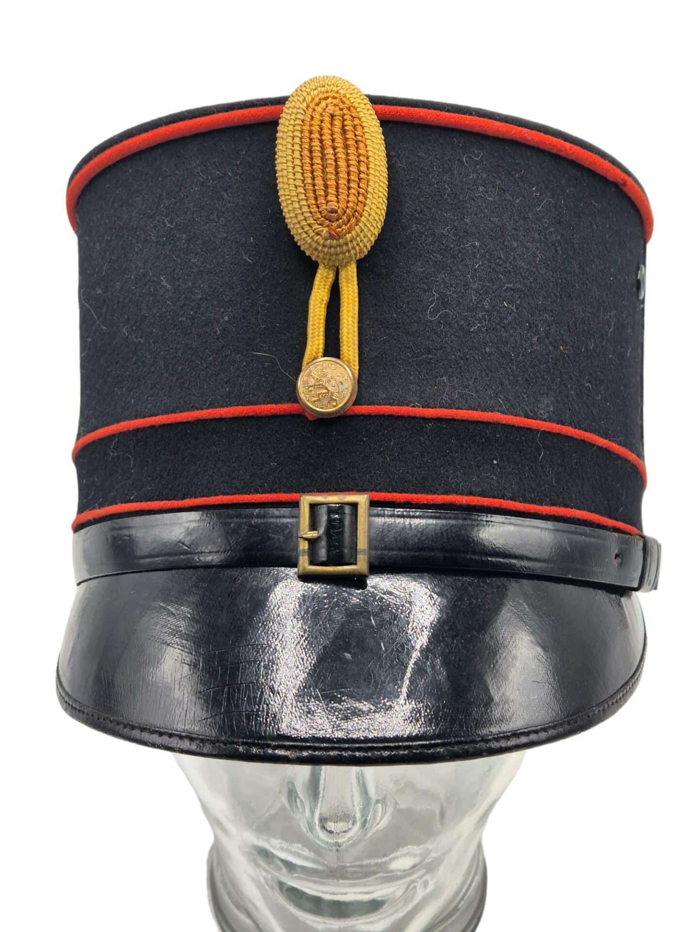 In zeer goede staat verkerende Nederlandse onderofficiers kepie voor op het ceremoniële pak. De kepie werd gedragen door een onderofficier ingedeeld bij een artillerie, grenadiers of pontonniers regiment. Dit is te zien aan de 2 rode biezen met de geel oranje kokarde . De zwart gelakte kinriem verkeerd ook in een zeer goede staat. De kepie heeft geen noemenswaardige beschadigingen. De zolder is mooi gemarkeerd HW Blomjous Den Haag Militaire equipementen.