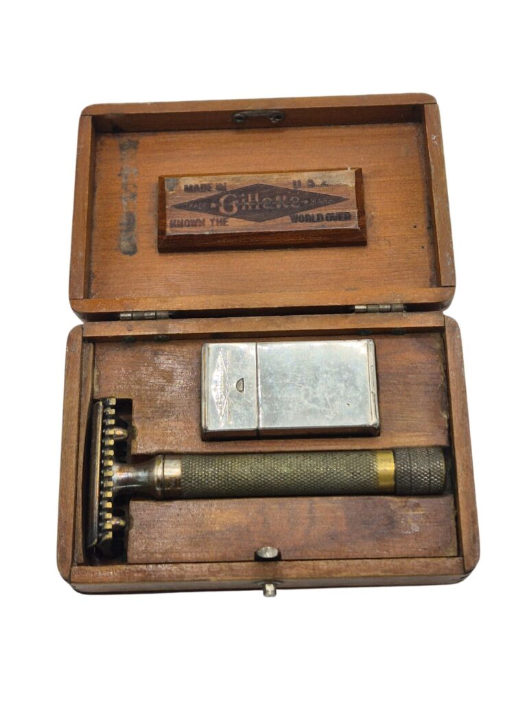 Very nice Gillette shaving set, the box contains a razor marked Gillette and a container with blades, bot the container and the blades are marked gillette. The set were used by officers during WW2. Great display piece.