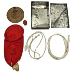 Complete set voor een Kolbak van een manschap der cavalerie. De set is compleet met de kolbakzak met witte bies en witte kwast. Een mooi gemarkeerde lederen zolder om de zak te bevestigen aan de Kolbak. De oranje manschappen kokarde, het pijnappelsnoer en het vangsnoer mooi gemarkeerd. De gehele set zit in het originele verzinkte opbergblik.