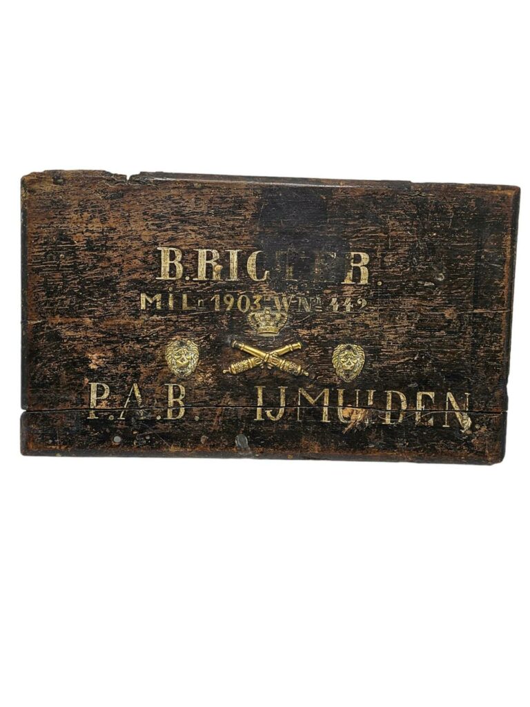 Prachtige deksel van een manschappen kist van het pantserfort IJmuiden. De deksel is prachtig beschilderd en voorzien van het beslag van een giberne tas. De deksel is een keer gerepareerd en aan de achterzijde kennelijk als paneel gebruikt door een schilder. Zeer decoratief item van een zeldzame Nederlandse eenheid.