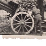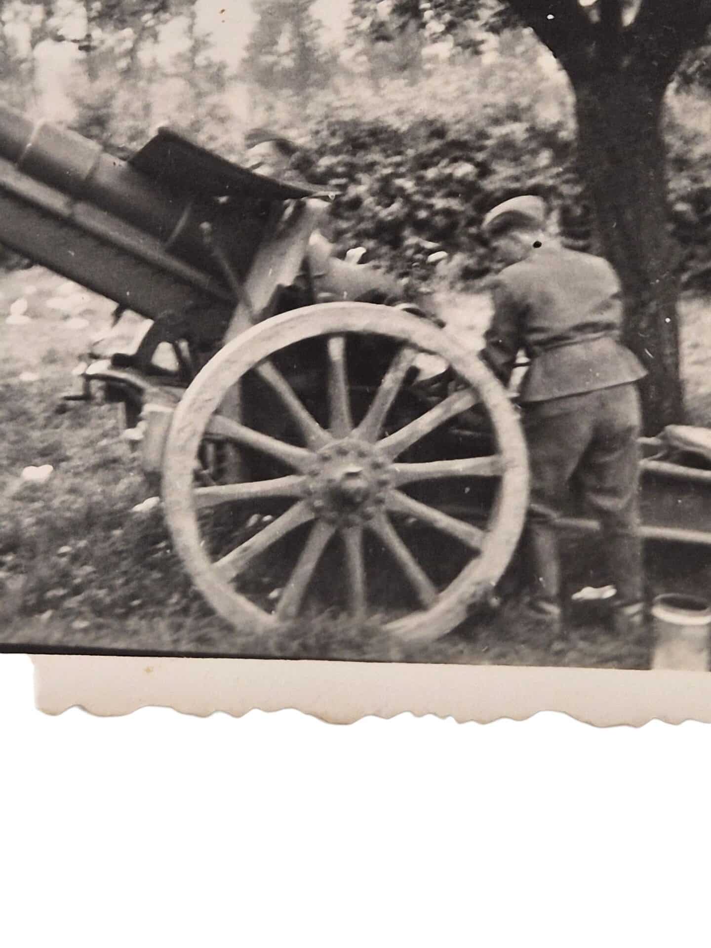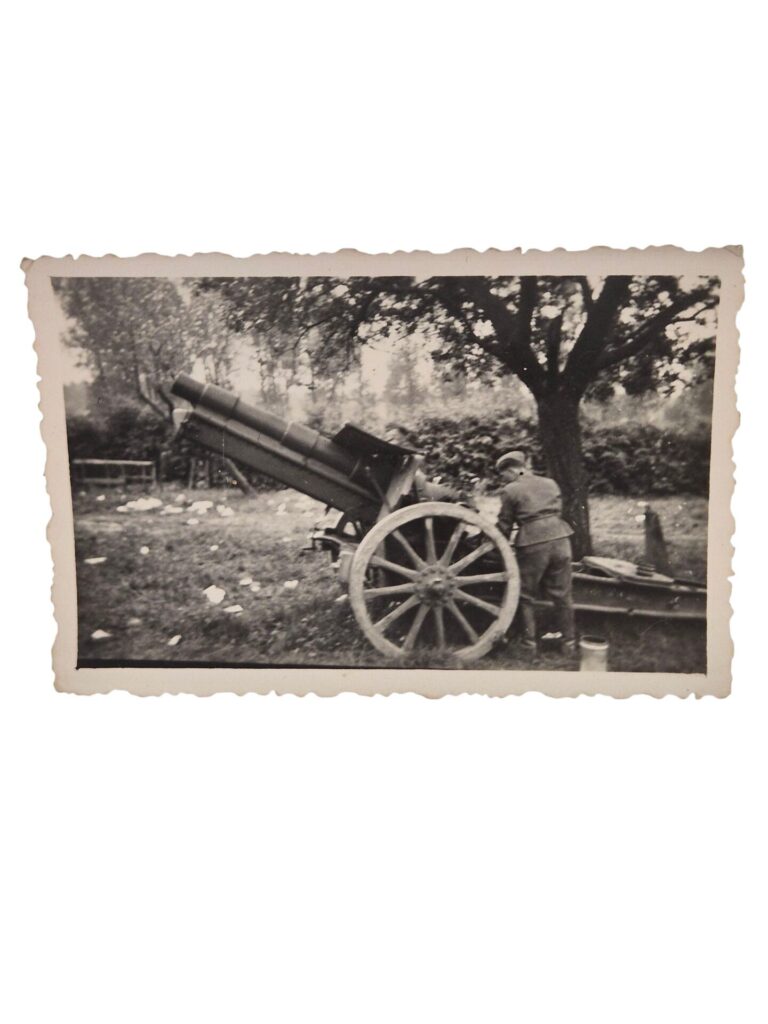 Originele foto van een Duitse soldaat die een buitgemaakt Nederlands stuk geschut inspecteert. Het model lijkt op een Houwitser. Helaas is de foto niet beschreven maar moet wel in de meidagen 1940 zijn genomen.