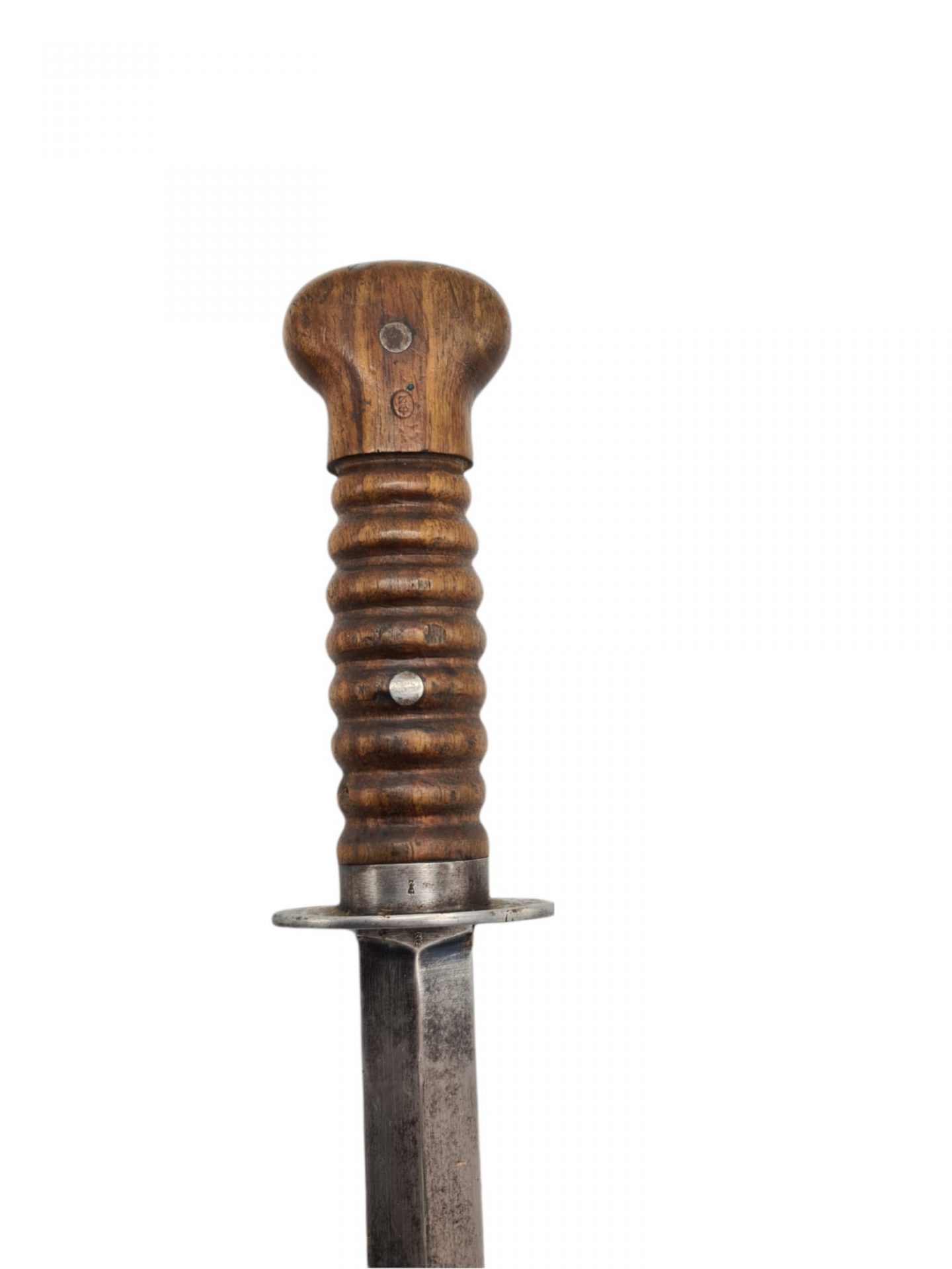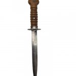 Nederlandse M.1917 stormdolk, 1e model. De stormdolk werd ontwikkeld en gemaakt tijdens de eerste wereldoorlog maar nauwelijks gebruikt. Tijdens de mobilisatie voor de tweede wereldoorlog werden de stormdolken weer aan de troepen uitgereikt. Het gaat om een 1e model schede, omdat het sluitleertje ontbreekt. In het veld vielen de dolken nogal eens uit de schedes en daarom werden latere aanmaken voorzien van een sluitleertje. De schede is gemarkeerd met nummer 3414 A, dus een aanmaak uit de eerste serie. De dolk zelf is voorzien van meerdere nummers en heeft serie nummer 8098 E.