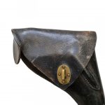 Dutch M-1873 revolver holster. The holster is made from brown blackened leather and is still in a good condition. On the inside is the pouch for the screwdriver. The wear marks of this tool can still be seen in the leather. The holster is nicely marked CM1933. A very nice exemple of a Dutch Hembrug M-73 revolver holster!