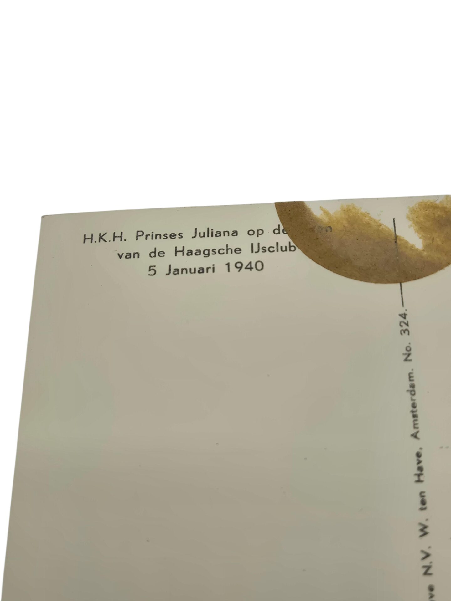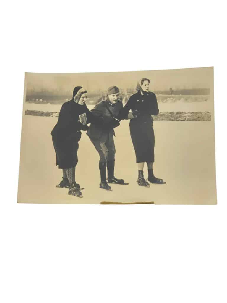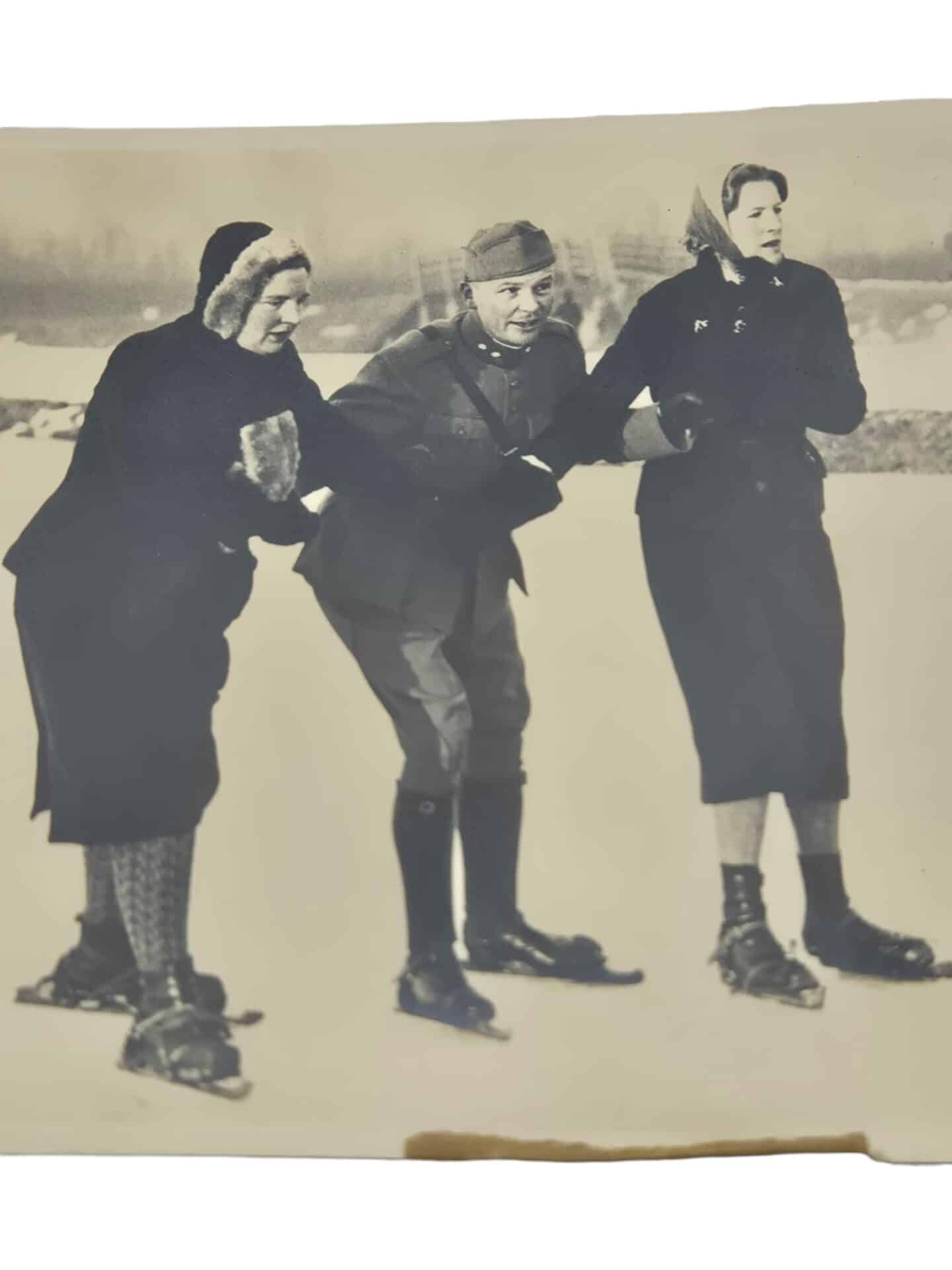 Foto ansichtkaart van Juliana met een Nederlandse officier op het ijs van de Haagsche Ijsclub 5 januari 1940