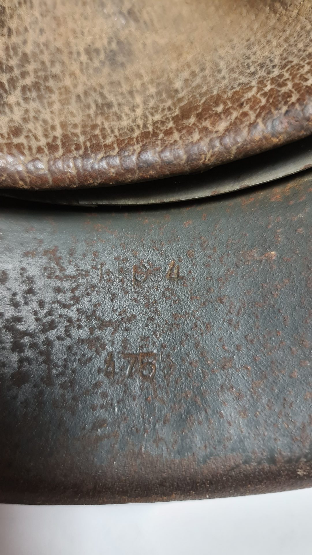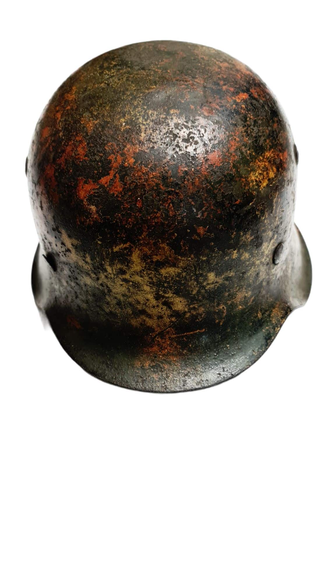 Duitse M42 3 tone camouflage helm. De kleuren zijn nog duidelijk zichtbaar, rood, groen en geel. Het binnenwerk is wat droog maar zit nog origineel in de helm. Wij hebben niks aan de helm gedaan, en hebben hem zo gelaten zoals wij hem gevonden hebben. De kinriem is gedeeltijke afgescheurd omdat het leer erg droog is. De kinriem zou eventueel vervangen kunnen worden. Mooie Duitse M42 3 tone camouflage helm!