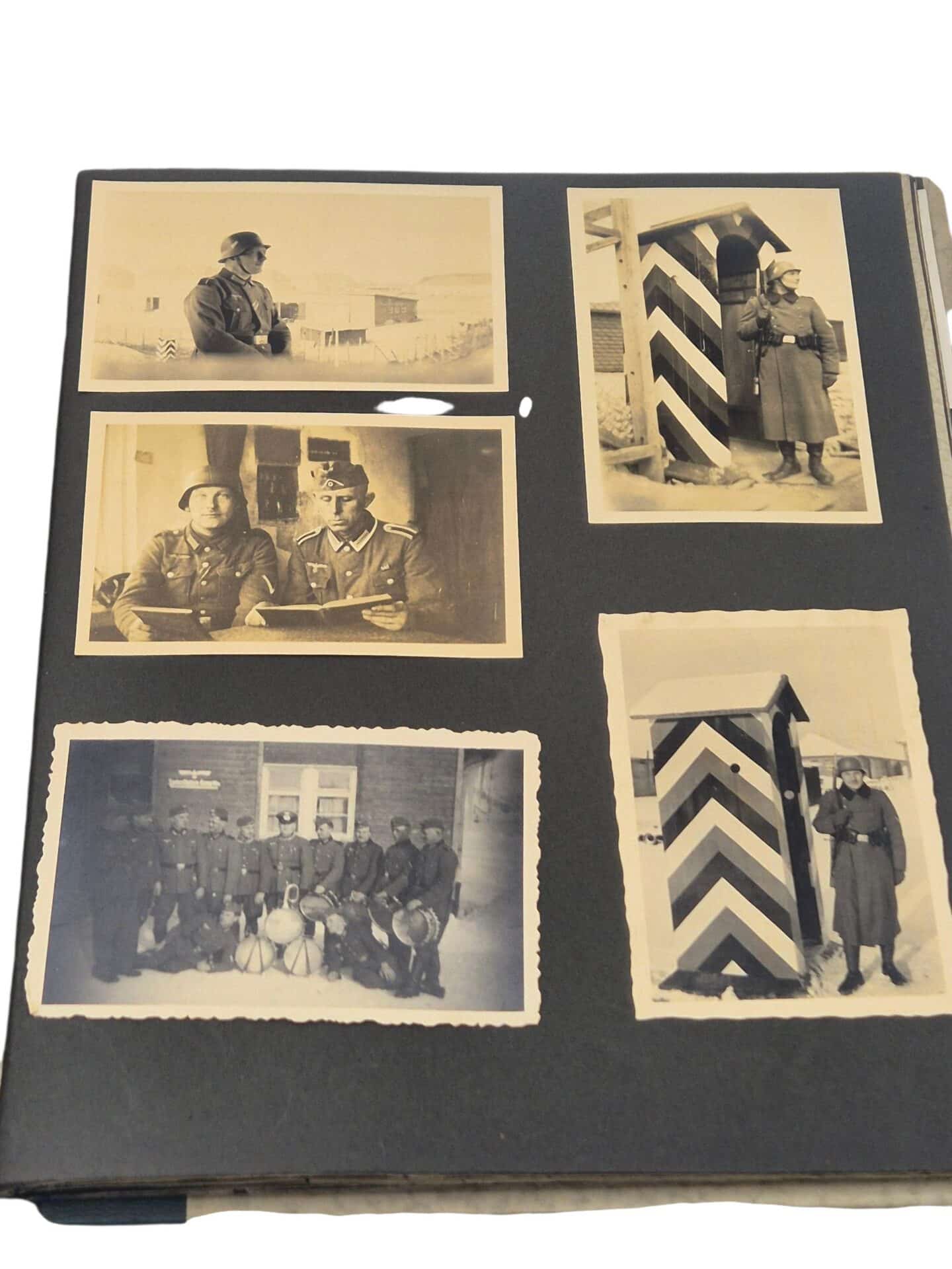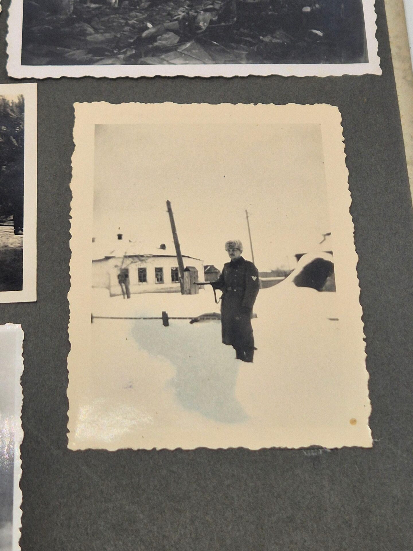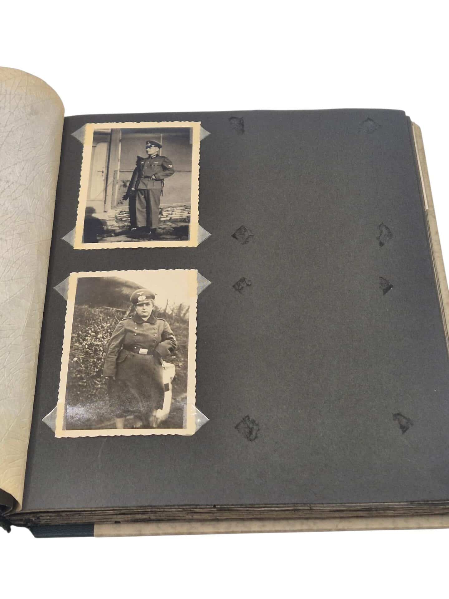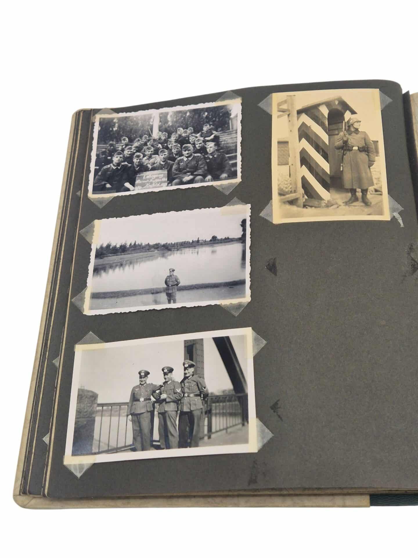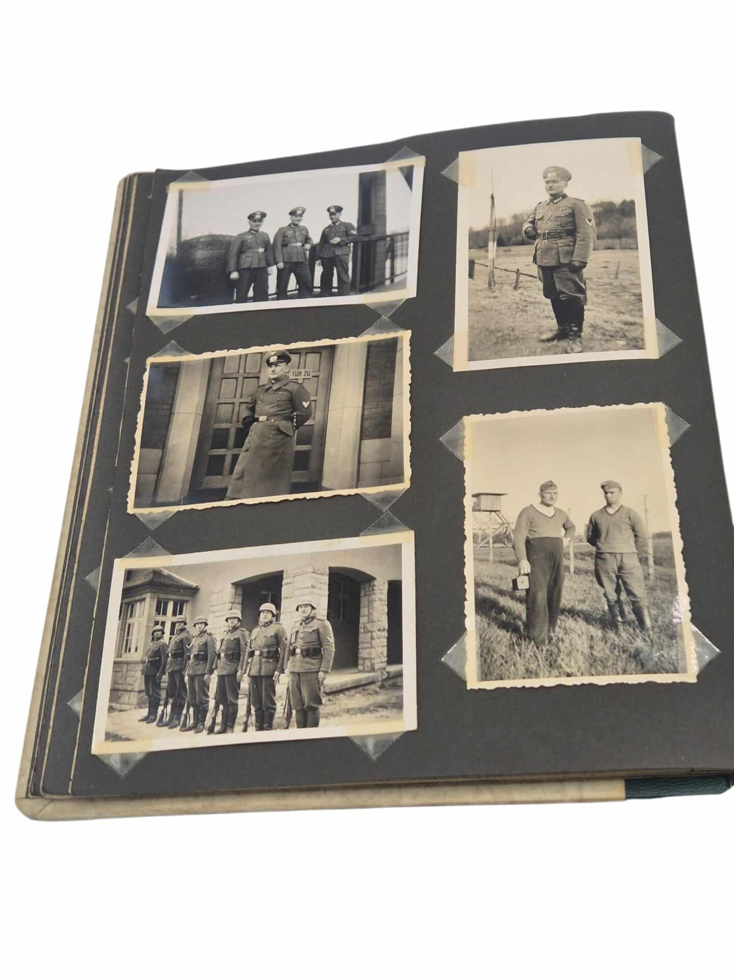 German WW2 photoalbum consisting of 161 pictures, the album is almost complete, some missing pictures. A lof of military pictures. The album starts with some WW1 pictures with pickelhaube. And conitnues with the WW2 in the rest of the album. Guard duty in snowy conditions. Military training, free time, burial etc.