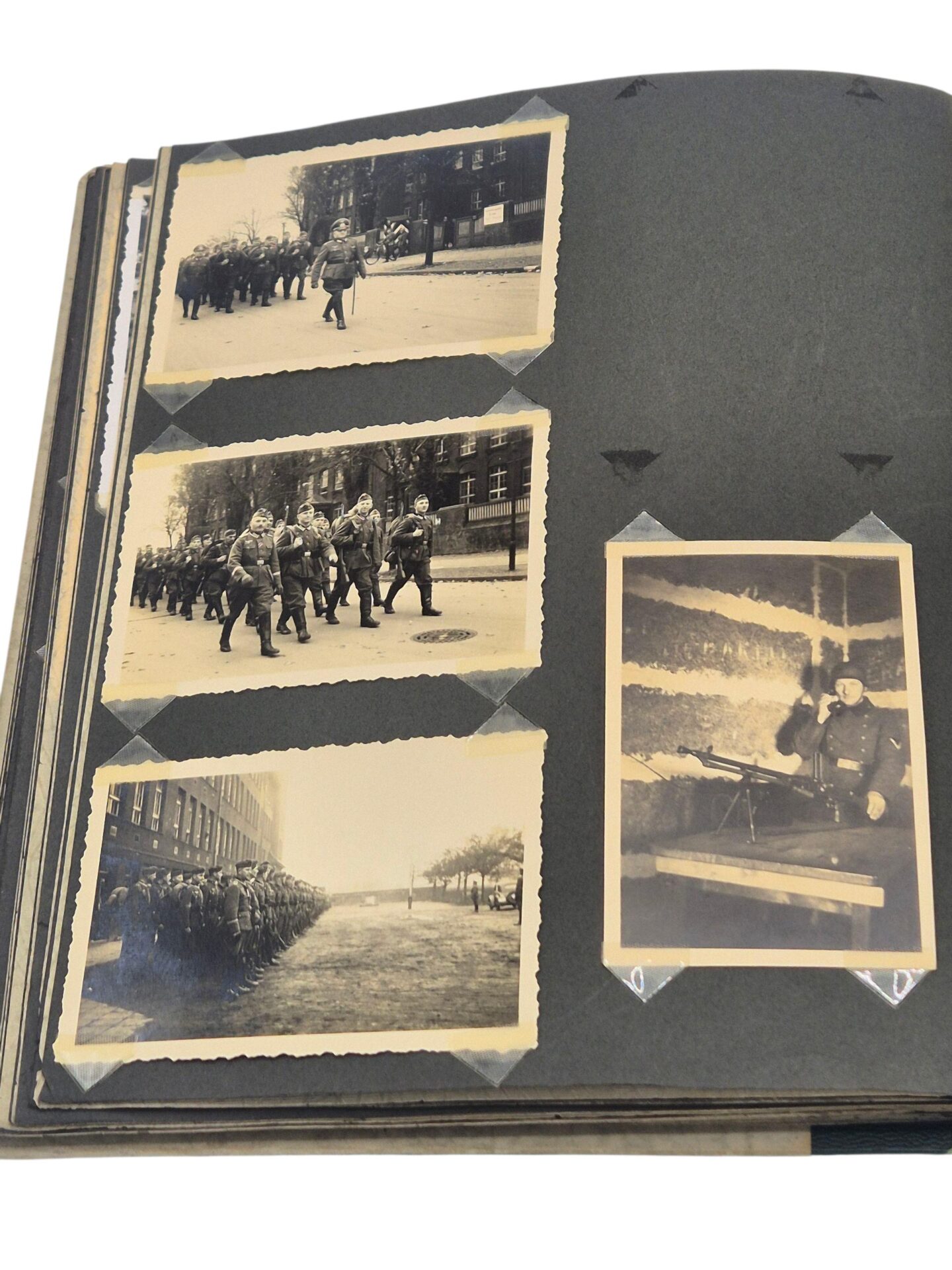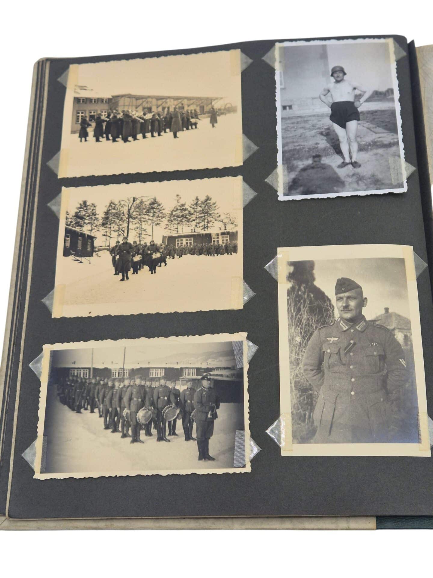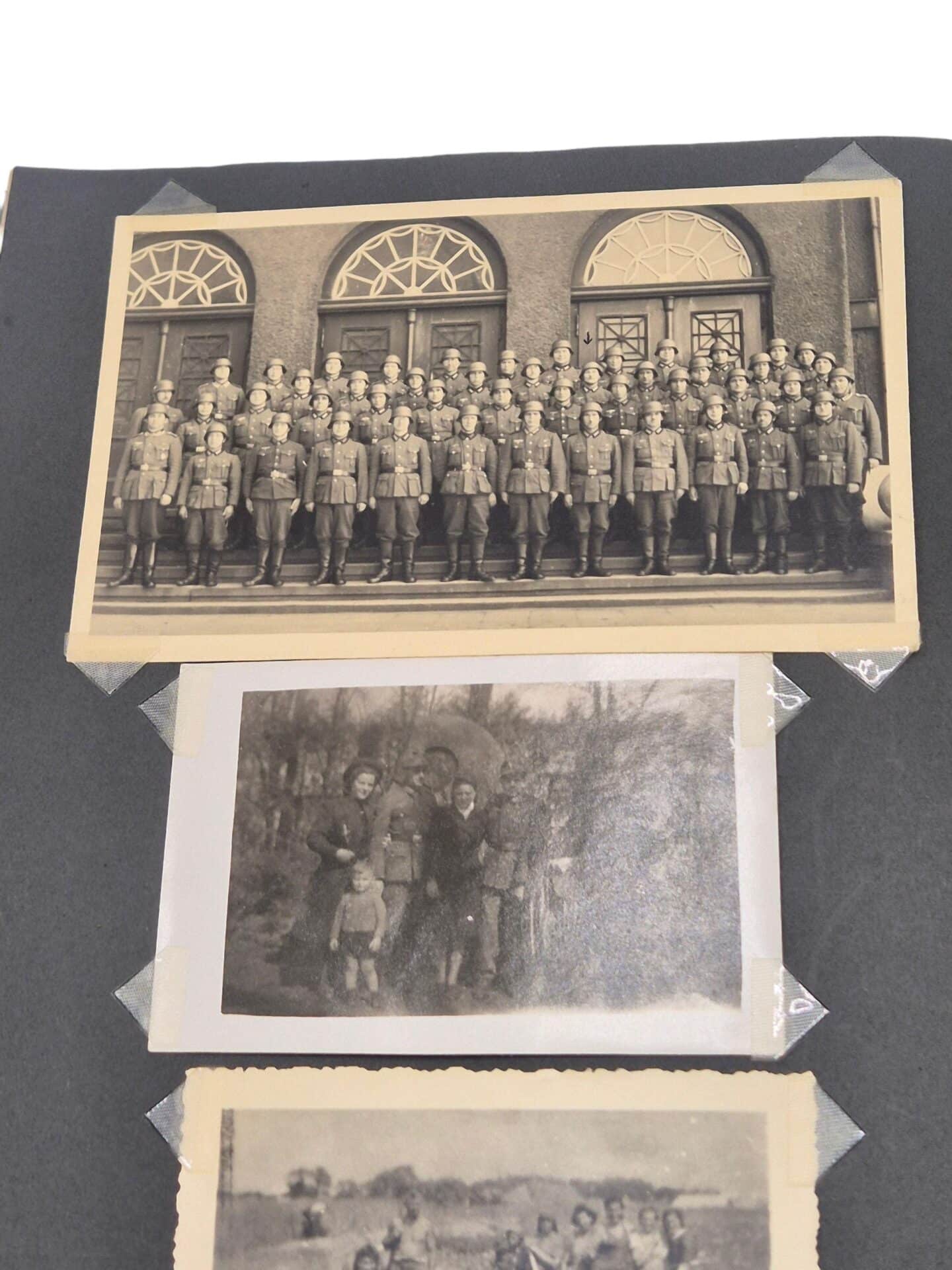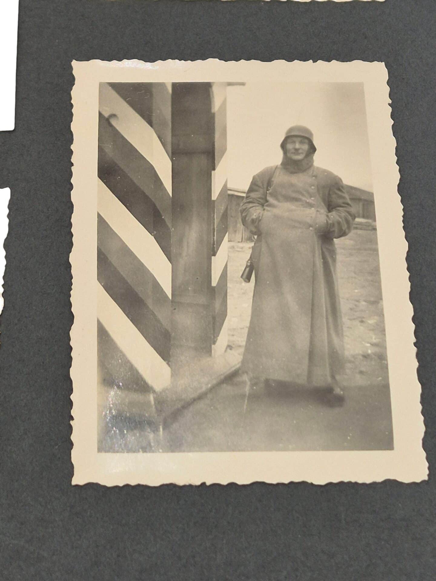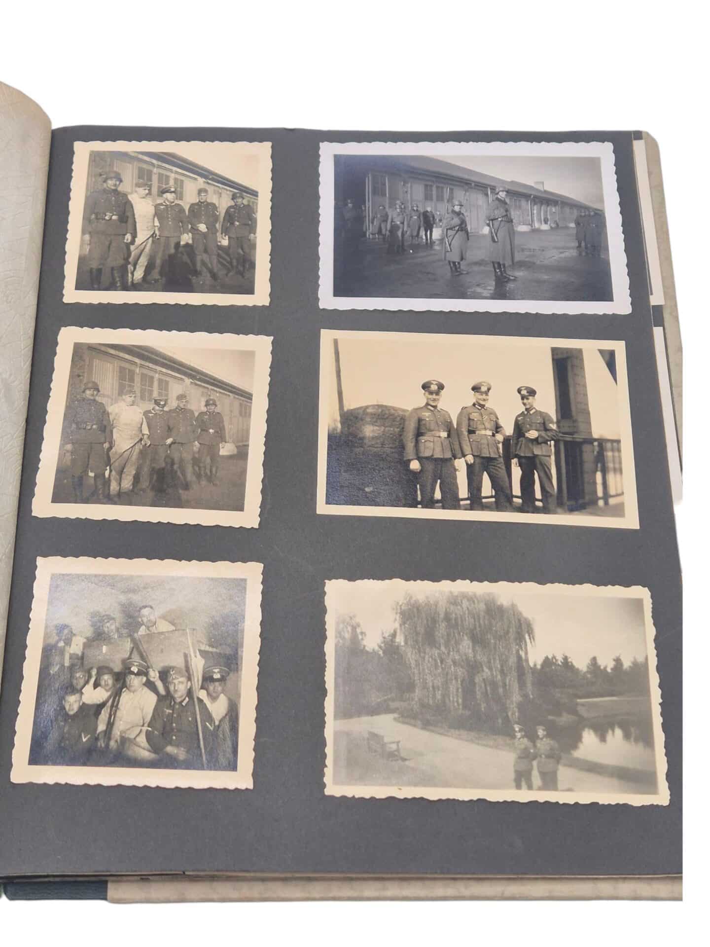 German WW2 photoalbum consisting of 161 pictures, the album is almost complete, some missing pictures. A lof of military pictures. The album starts with some WW1 pictures with pickelhaube. And conitnues with the WW2 in the rest of the album. Guard duty in snowy conditions. Military training, free time, burial etc.