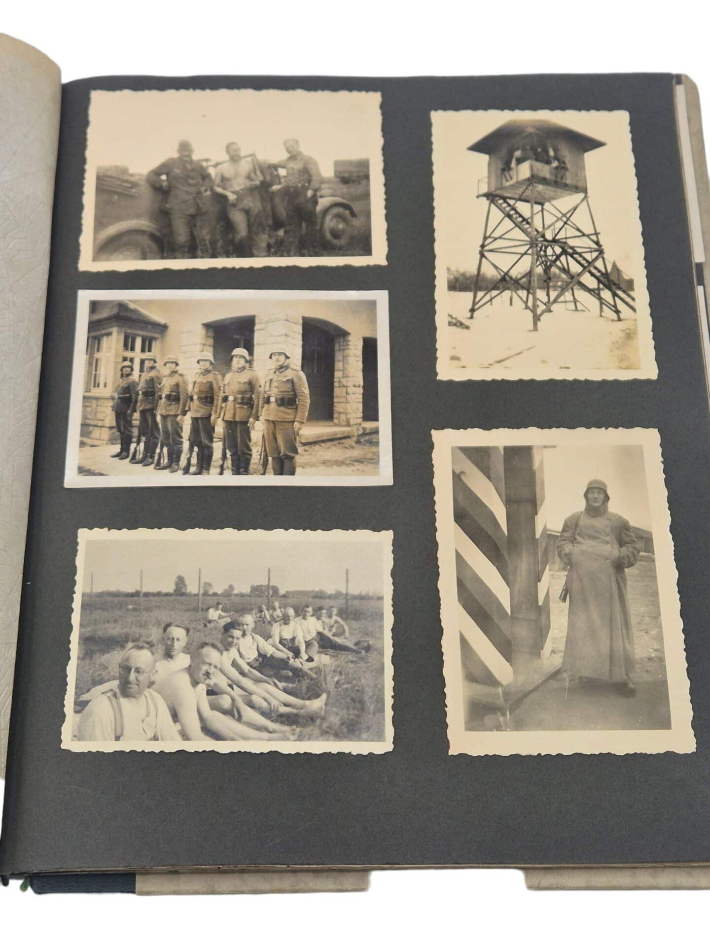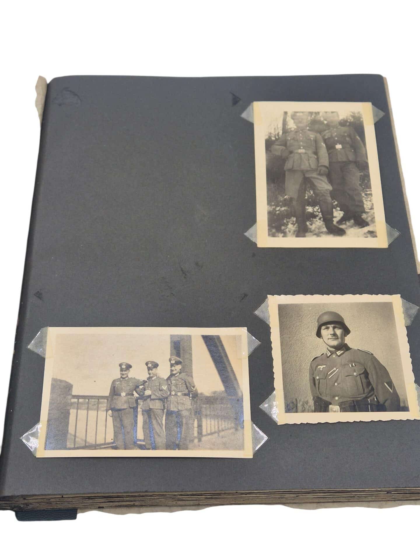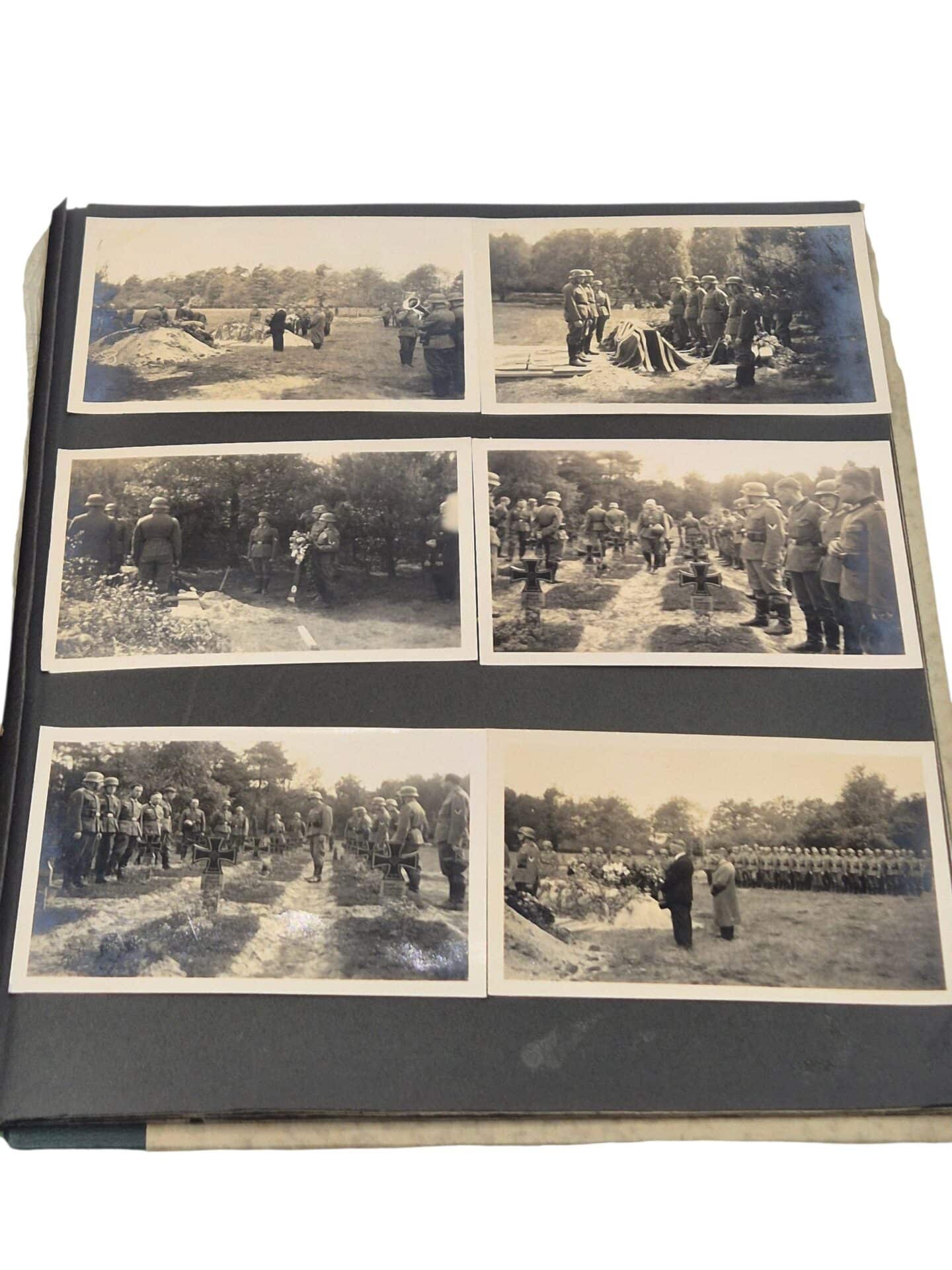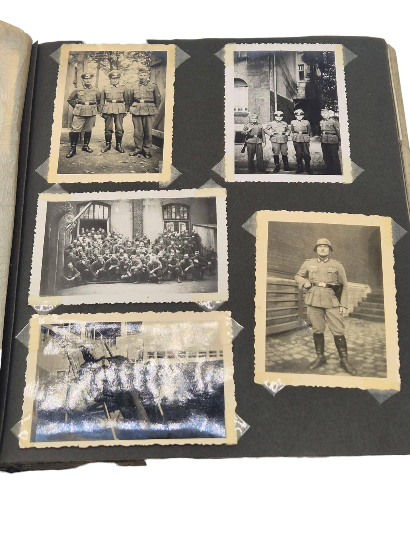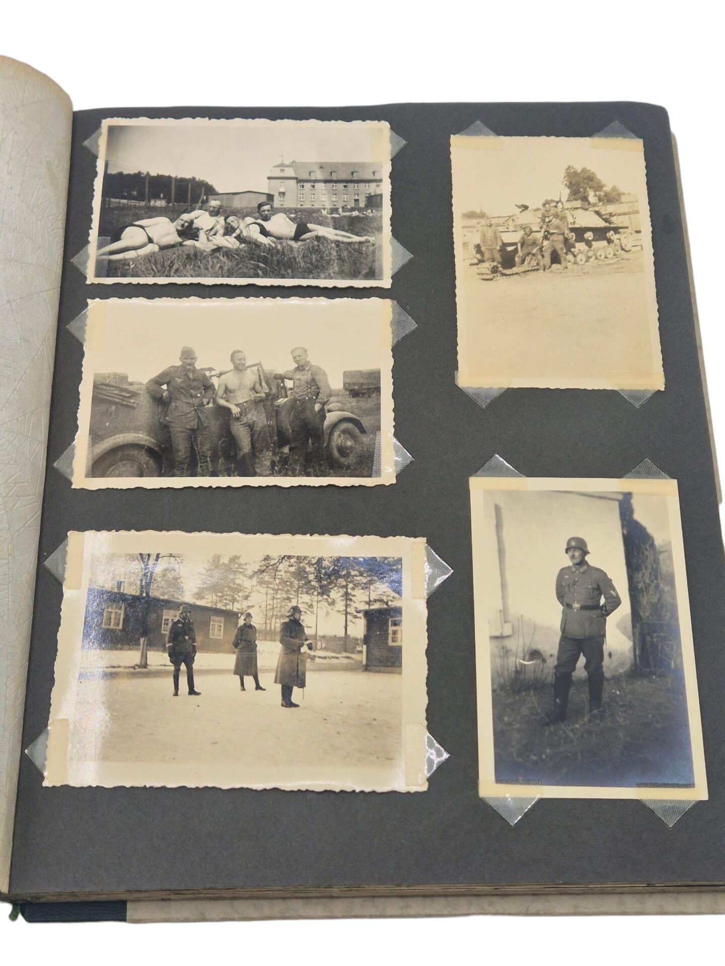 German WW2 photoalbum consisting of 161 pictures, the album is almost complete, some missing pictures. A lof of military pictures. The album starts with some WW1 pictures with pickelhaube. And conitnues with the WW2 in the rest of the album. Guard duty in snowy conditions. Military training, free time, burial etc.