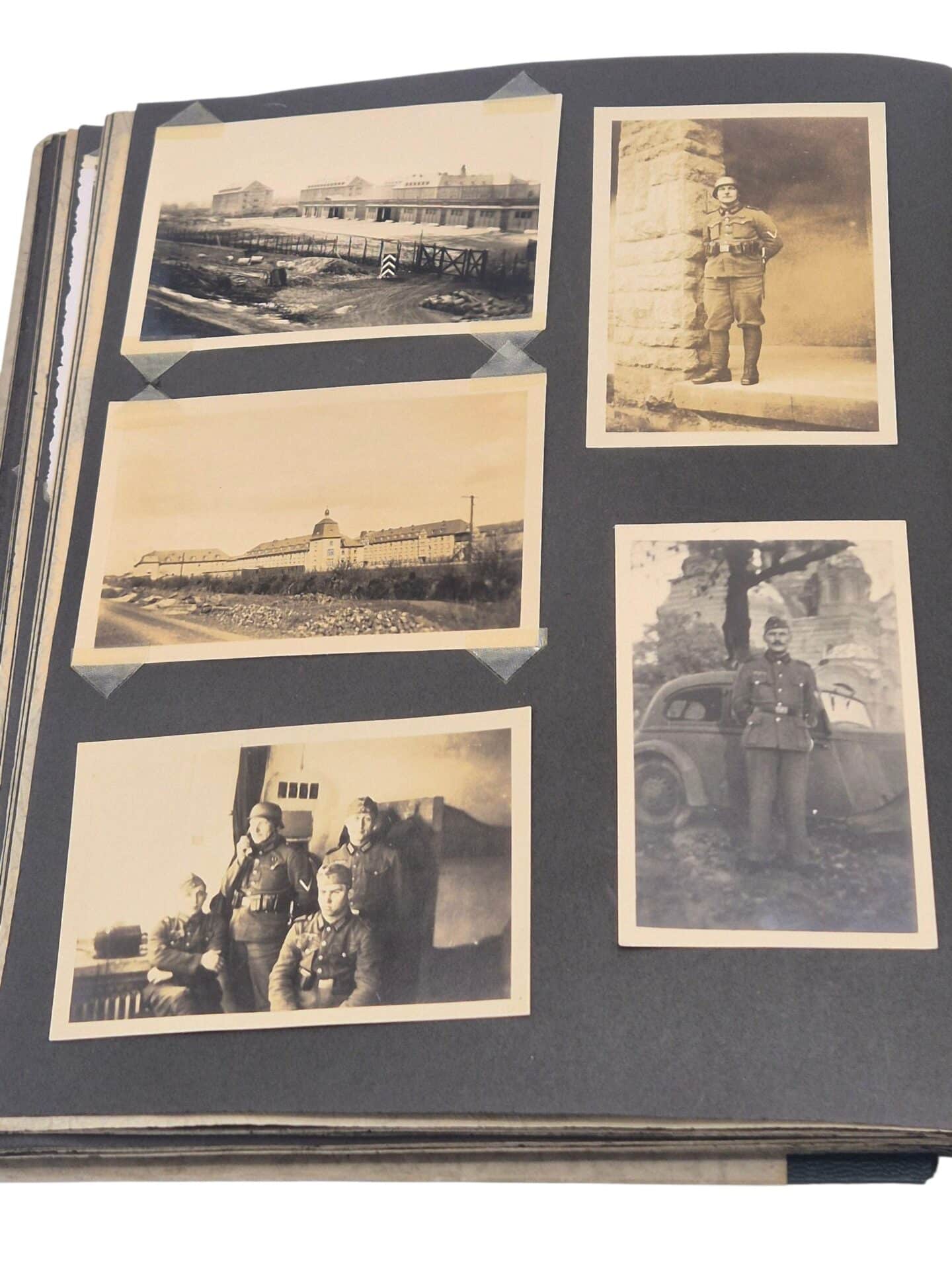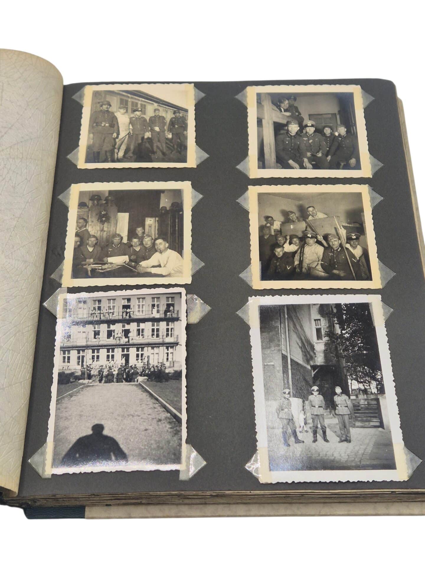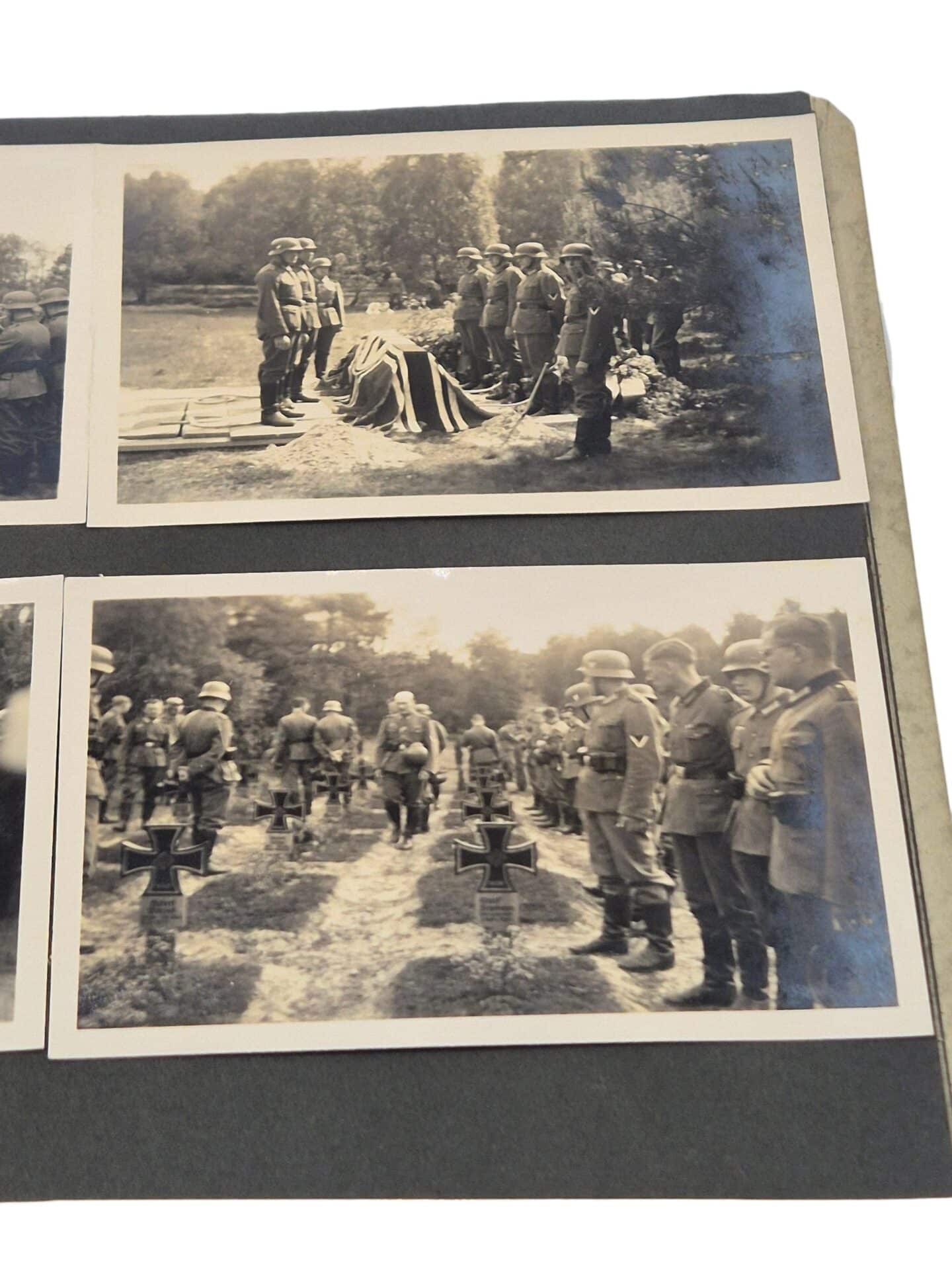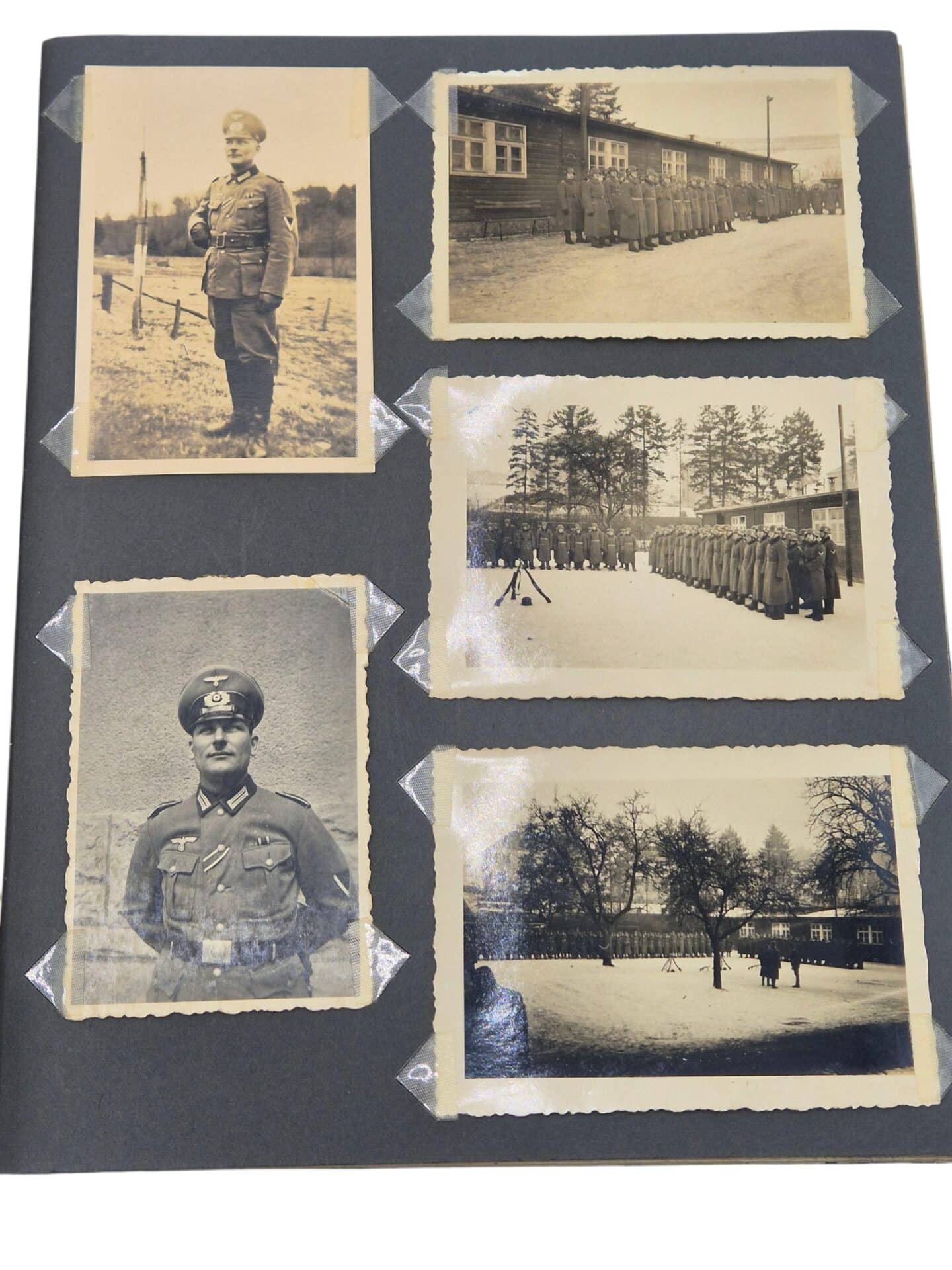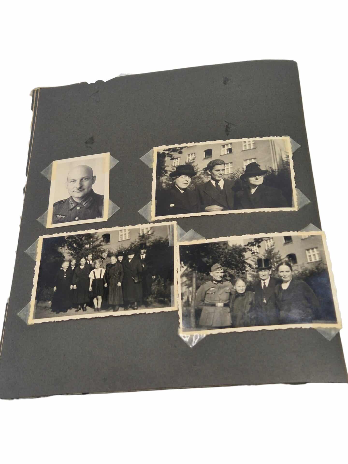 German WW2 photoalbum consisting of 161 pictures, the album is almost complete, some missing pictures. A lof of military pictures. The album starts with some WW1 pictures with pickelhaube. And conitnues with the WW2 in the rest of the album. Guard duty in snowy conditions. Military training, free time, burial etc.