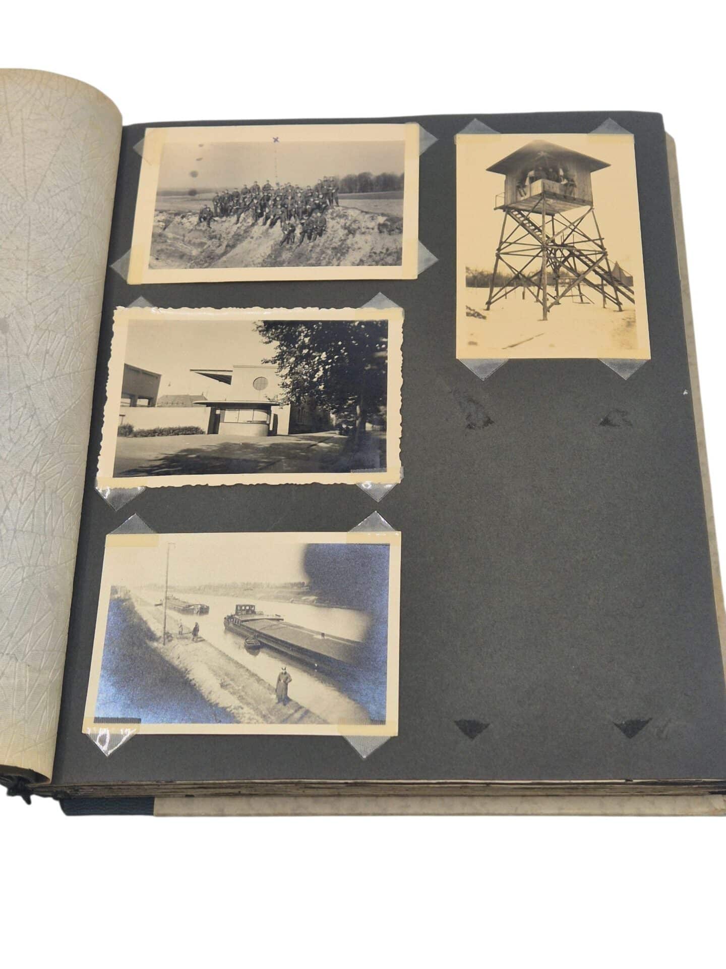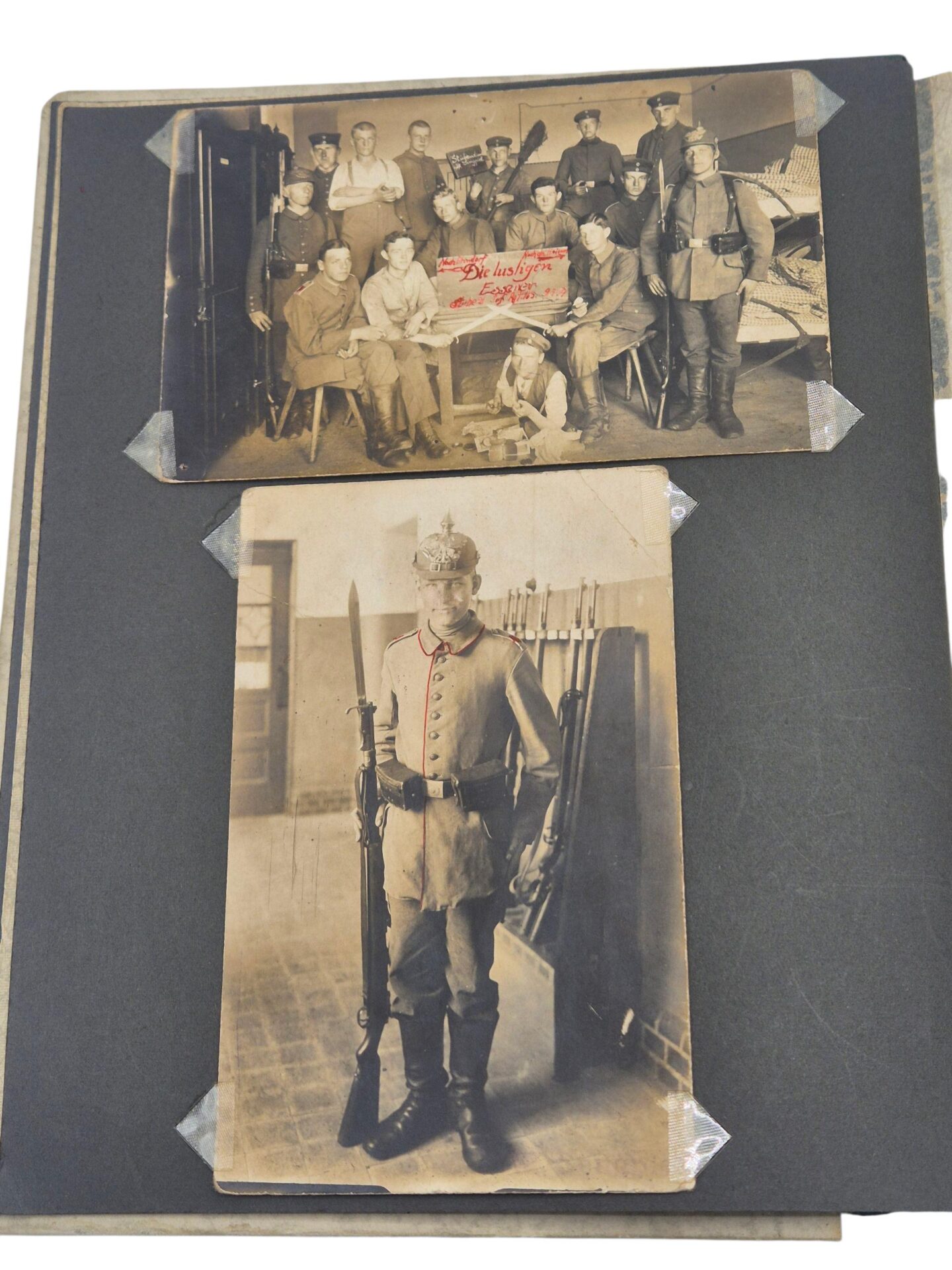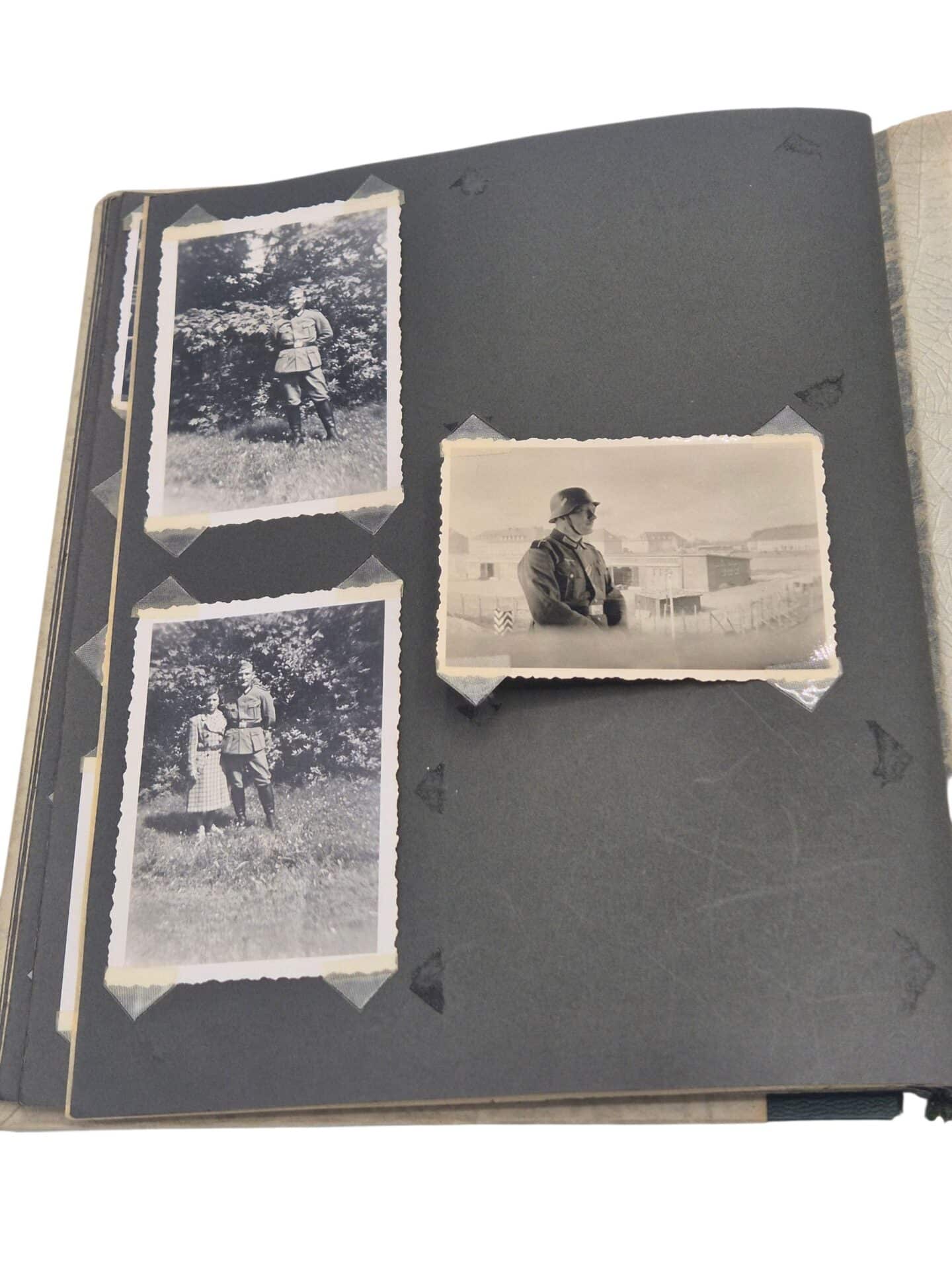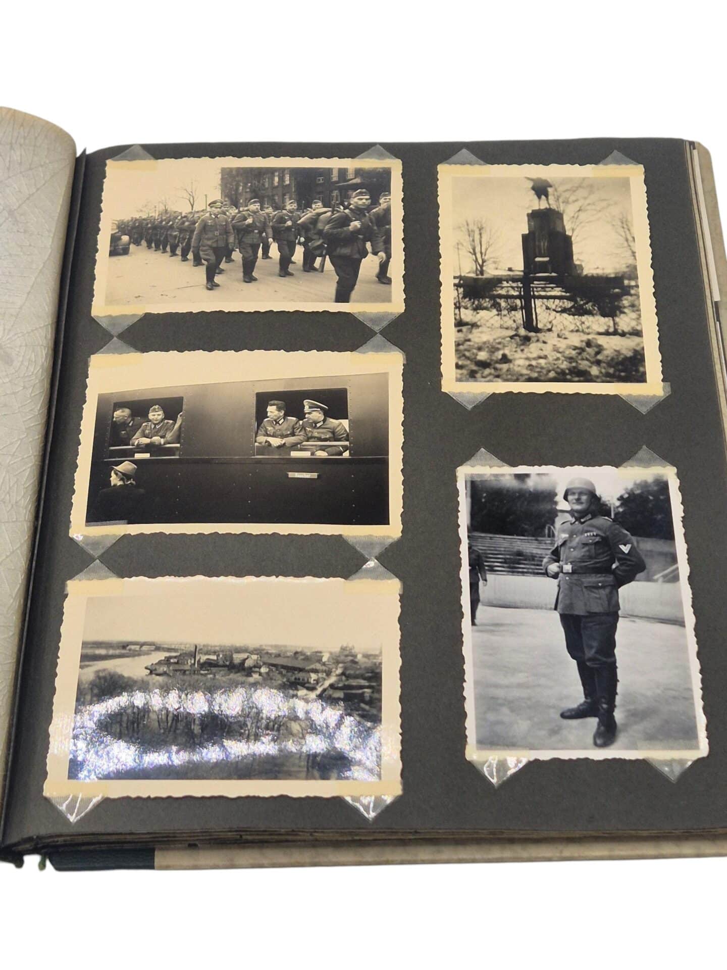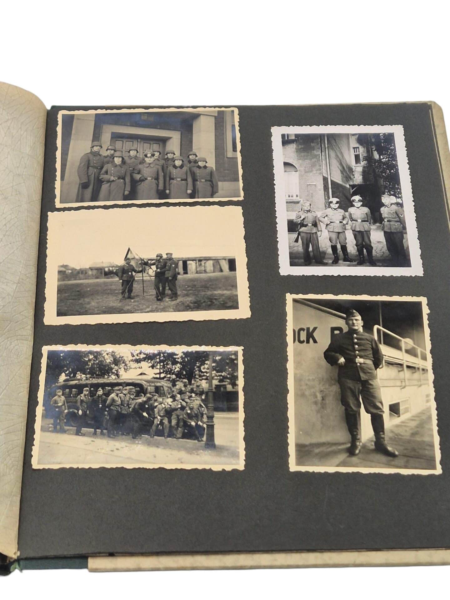 German WW2 photoalbum consisting of 161 pictures, the album is almost complete, some missing pictures. A lof of military pictures. The album starts with some WW1 pictures with pickelhaube. And conitnues with the WW2 in the rest of the album. Guard duty in snowy conditions. Military training, free time, burial etc.