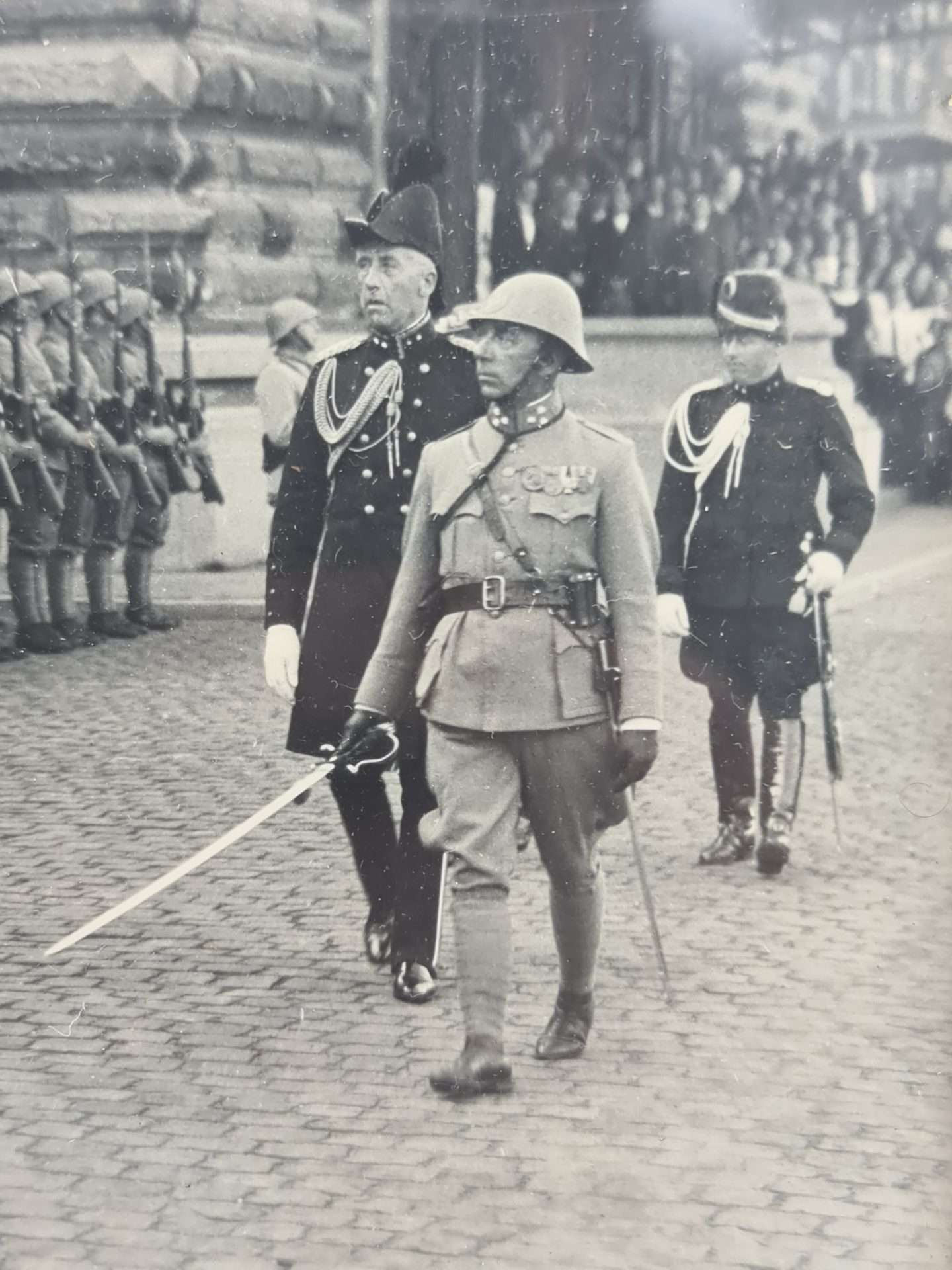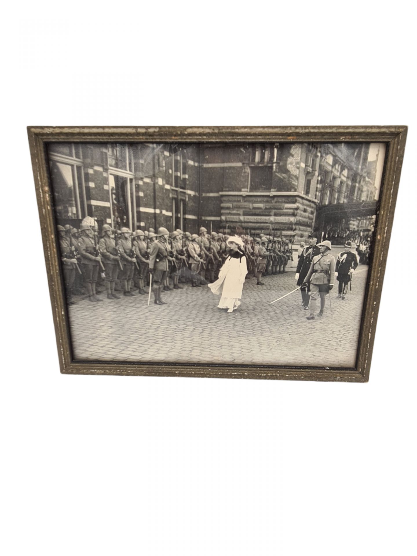 Prachtige originele ingelijste foto met daarop het ere defilé voor de opening van de brug bij Nijmegen. Hierop is Wilhelmina in het wit gekleed in de rouw om haar overleden echtgenoot.  Achter haar loopt haar adjudant en diverse hoge officieren. Mooi grote foto met en op de achterzijde van de lijst beschreven en nog voorzien van het label van de lijstenmaker.