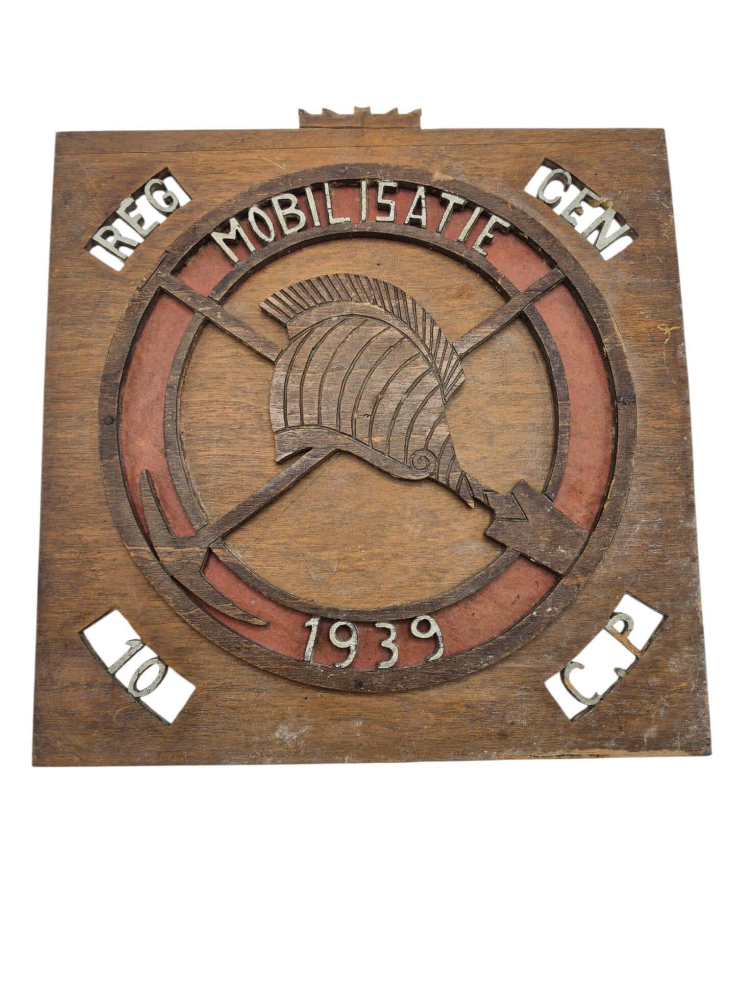 Mooi handgemaakt herdenkingsbordje ter nagedachtenis van de mobilisatie 1939. Op het bordje staat het genie embleem en het regimentsnummer. Het bordje is nog geheel intact. Leuk display item