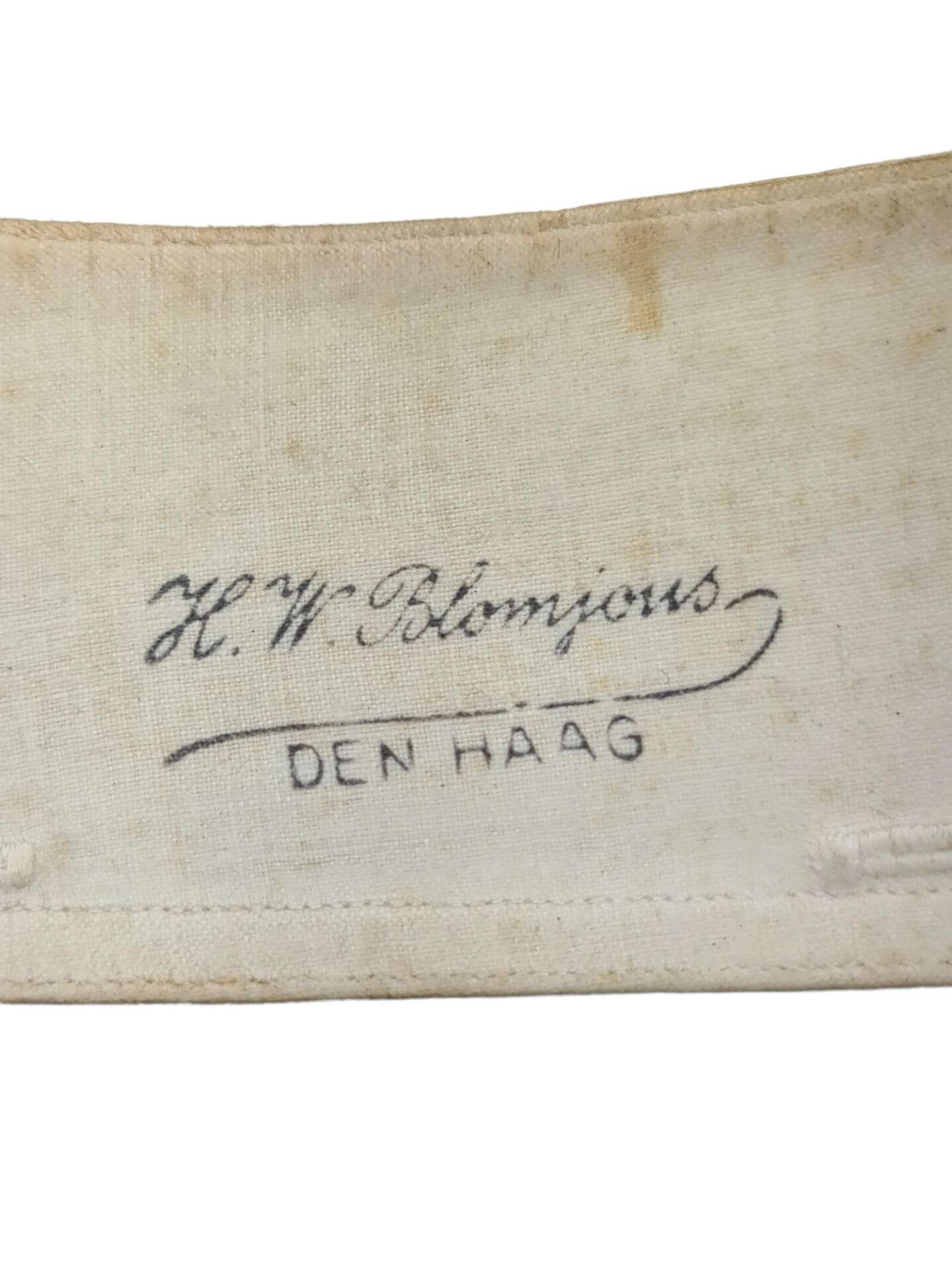 Wit inzetkraagje voor de Nederlandse uniformen. Het kraagje is gemaakt door de firma HW Blomjous en gemarkeerd Militair 15 1/2 39. Het kraagje kan in een uniform gezet worden door middel van de haakjes in de kraag en creëerde zo wat extra draagcomfort.