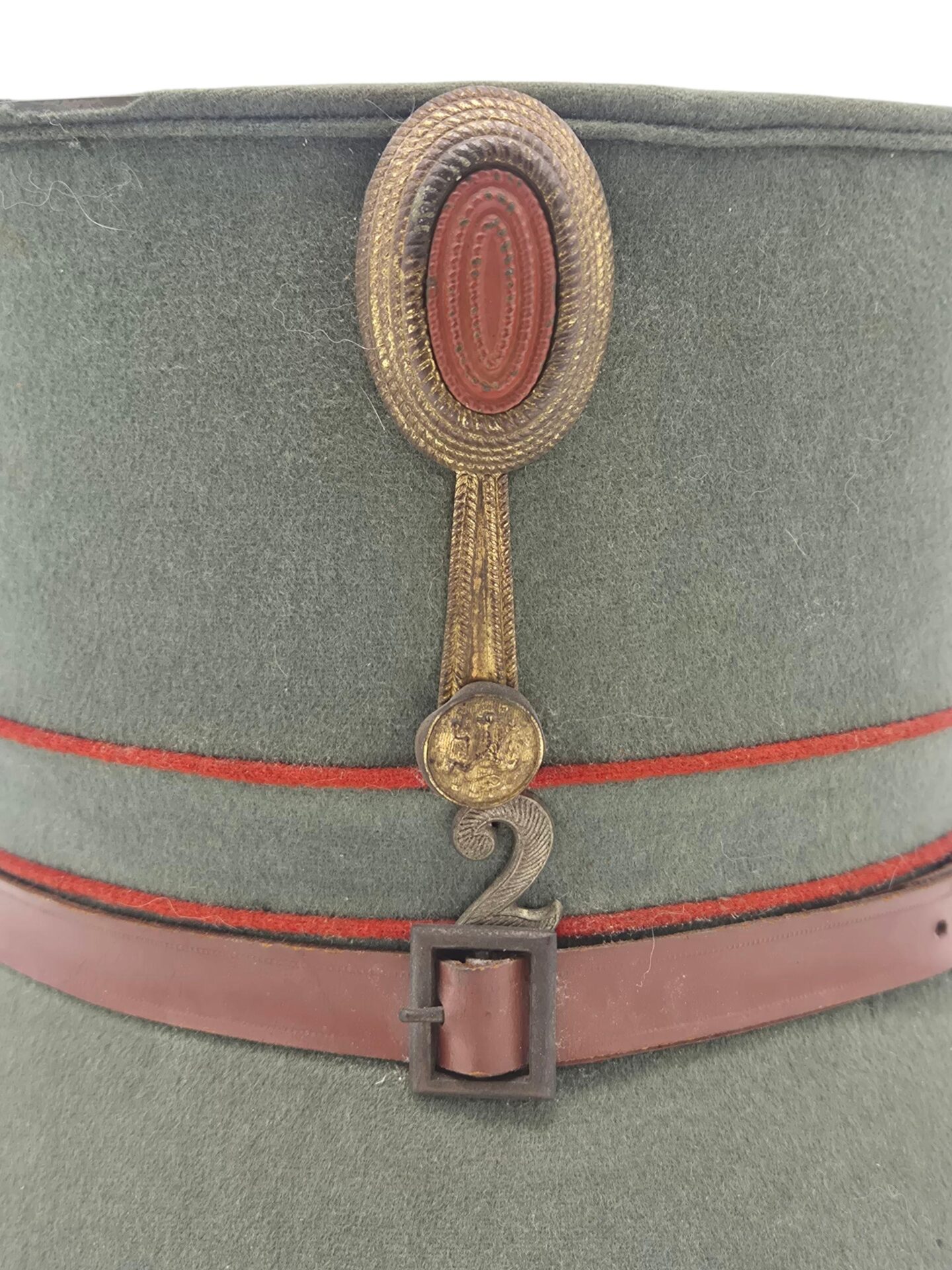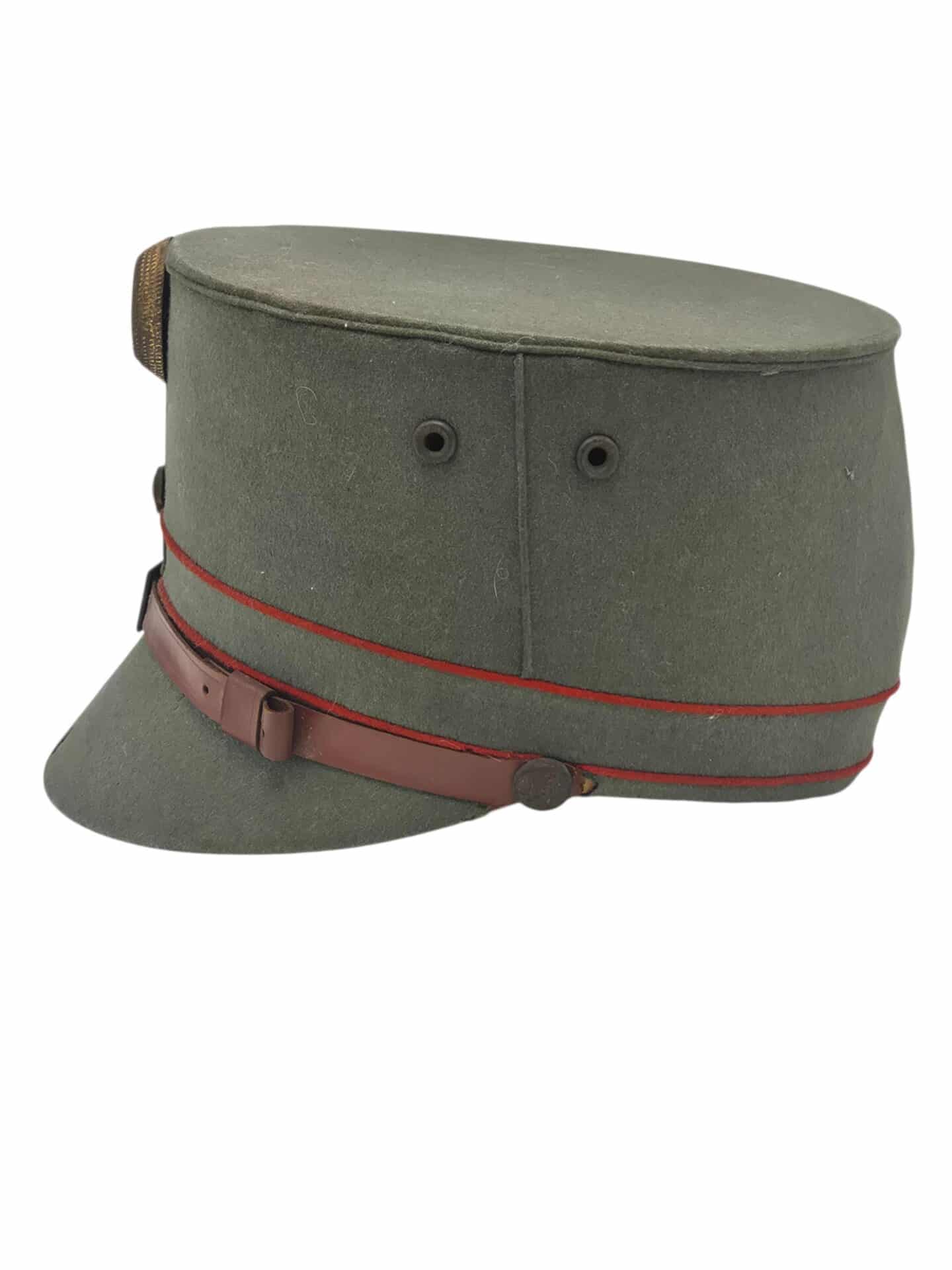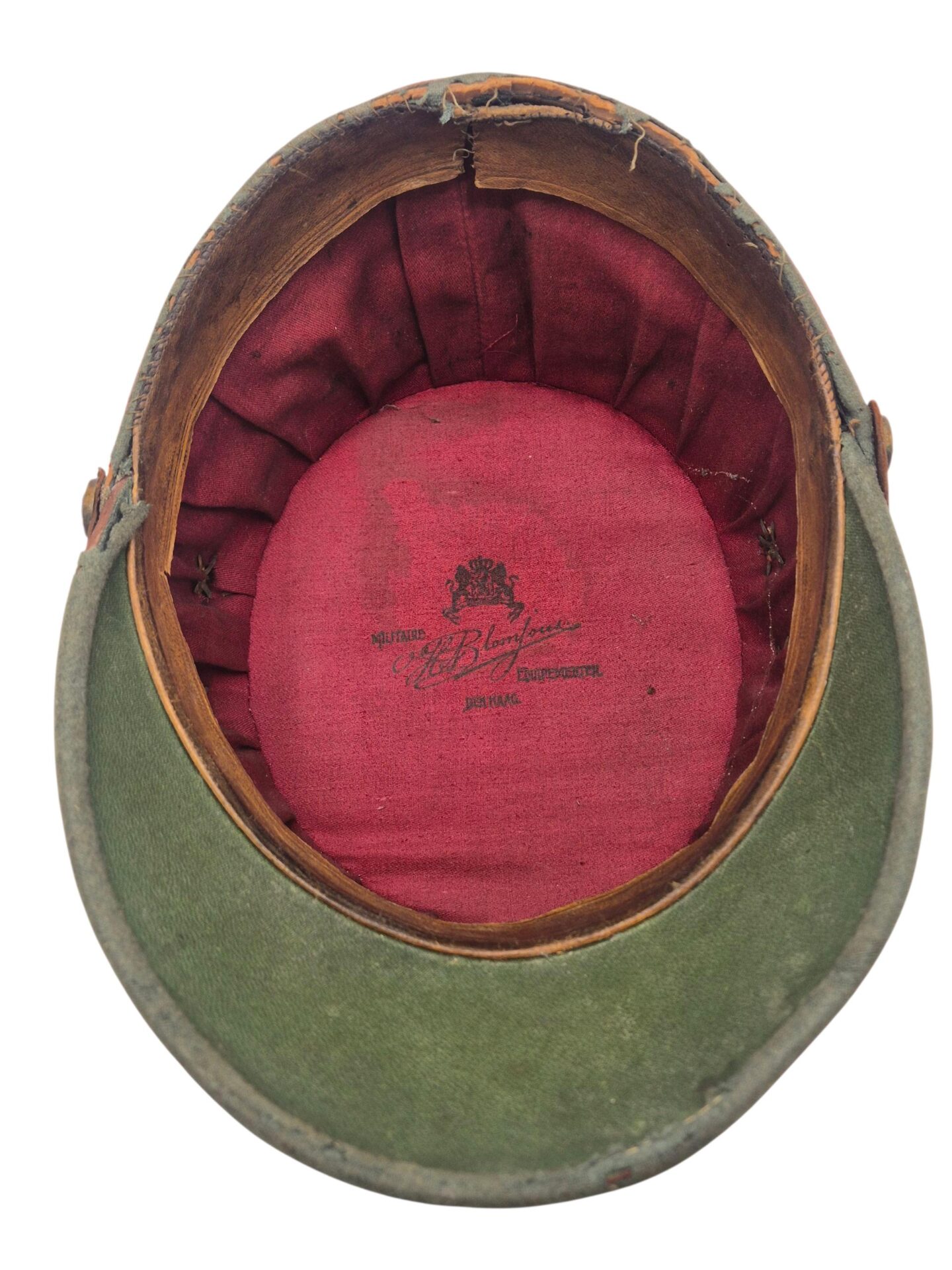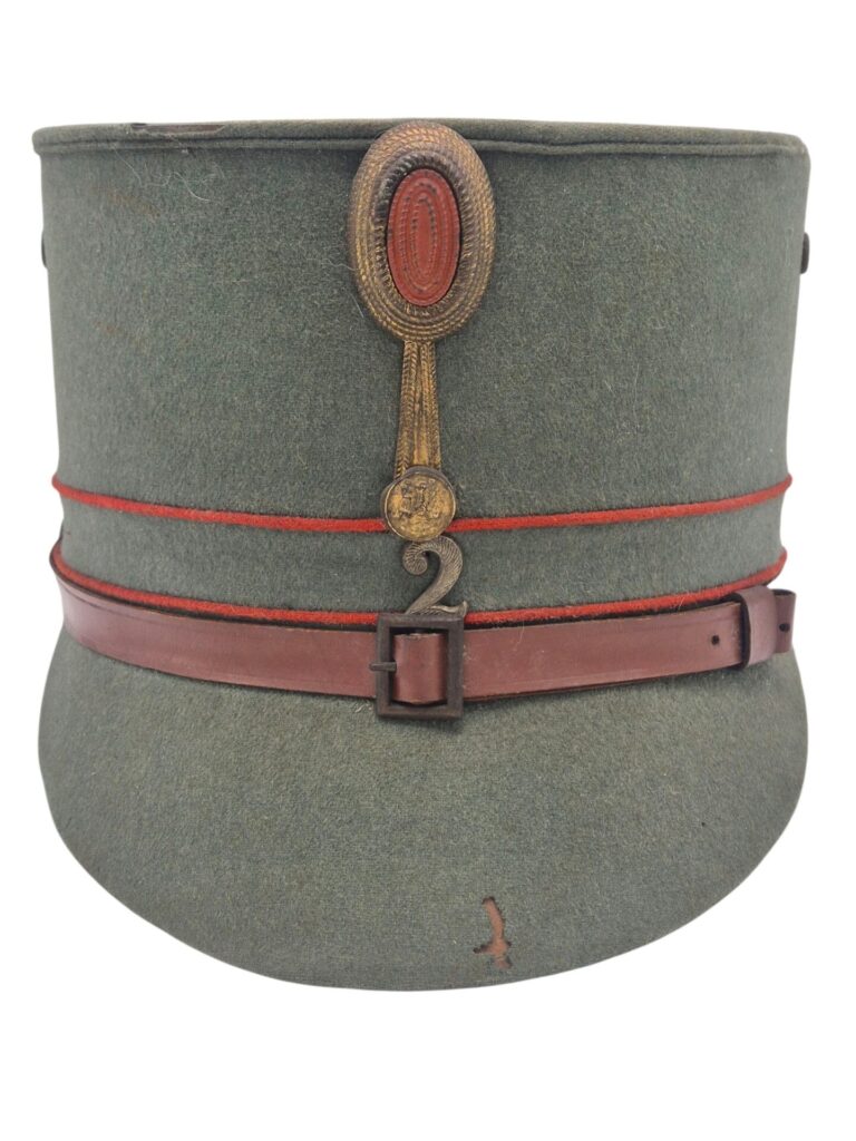 Een kepie gedragen door een manschap artillerie in het Nederlandse leger voor 1940. De kepie is gemaakt van geschoren wol en verkeerd nog in een redelijke staat. De kepie heeft helaas wat motvraat op de klep en aan de bovenrand. De stormriem is nog in een goede conditie in een mooie lichtbruine kleur. Voorop de kepie zit de blikken kokarde, horende bij de rang van soldaat en korporaal. De kepie is voorzien van rode biezen en het getal 2. De binnenzijde van de kepie heeft wat slijtage aan de randen maar is nog in een redelijk goede staat en maker gemarkeerd Blomjous Den Haag.