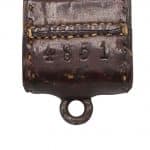 Een niet veel voorkomende vroege klewang houder voor de Nederlandse Hembrug klewang. Dit model is slechts kort in gebruik geweest en is snel in de bon gedaan omdat door de draagwijze de klewang vaak van de houder viel.  De houder is nog gemarkeerd met het klewangnummer dat bij de drager hoorde, 4851. De klewanghouder is ook nog voorzien van een keurmeesterstempel, een gekroonde letter B.