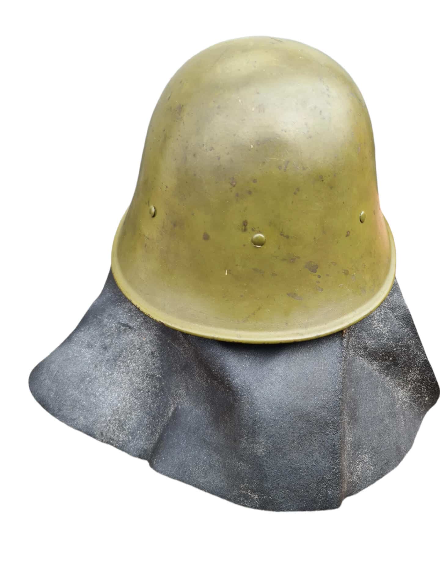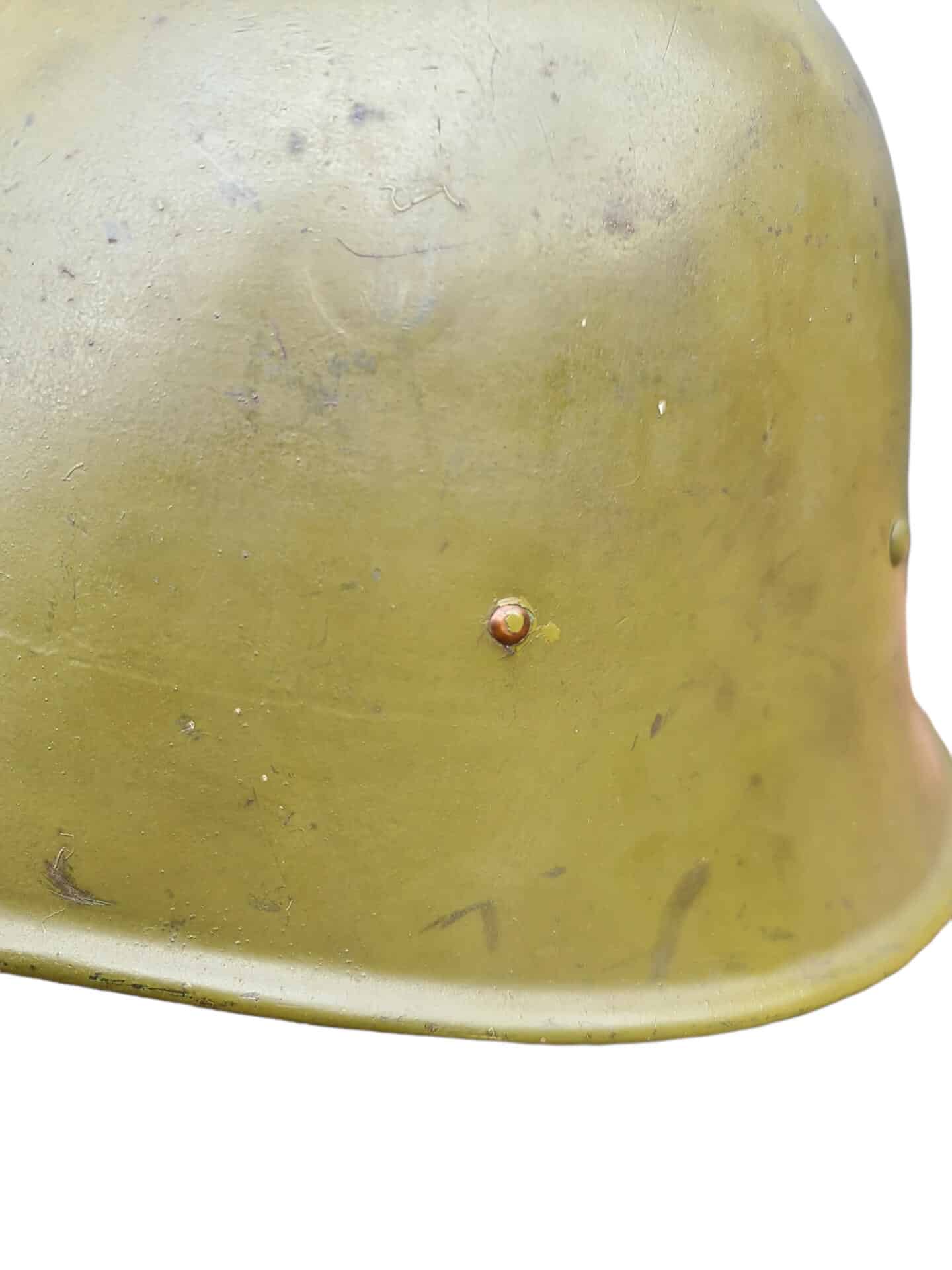 Zeer zeldzame Nederlandse KNIL M.40 helm met helmplaat. Deze helmen zijn zeer schaars en zijn samen met de mariniers en motorrijders helm de meest gezochte Nederlandse helmen. De helm is nog voorzien van zijn originele verf en binnenwerk. Onder de flapjes zitten nog de originele zakjes met paardenhaar voor het draagcomfort. De kinriem is waarschijnlijk een Milsco riem, wat een latere reparatie zou kunnen zijn. Achter de lange nekflap staat de maatstempel 1. De nekflap is waarschijnlijk in, of net na de oorlog vervangen. Al met al een zeer mooie Nederlandse KNIL  helm met helmplaat in zijn originele verf!