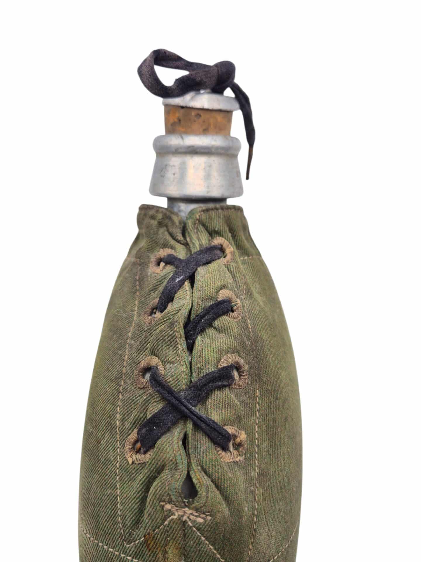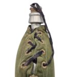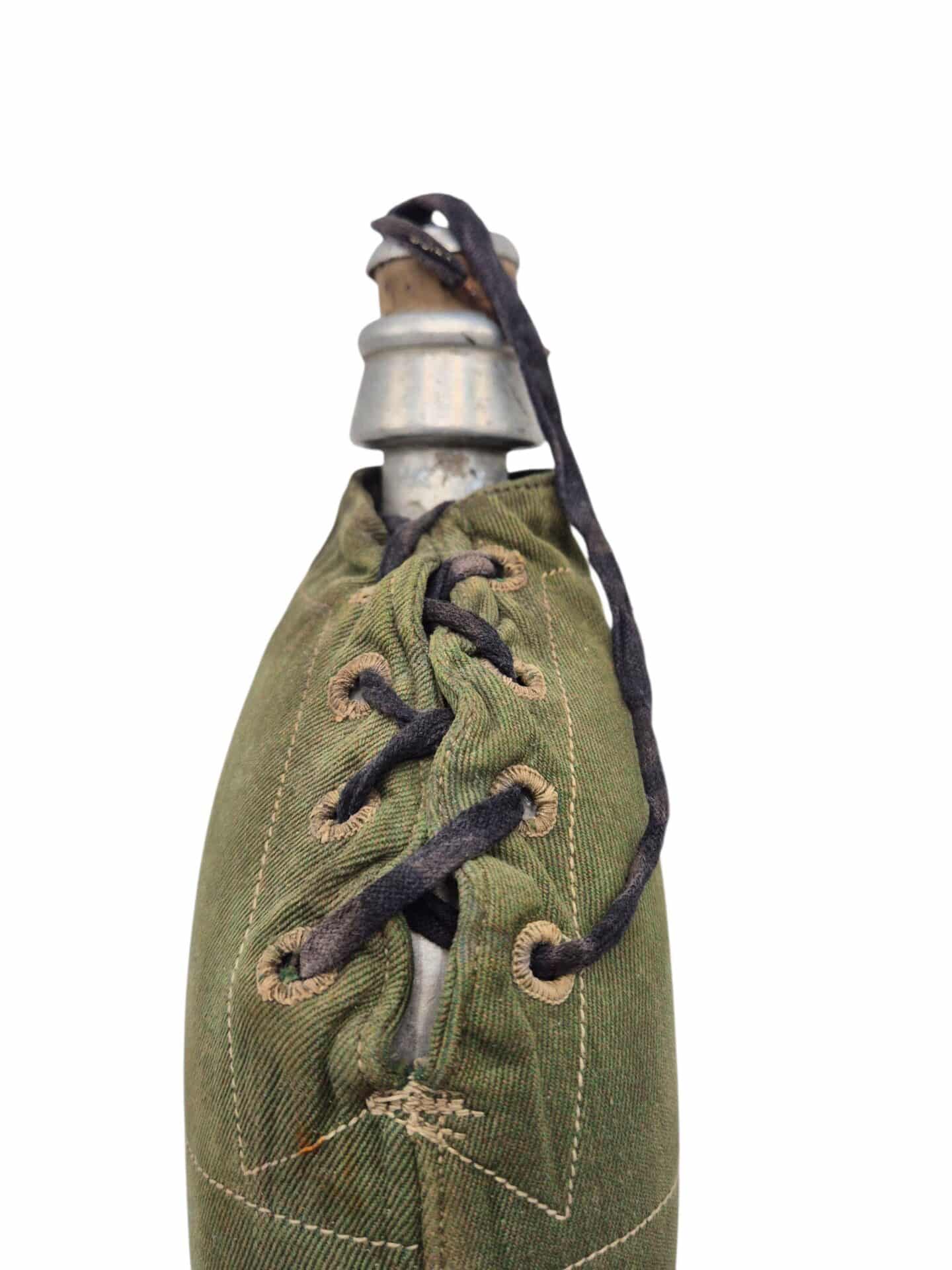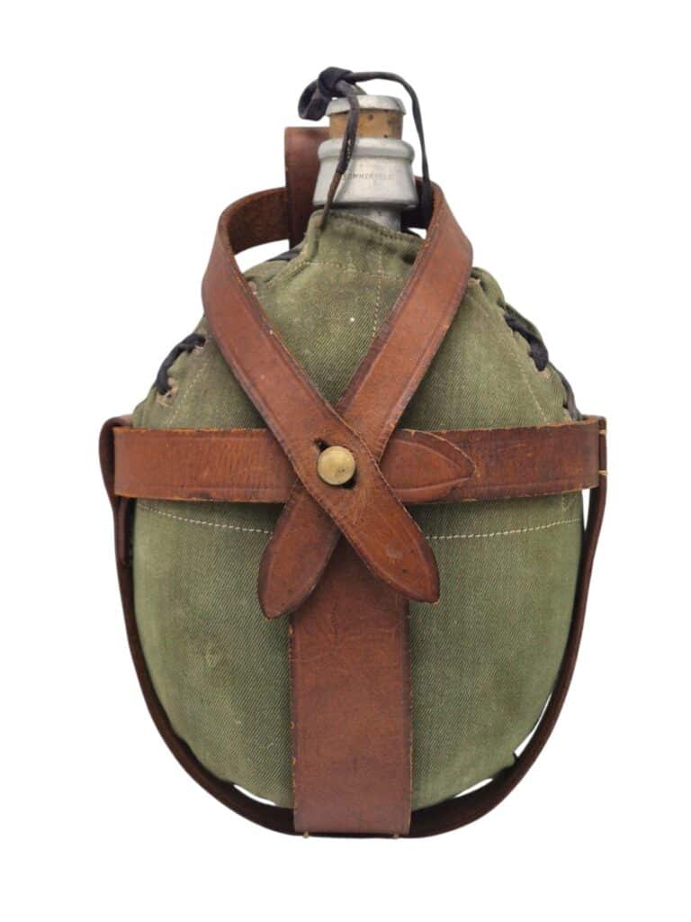 In zeer goede staat verkerende KNIL veldfles met lederen draagstel. De veldfles is gemaakt door Sommerfeld en er zit een hoes omhoog gemaakt van garoet B stof. De hoes is compleet met de sluitveter die pas eind jaren 30 ingevoerd is. De lederen draagstel is niet gemerkt maar verkeerd in een bijzonder goede staat. In deze conditie zelden aangeboden.