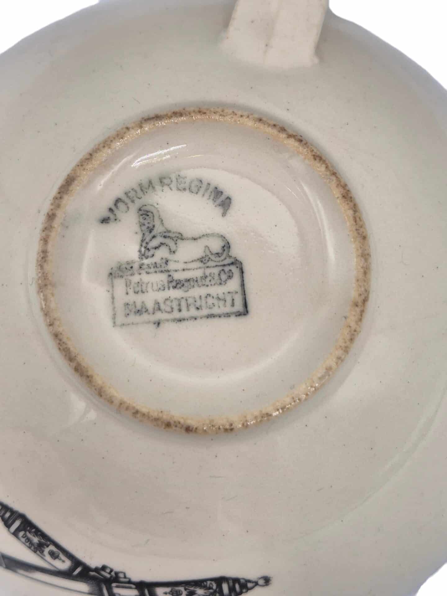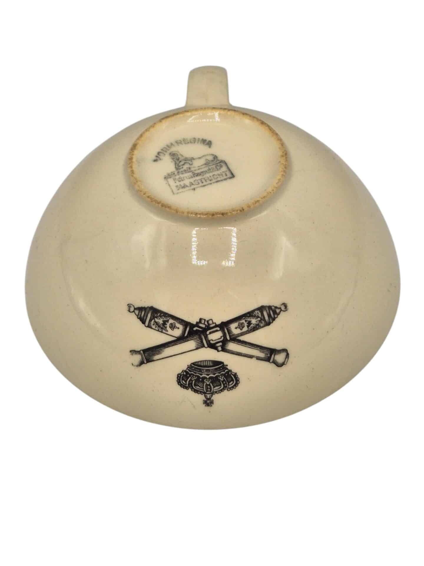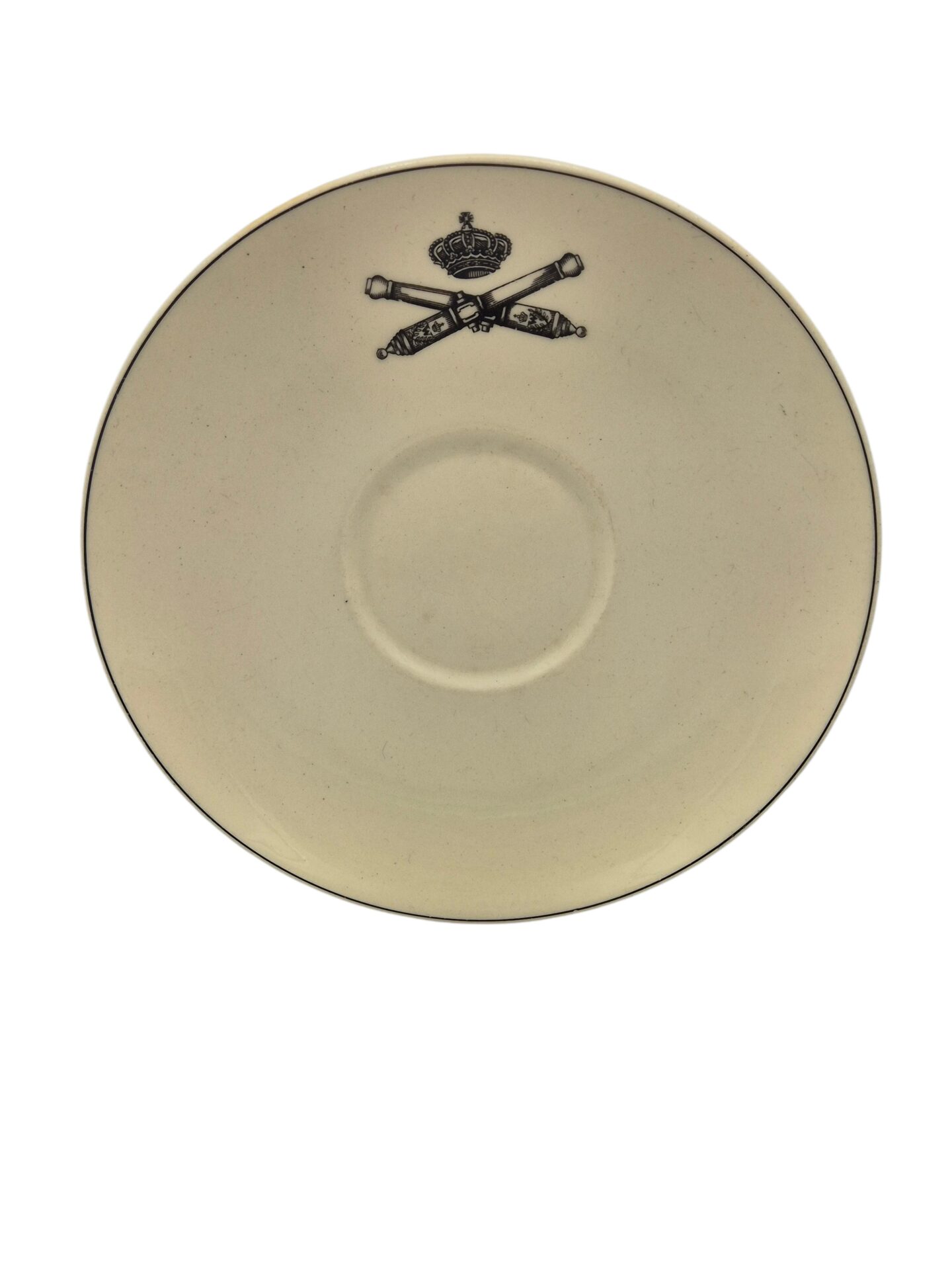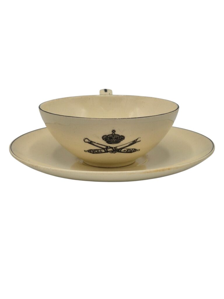 Mooie 19e -eeuwse kop en schotel. De kop is gemarkeerd Petrus Regout & Co Maastricht deze markering is van voor 1900. Het betreft hier een theekopje mooi voorzien van het gekroonde artillerie logo. De schotel is niet gestempeld. Beiden zijn nog in een zeer goede conditie. Mooi setje zoals gebruikt in de officiers kantine.
