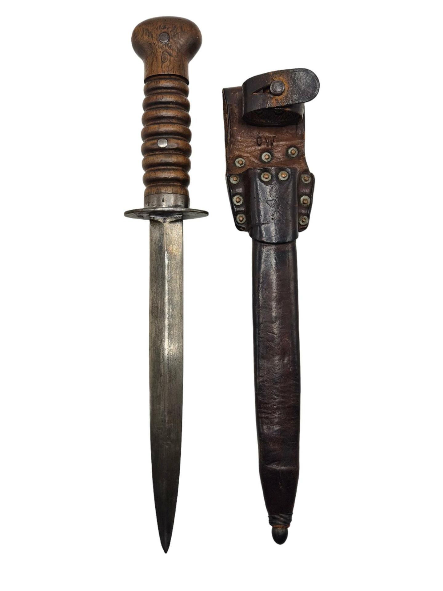 Nederlandse marine/mariniers stormdolk die in een goede staat verkeerd. Het leerwerk is nog in een donkere maar goede staat  en vertoond slechts lichte gebruiksplekjes. De schede is gemarkeerd met 5169A wat het originele nummer van de schede was maar later is de schede in gebruik genomen door de marine/mariniers waarna het koperen plaatje is geplaatst met nummer 1259.  De dolk zelf is nog in een nette gebruikte conditie en is gemarkeerd met nummer 1072. Bij marine/mariniers dolken werd een ander lettertype gebruikt als op de gewone stormdolken en ze zijn nooit voorzien van een letter. Op de dolk en op het heft zijn meerdere keurstempels te vinden. De eigenaar van de dolk heeft op het heft en op de schede zijn initialen ingekrast wat ook weer aangeeft dat dolk en schede bij elkaar horen. Leuke niet veel voorkomende stormdolk