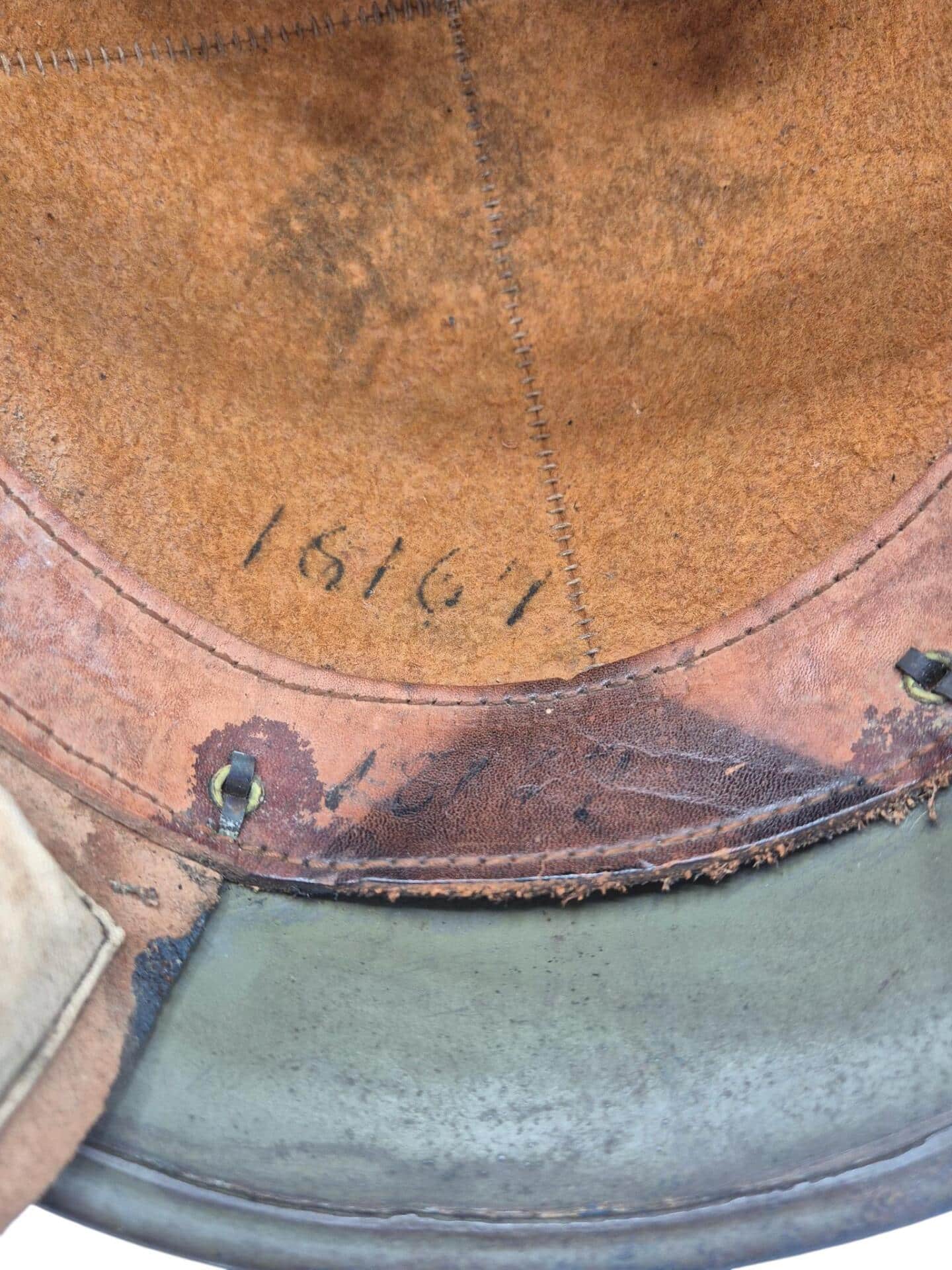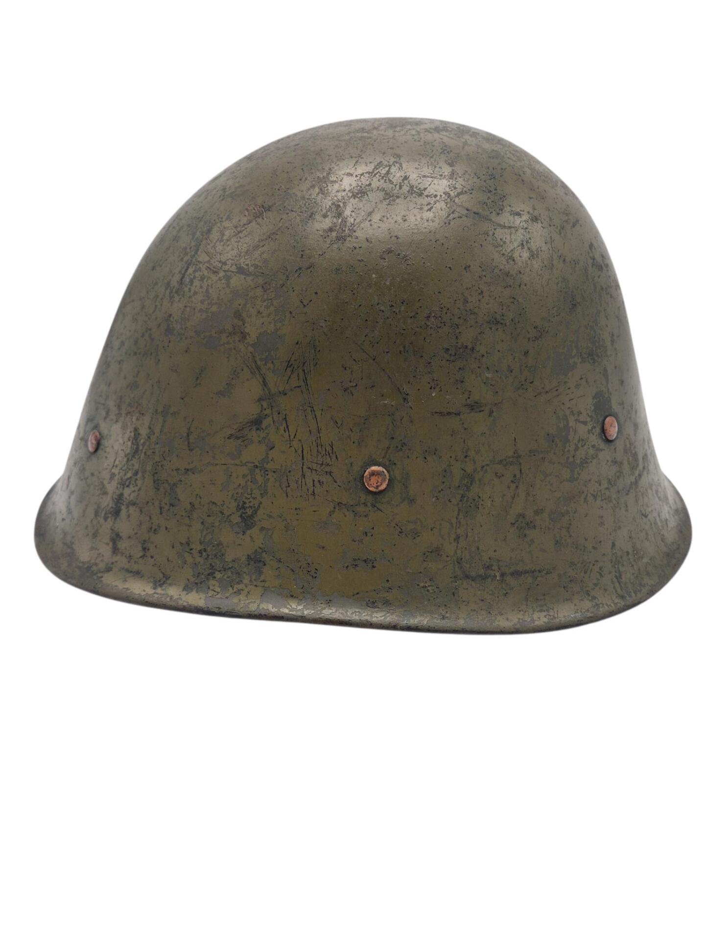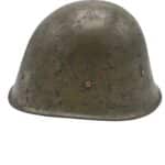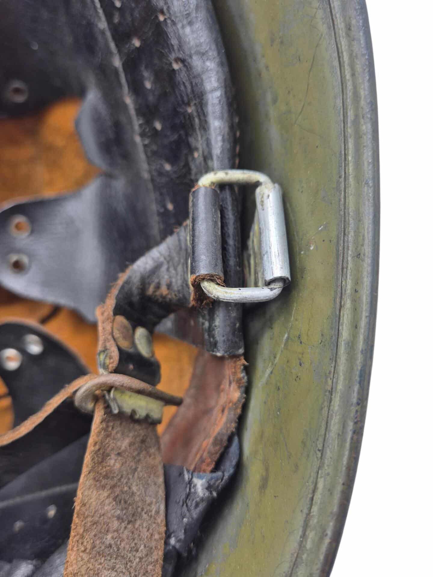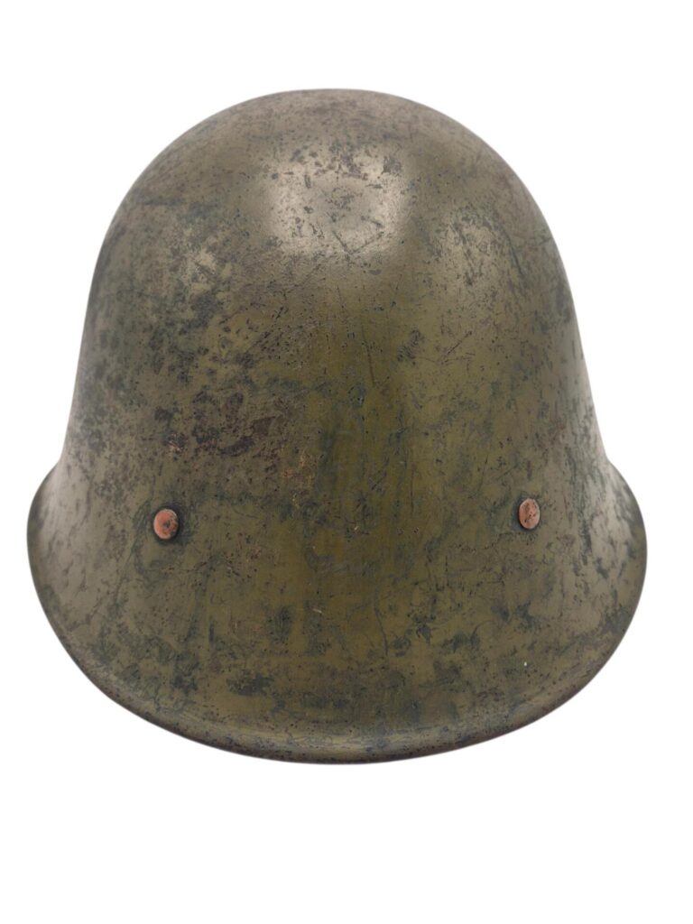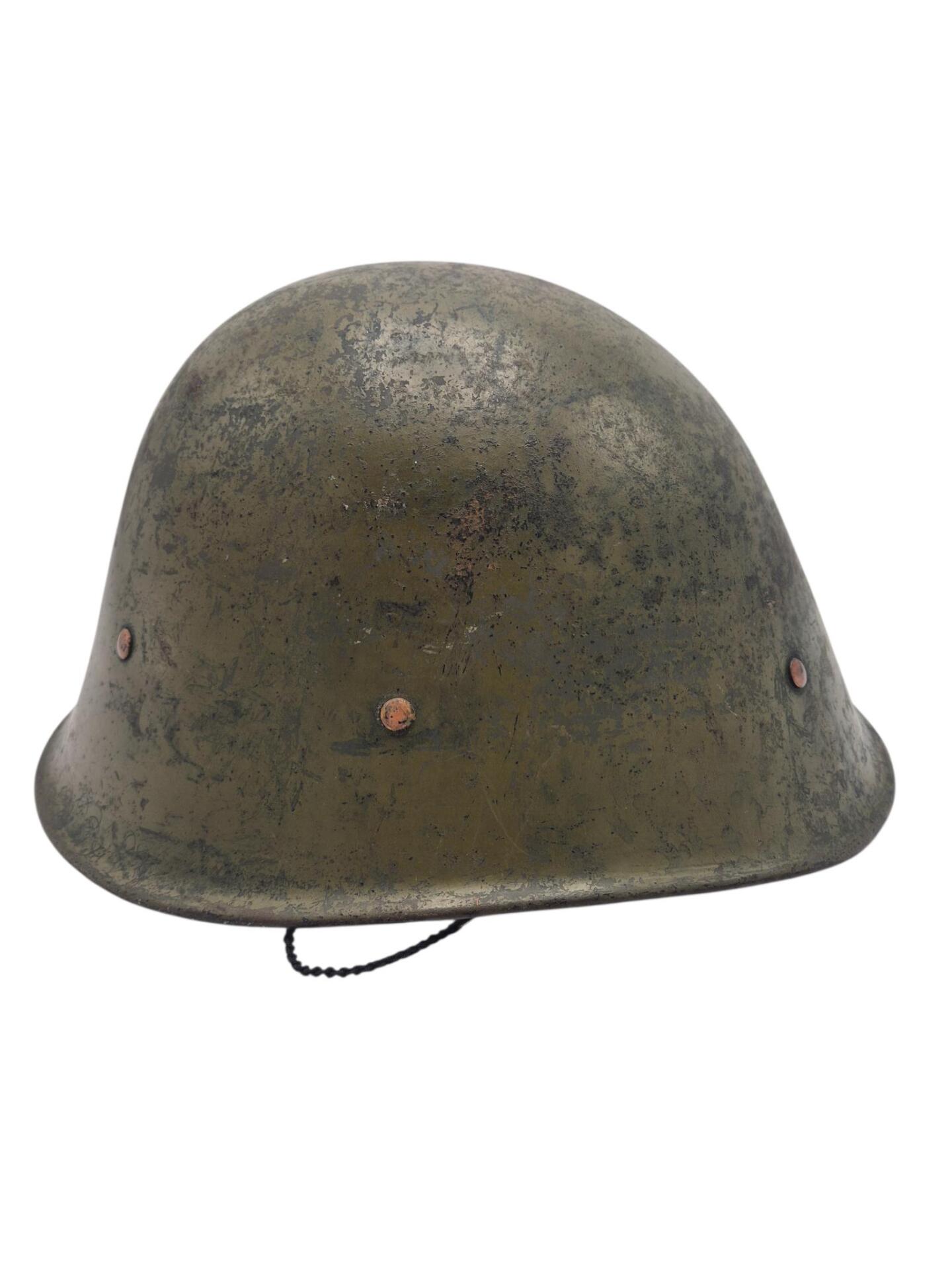Nederlandse KNIL M41 helm. Deze helm is gefabriceerd door Milsco in de Verenigde staten in opdracht van de Nederlandse regering. De helm is in een goed gebruikte conditie met alles behalve de nek flap nog aanwezig. De schaal is nog in een goede conditie, de helm heeft wat lichte roest maar de olijfgroene kleur is nog duidelijk zichtbaar. De kin riem is origineel bevestigd en betreft het correcte brede model en gesp. Het vilt in het binnenwerk is nog in een zeer goede conditie.