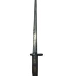 Nederlandse M.95 Hembrug geweer bajonet. De bajonet met originele schede verkeerd in een nette staat. De schede is nog zwart van kleur, dit gebeurde met de vroegere modellen bajonet schedes. Aan de achterzijde van de schede diverse wapen nummers die zijn doorgekrast en aan de voorzijde van de lus 2242 duidelijk ingeslagen, daaronder staat het nummer nogmaals ingeslagen en nog diverse andere nummers dus een goed gebruikt exemplaar! Het lemmet heeft wat plekken met roestschade maar is in een goede stabiele staat en is gemaakt door de Hembrug fabriek. Dit betreft een zeldzame variant, dit zijn de 1e modellen die door Hembrug zijn gemaakt, te herkennen aan het kleinere lettertype van het Hembrug logo. Het serienummer van de bajonet is 6947 en aan de andere zijde ook gestempeld. Op het lemmet is de keurmeesters stempel te zien, een gekroonde letter O. De houten handvatten zijn nog in goede conditie en niet beschadigd. Het sluitriempje is nog zeer stevig en nog prima te sluiten en te openen. Bijzondere M95 geweer bajonet.