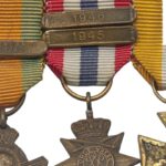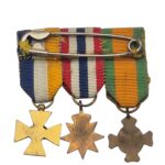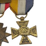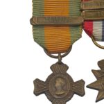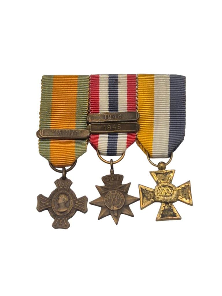 Nederlandse miniatuur medaille spange. Deze set bestaat uit een Oorlogsherinneringskruis met gesp Mei 1940, de medaille orde en vrede met gespen 1945/1946 en een officierskruis 30 jaar trouwe dienst! De medailles en linten zijn nog in zeer goede conditie.