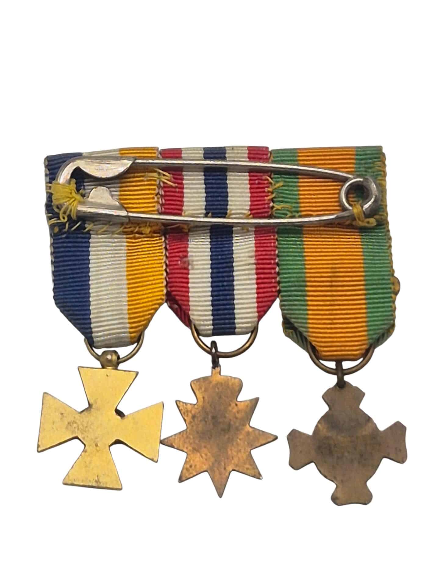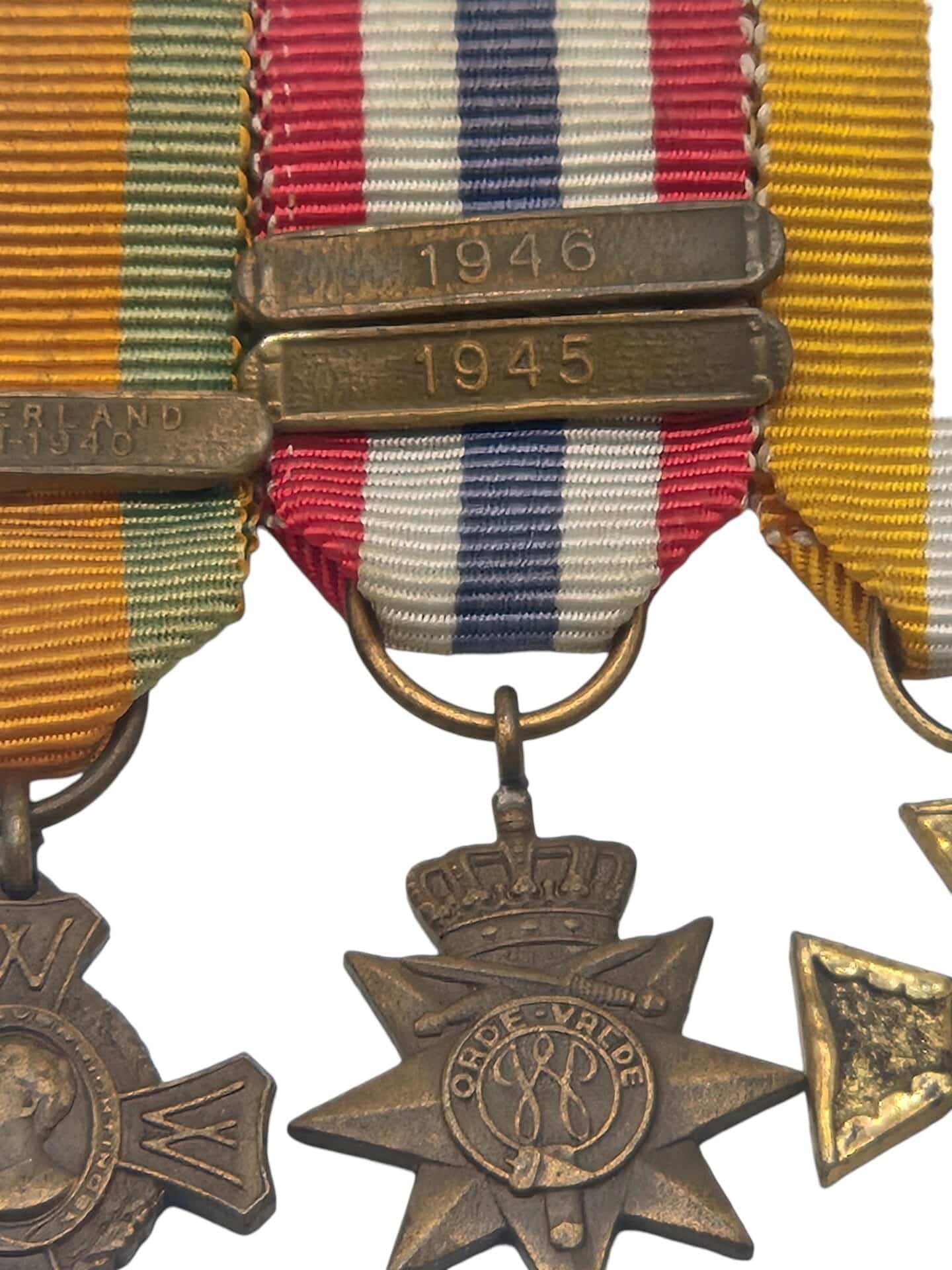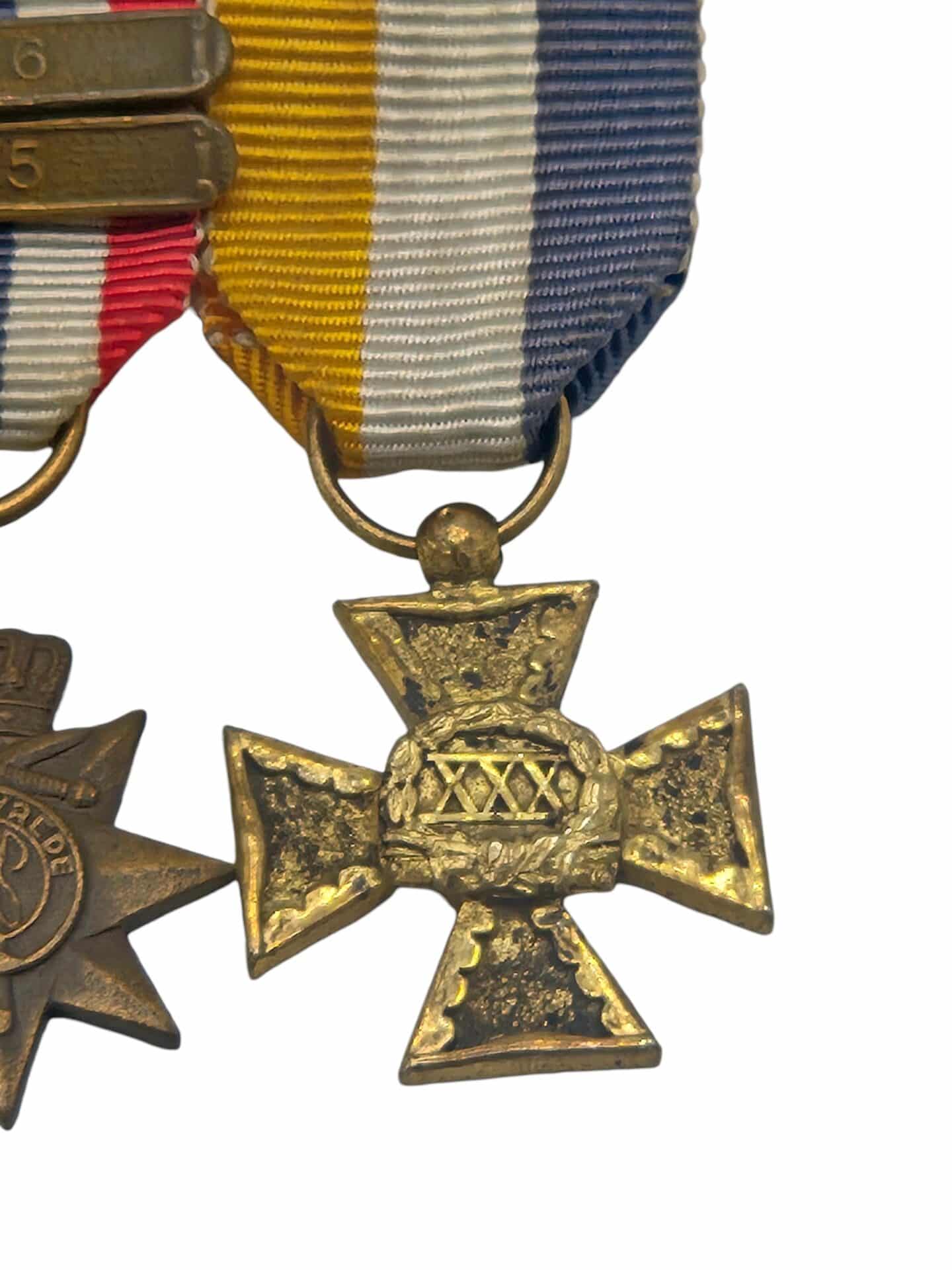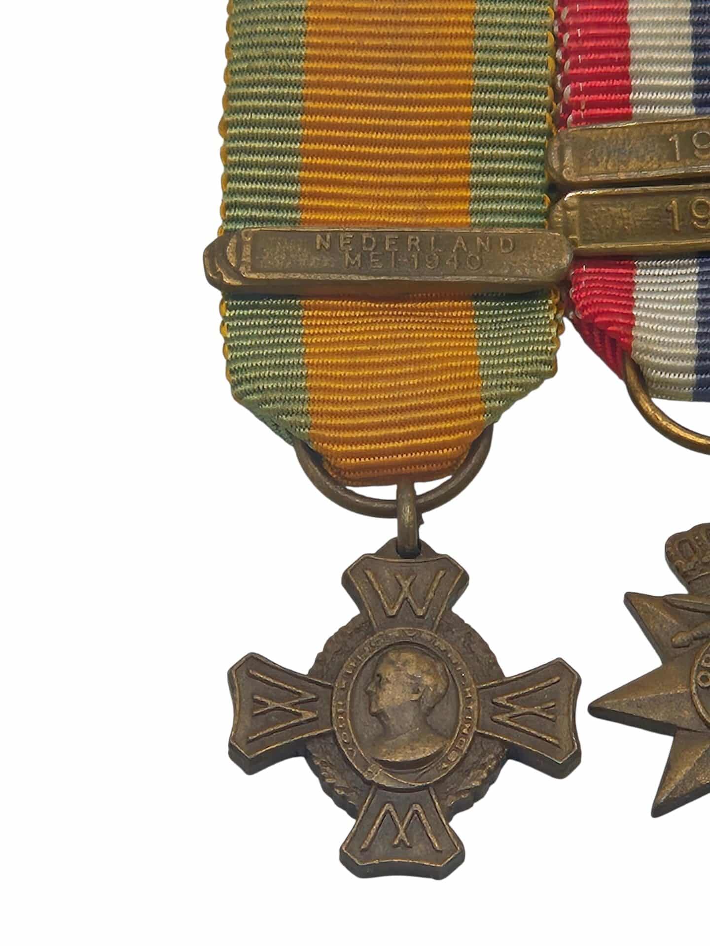 Nederlandse miniatuur medaille spange. Deze set bestaat uit een Oorlogsherinneringskruis met gesp Mei 1940, de medaille orde en vrede met gespen 1945/1946 en een officierskruis 30 jaar trouwe dienst! De medailles en linten zijn nog in zeer goede conditie.