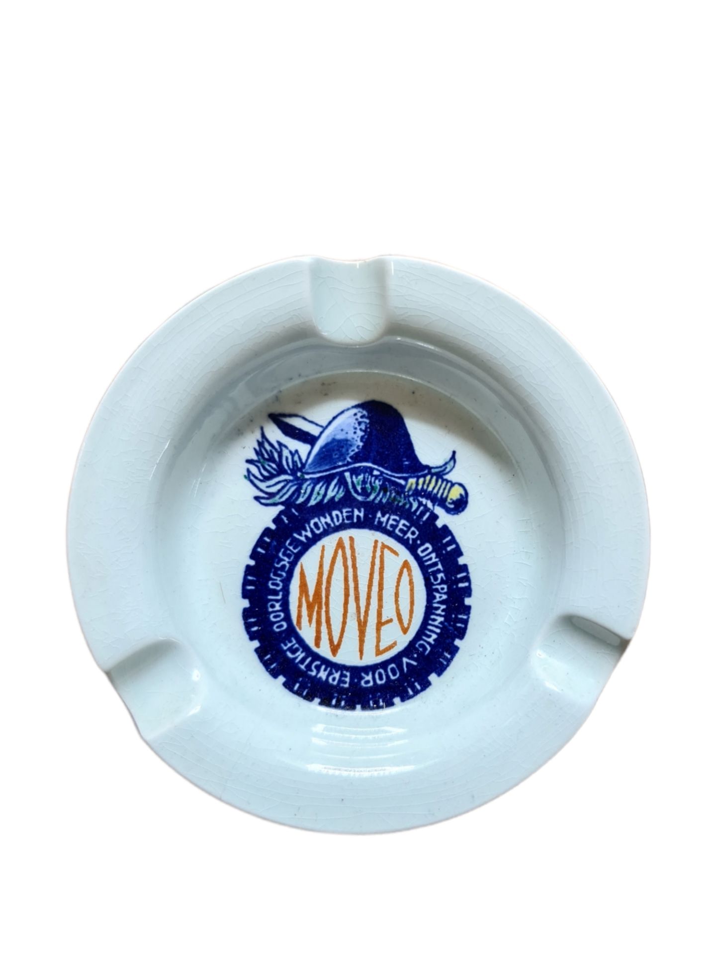 Moveo asbak. Moveo staat voor Meer Ontspanning Voor Ernstige Oorlogsgewonden. De askbak is gemaakt door Goedewaagen in Gouda.