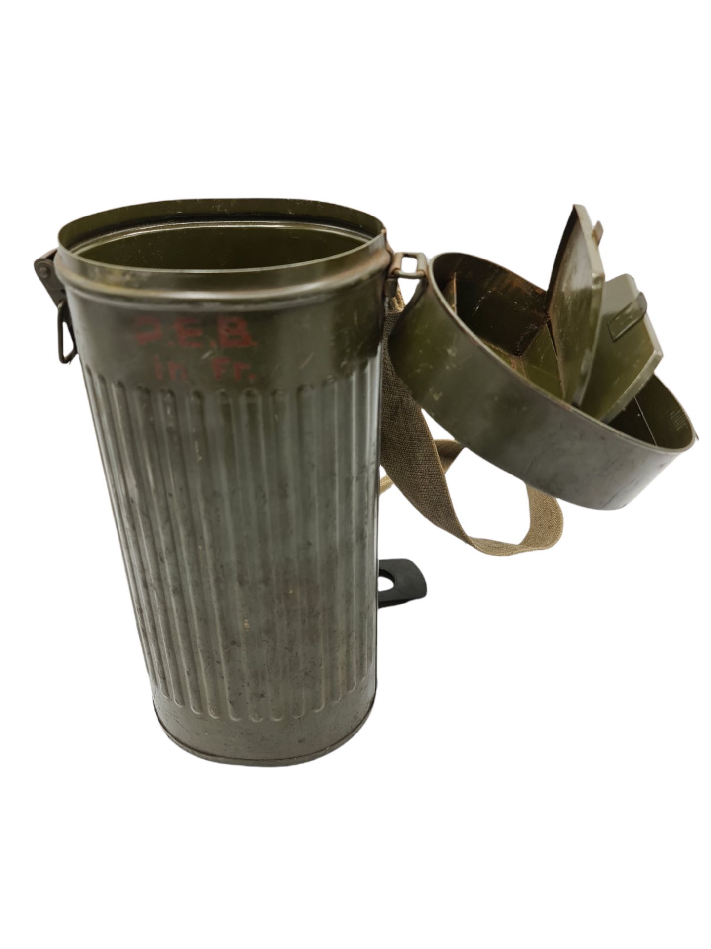 In zeer goede staat verkerend Nederlands gasmasker model H. Dit model was de opvolger van het model G, wat nog een draagtas was. Model G was afgekeken van de Duitse gasmaskerbussen. Dit model is zeer kort voor de oorlog in gebruik gekomen bij de troepen. De bus verkeerd nog in een zeer goede staat en heeft nog zijn originele donkergroene verf. Aan de bus zitten canvas riemen, welke ook aan de gasmaskertassen zaten. Op de lange draagriem zit dezelfde haak, waar de geweer riem in gehangen kon worden. De schuifgesp om de lengte te bepalen is ook identiek aan de gasmaskertassen. De clip om de bus te hangen aan de koppel is hetzelfde als bij de onbereden gasmasker tassen. In het deksel van het blik zijn alle accessoires voor het gasmasker aanwezig. Het rubberen gasmasker is nog bedekt met een laagje talkpoeder en daardoor nog in soepele nieuwstaat en is aan de binnenzijde gedateerd april 1940. Het gasmasker is gemaakt door Hevea . De filterbus is gemaakt in 1940.
