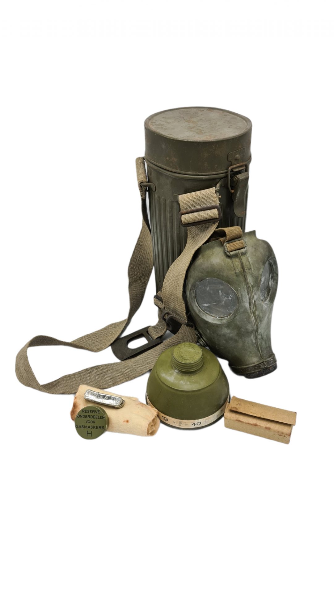 In zeer goede staat verkerend Nederlands gasmasker model H. Dit model was de opvolger van het model G, wat nog een draagtas was. Model G was afgekeken van de Duitse gasmaskerbussen. Dit model is zeer kort voor de oorlog in gebruik gekomen bij de troepen. De bus verkeerd nog in een zeer goede staat en heeft nog zijn originele donkergroene verf. Aan de bus zitten canvas riemen, welke ook aan de gasmaskertassen zaten. Op de lange draagriem zit dezelfde haak, waar de geweer riem in gehangen kon worden. De schuifgesp om de lengte te bepalen is ook identiek aan de gasmaskertassen. De clip om de bus te hangen aan de koppel is hetzelfde als bij de onbereden gasmasker tassen. In het deksel van het blik zijn alle accessoires voor het gasmasker aanwezig. Het rubberen gasmasker is wat droger geworden door de jaren en is wat verkleurd. Het gasmasker is gemaakt door Vredestein en heeft een stempel van het Staatsbedrijf der Artillerie Inrichtingen. De filterbus is gemaakt in 1940.