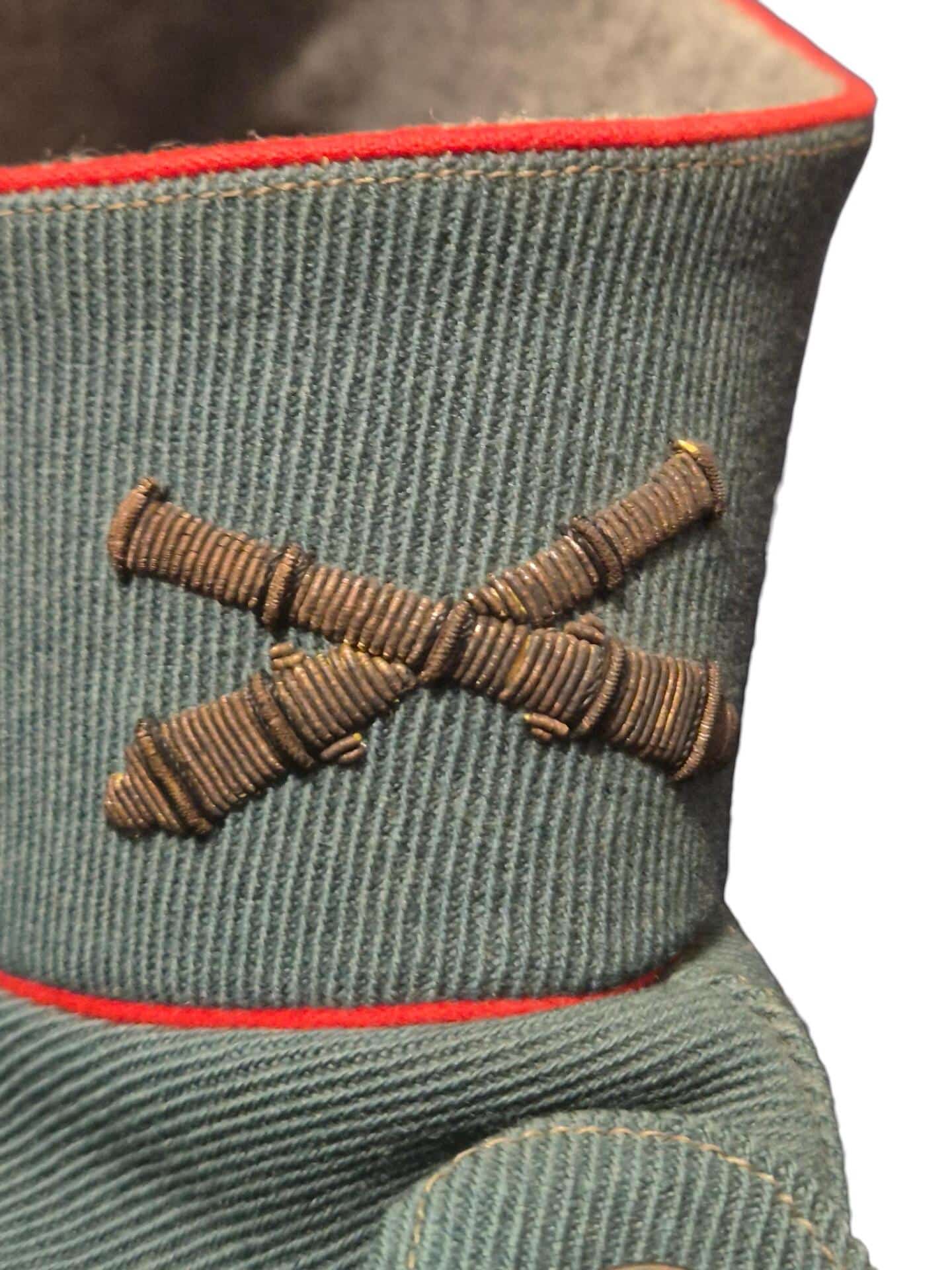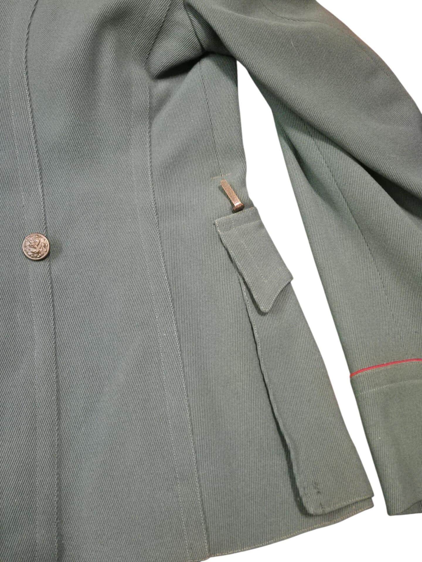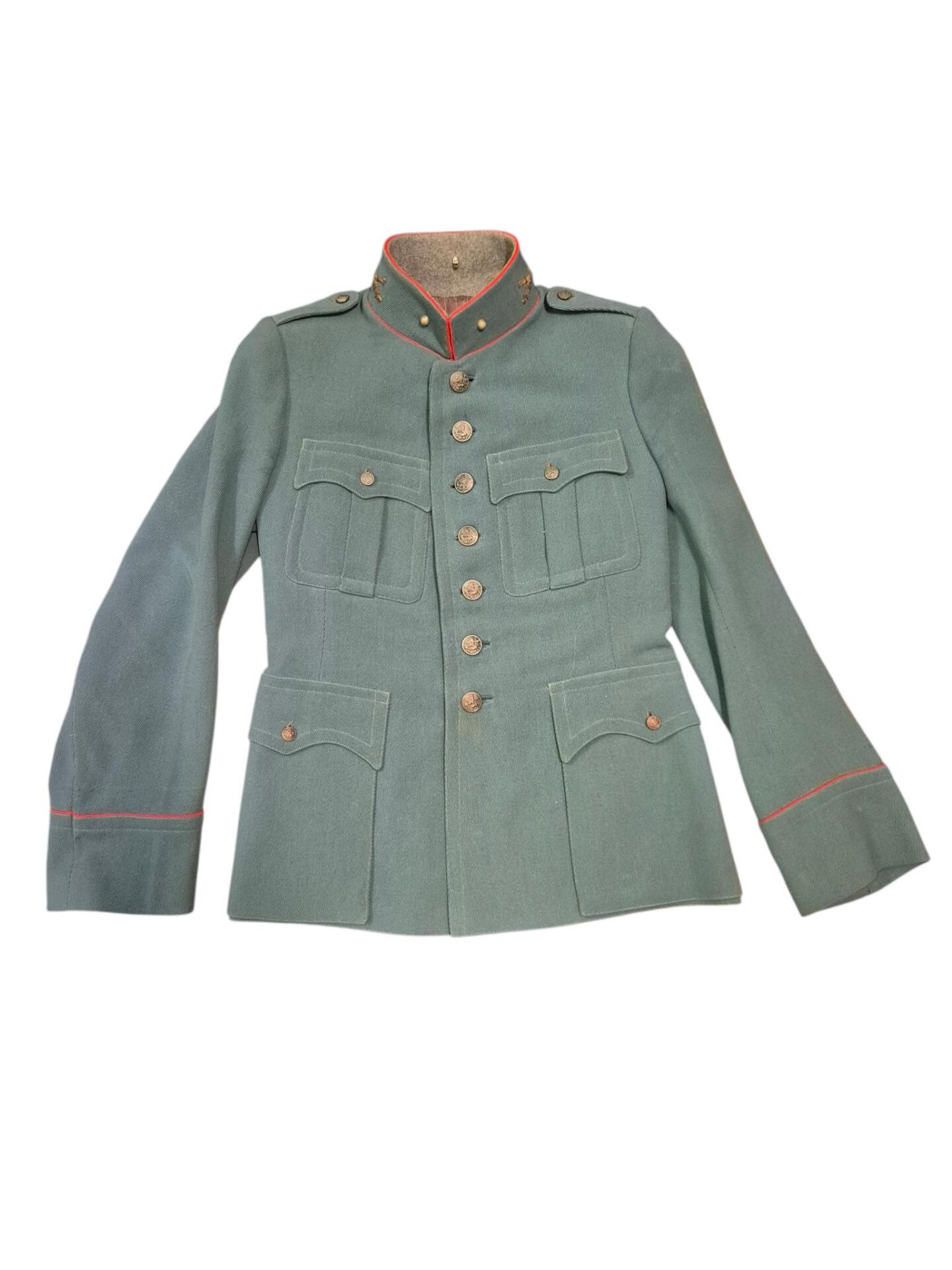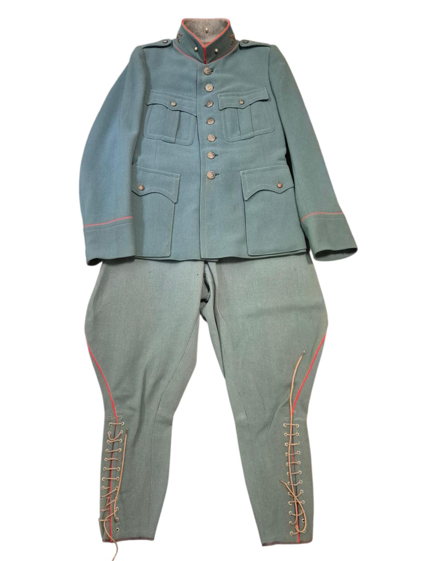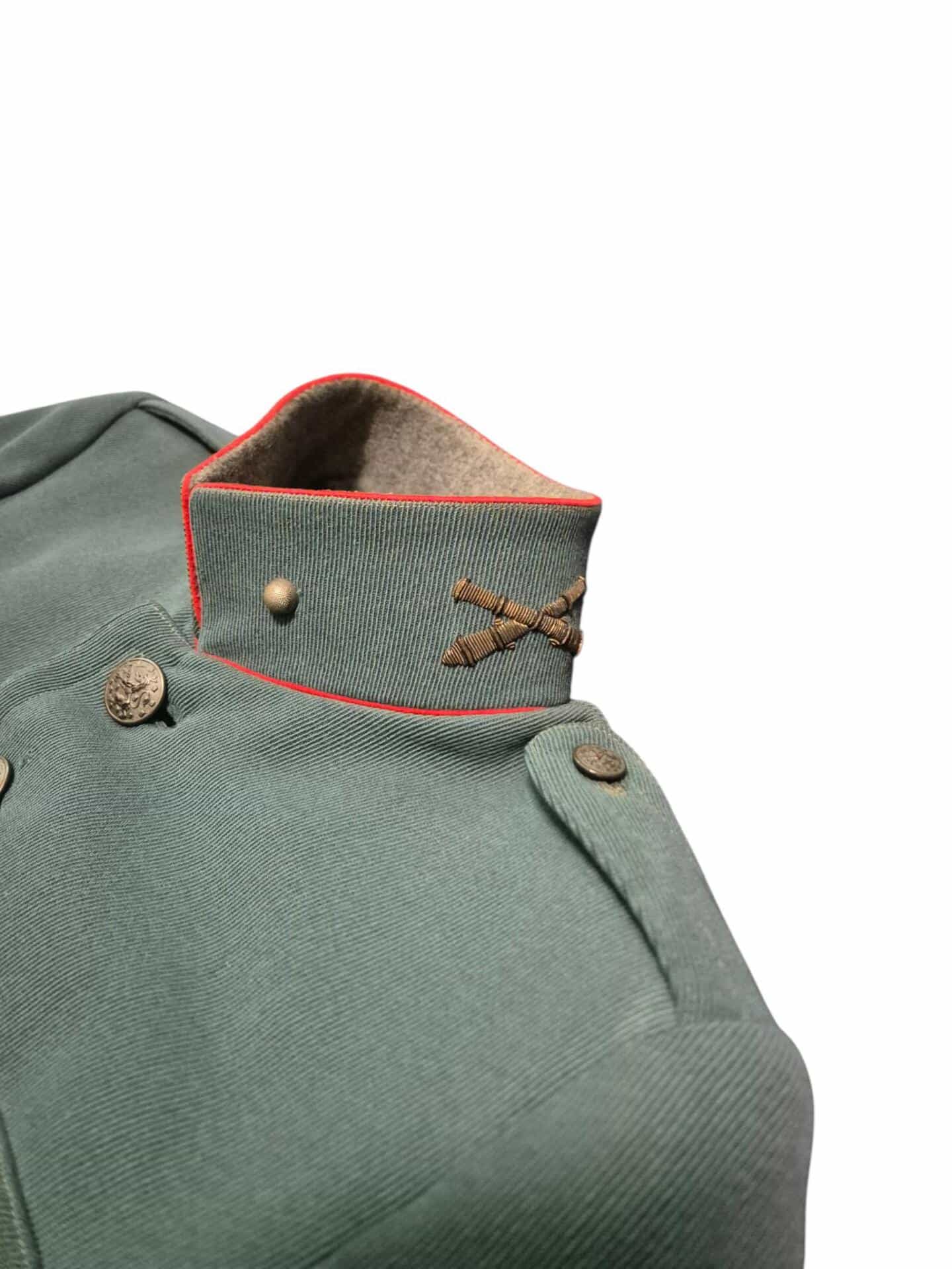 Prachtige set van een vaandrig der artillerie, dit betreft een der laagste officiersrangen. Het pak is gemaakt van een laat jaren 30 blauwgrijze whipcord stof. Op de foto´s komt de kleur niet helemaal goed naar voren. De Jas is in een zeer goede conditie met enkele kleine slijtageplekjes, geen motgaten. De kraag  met de in geborduurde kanonnen is in een zeer goede conditie. De broek heeft een iets lichtere kleur maar is wel gemaakt van exact dezelfde stof en is zo als set gevonden. De broek heeft 1 klein motgaatje in het kruis. Mooie  pofbroek met felrode biezen, met nog de originele bindveters. Mooie set van een adjudant van het wapen der artillerie