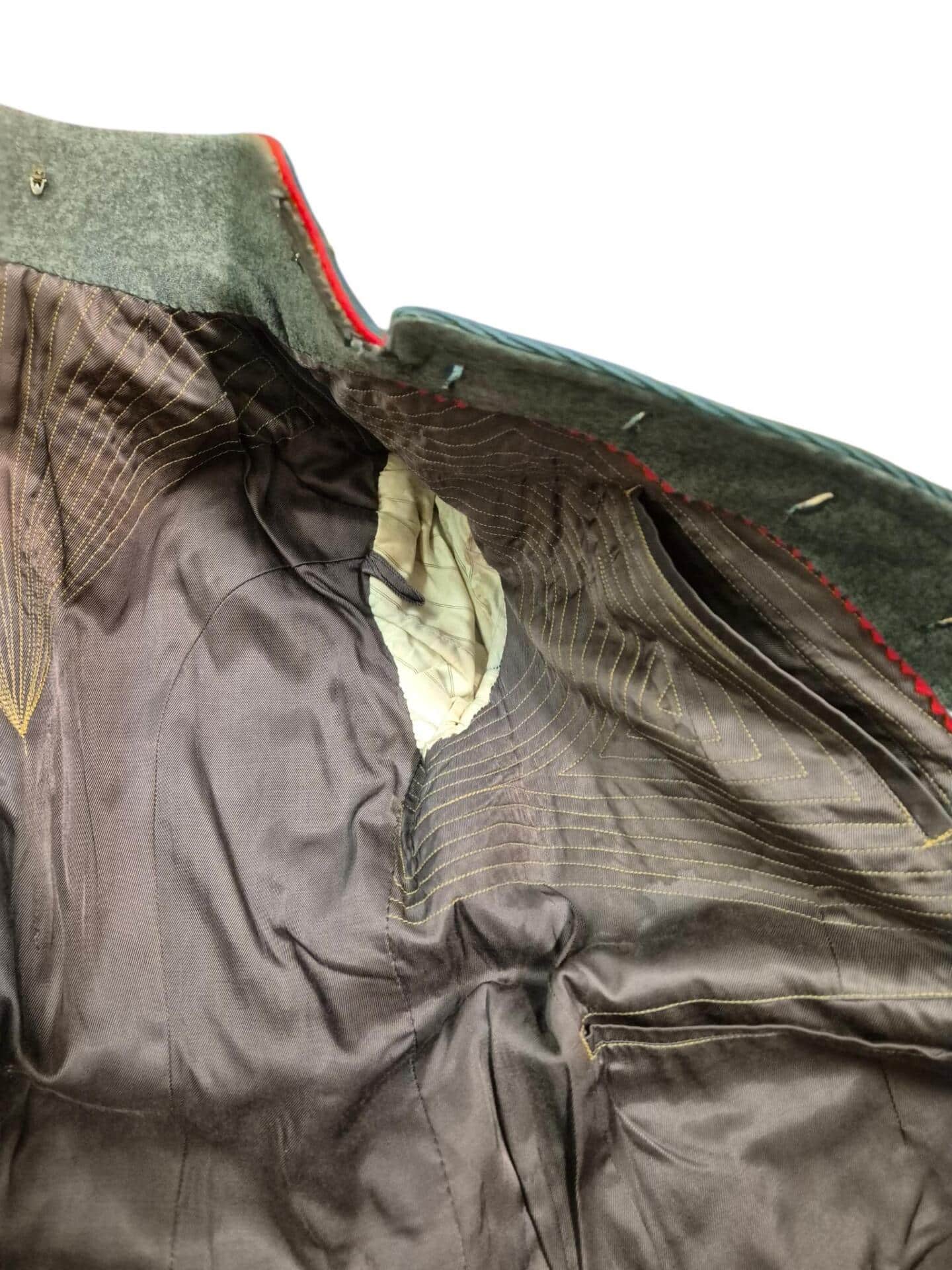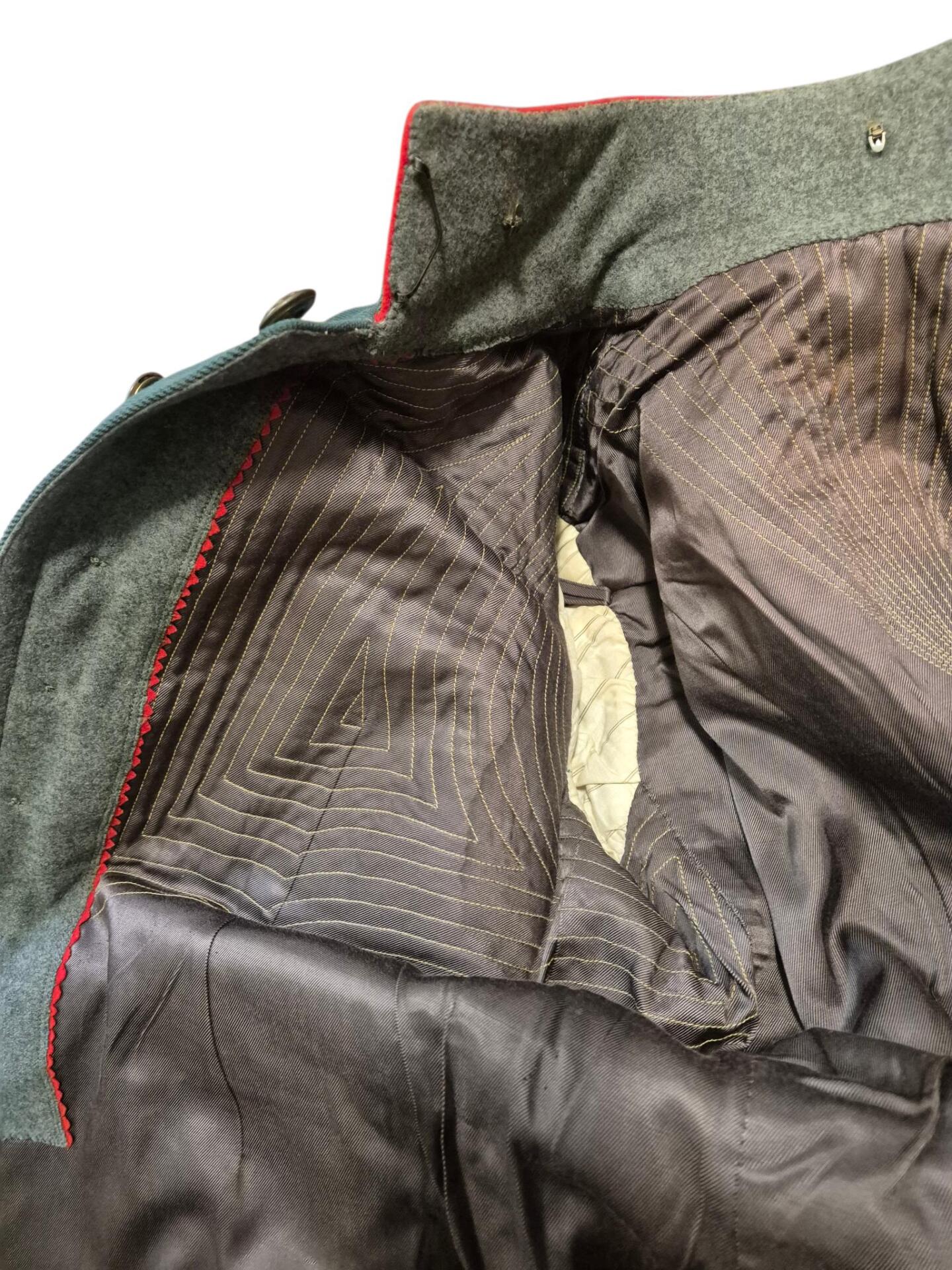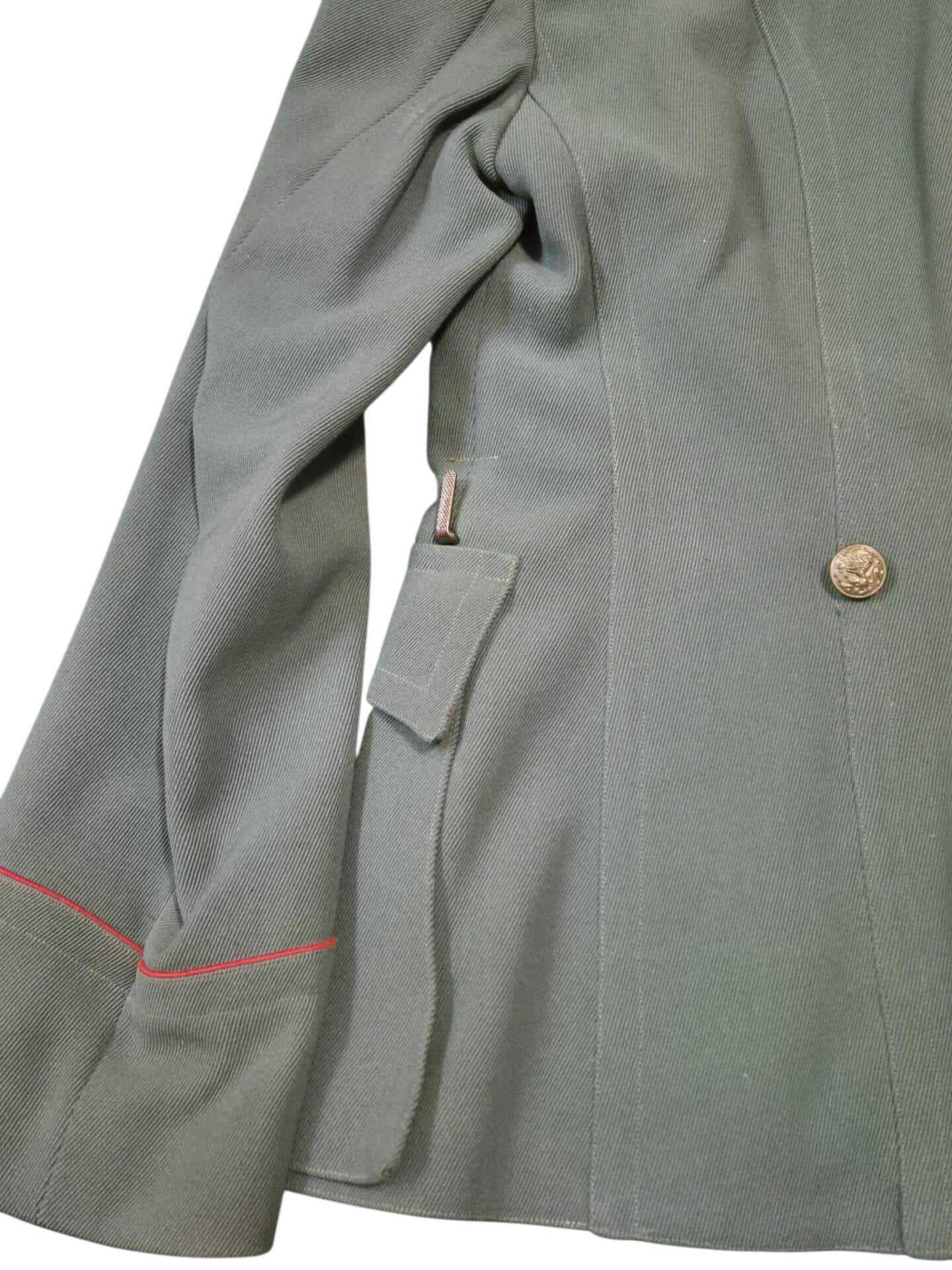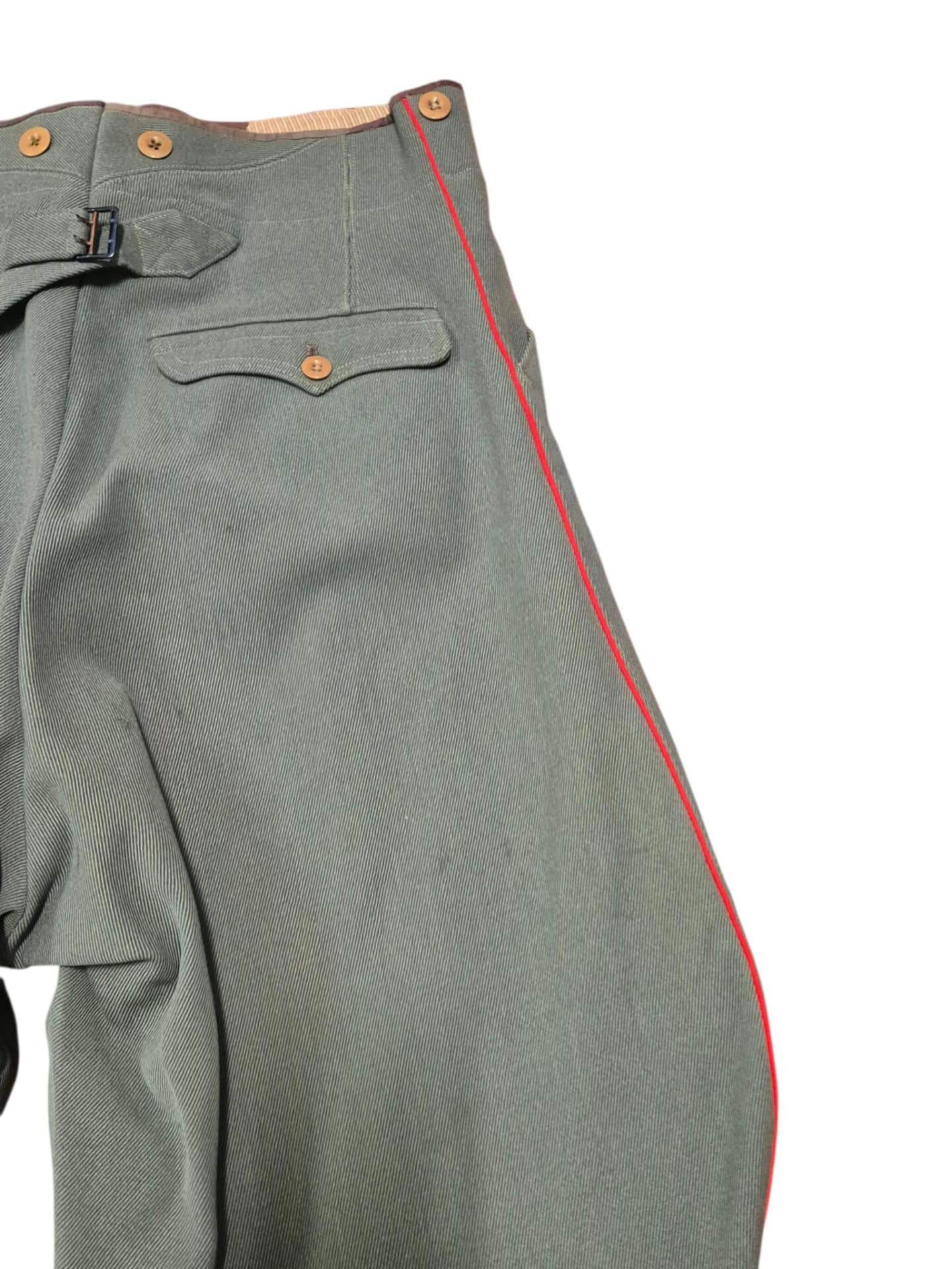 Prachtige set van een vaandrig der artillerie, dit betreft een der laagste officiersrangen. Het pak is gemaakt van een laat jaren 30 blauwgrijze whipcord stof. Op de foto´s komt de kleur niet helemaal goed naar voren. De Jas is in een zeer goede conditie met enkele kleine slijtageplekjes, geen motgaten. De kraag  met de in geborduurde kanonnen is in een zeer goede conditie. De broek heeft een iets lichtere kleur maar is wel gemaakt van exact dezelfde stof en is zo als set gevonden. De broek heeft 1 klein motgaatje in het kruis. Mooie  pofbroek met felrode biezen, met nog de originele bindveters. Mooie set van een adjudant van het wapen der artillerie