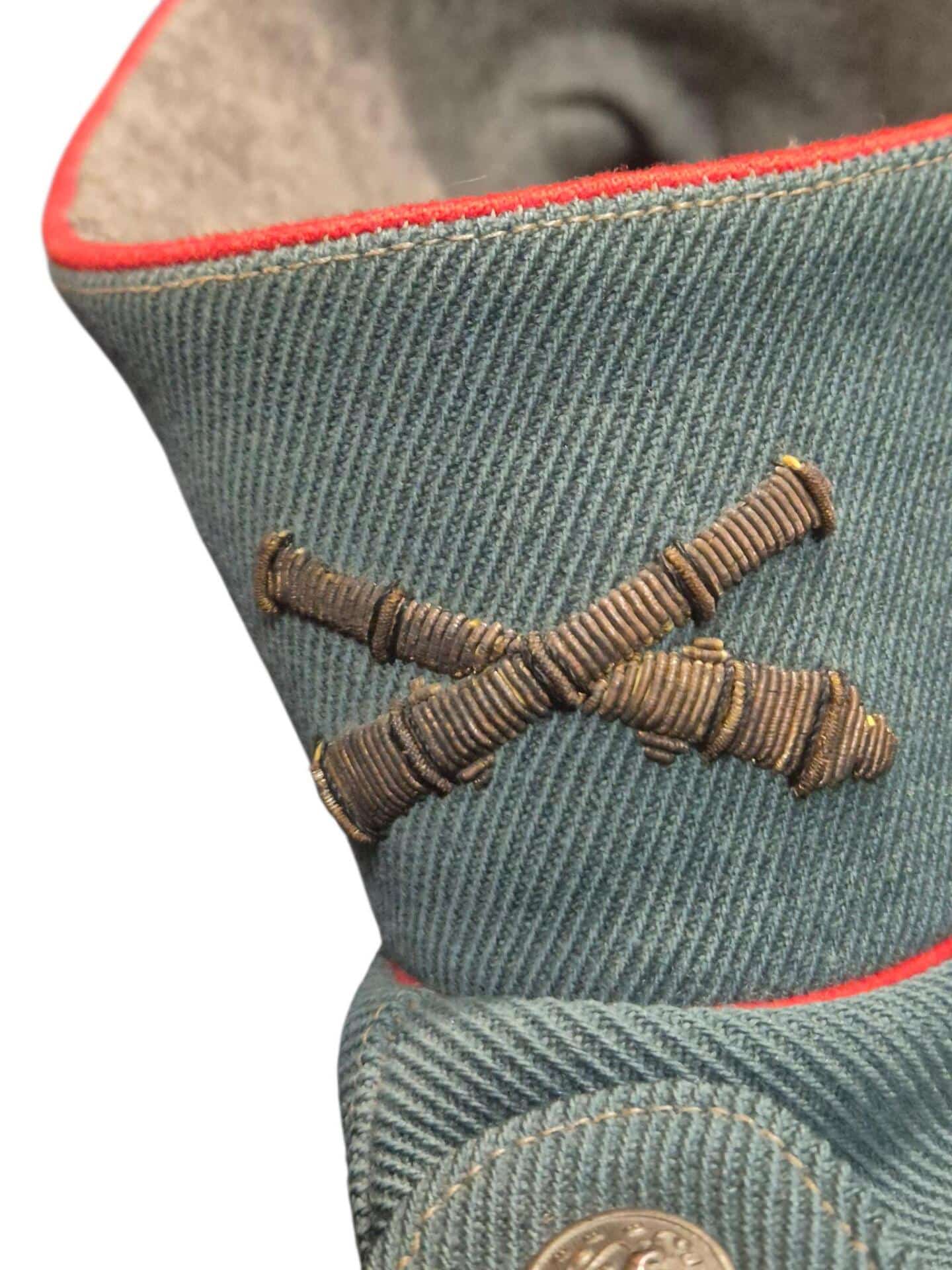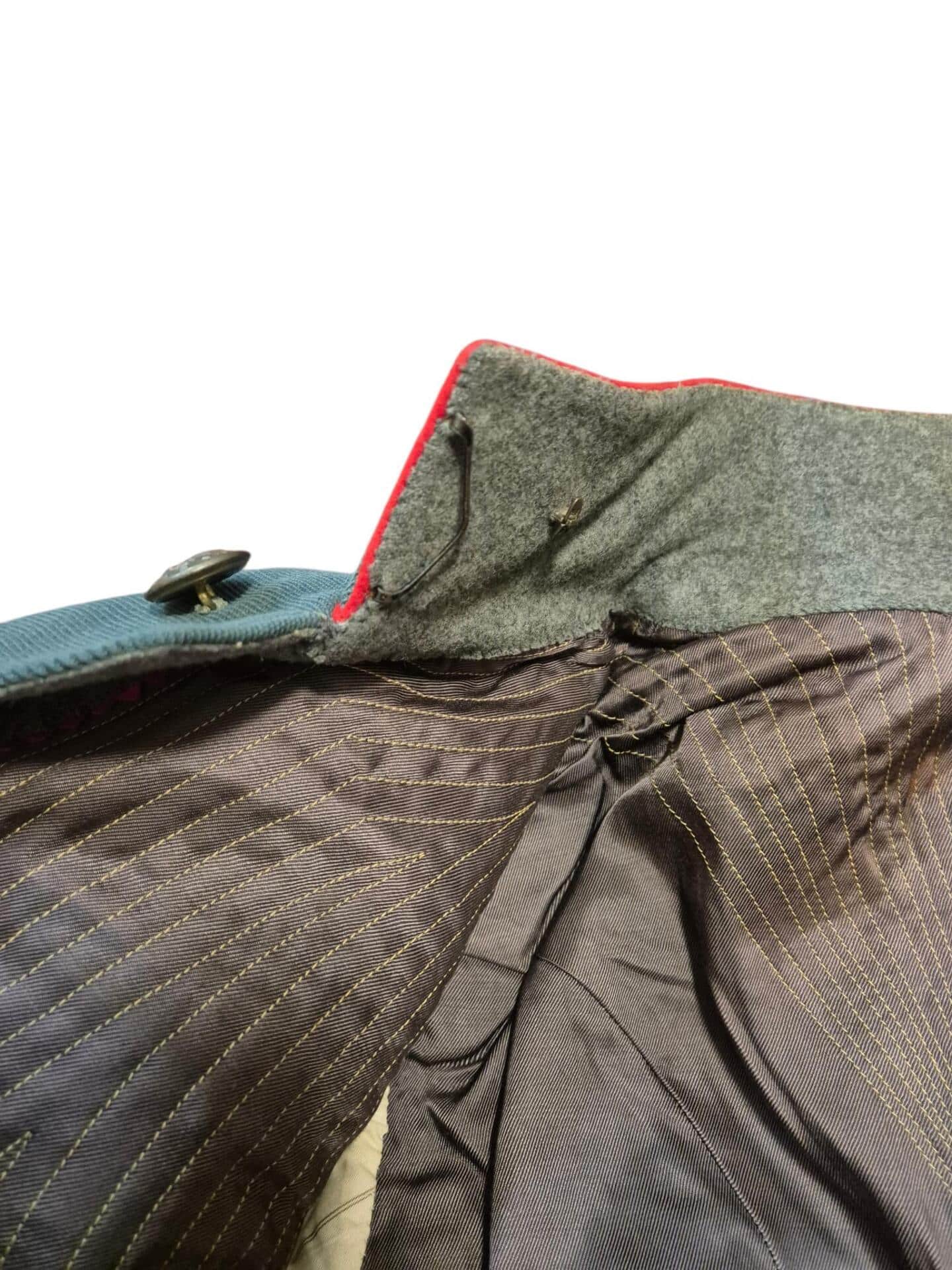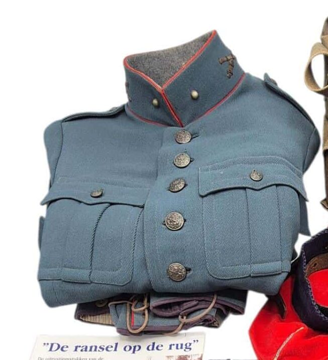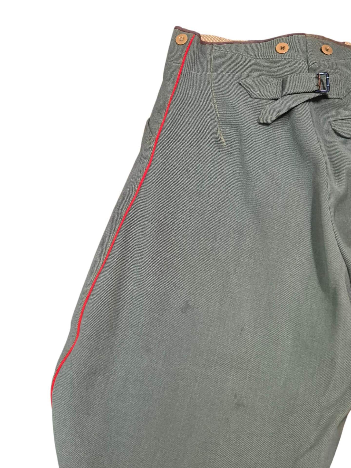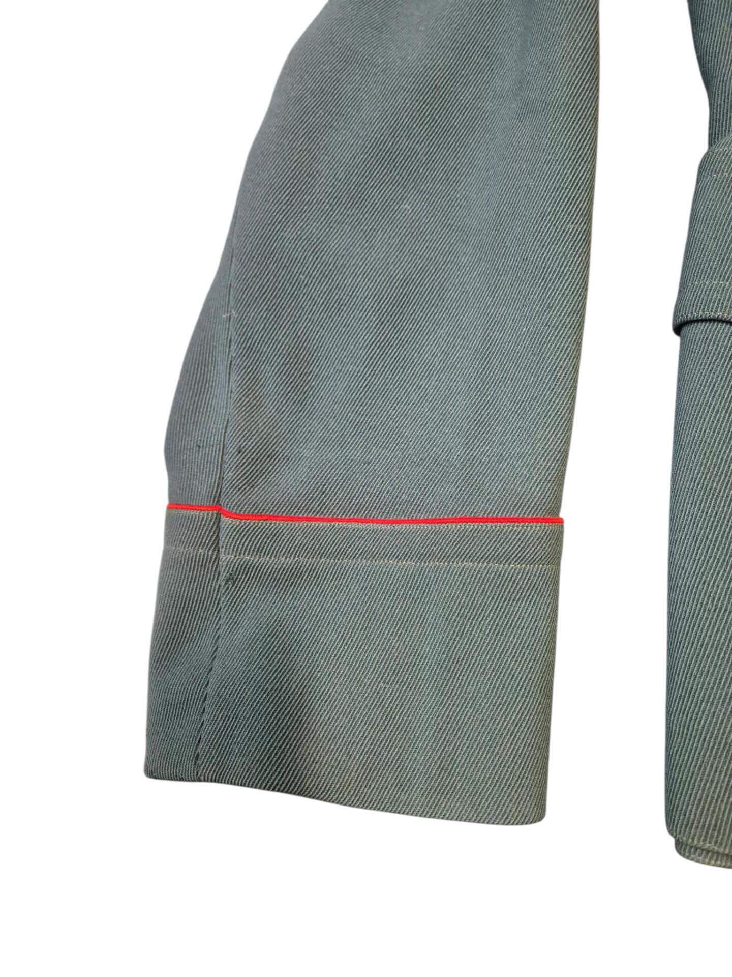Prachtige set van een vaandrig der artillerie, dit betreft een der laagste officiersrangen. Het pak is gemaakt van een laat jaren 30 blauwgrijze whipcord stof. Op de foto´s komt de kleur niet helemaal goed naar voren. De Jas is in een zeer goede conditie met enkele kleine slijtageplekjes, geen motgaten. De kraag  met de in geborduurde kanonnen is in een zeer goede conditie. De broek heeft een iets lichtere kleur maar is wel gemaakt van exact dezelfde stof en is zo als set gevonden. De broek heeft 1 klein motgaatje in het kruis. Mooie  pofbroek met felrode biezen, met nog de originele bindveters. Mooie set van een adjudant van het wapen der artillerie