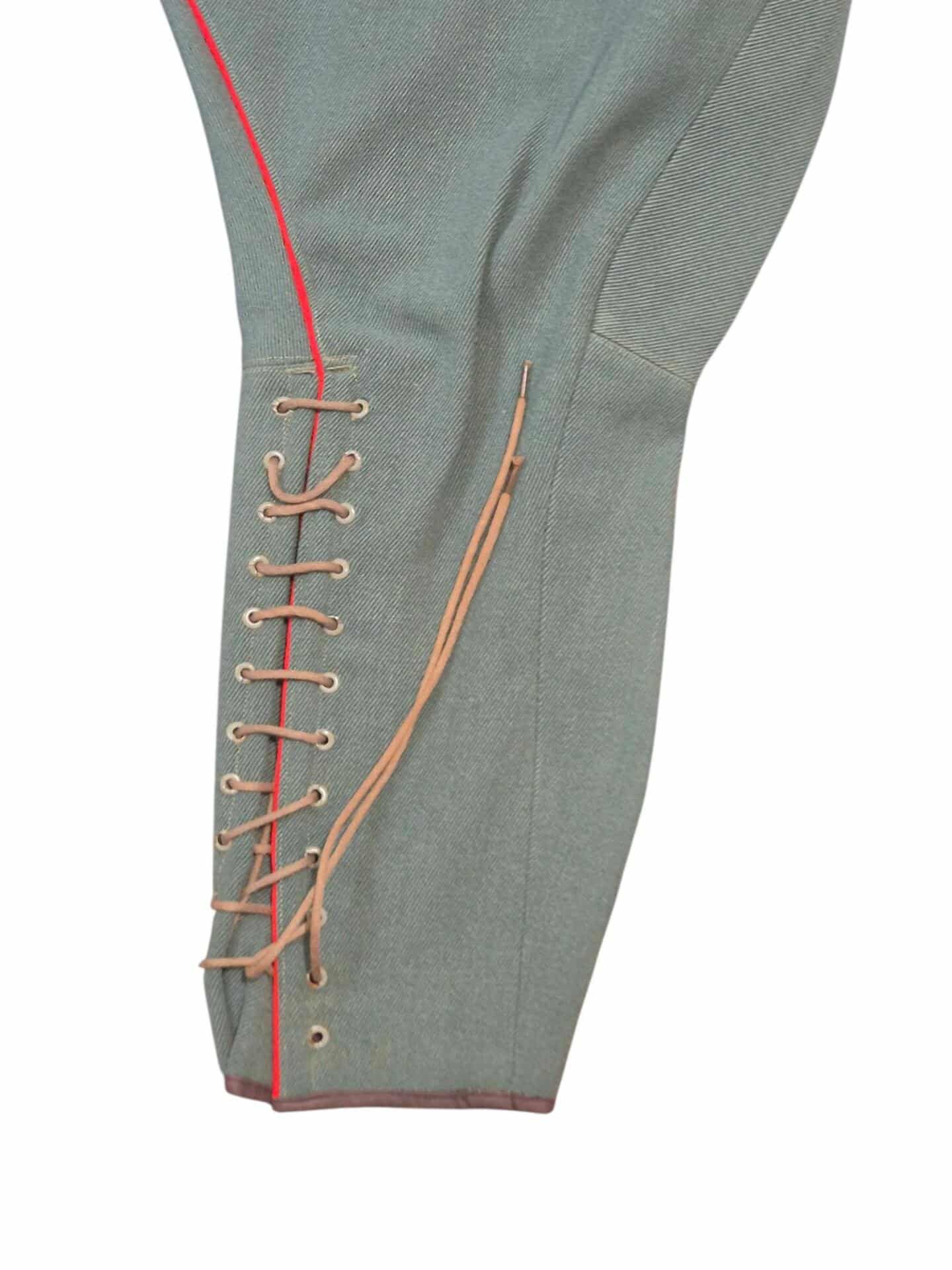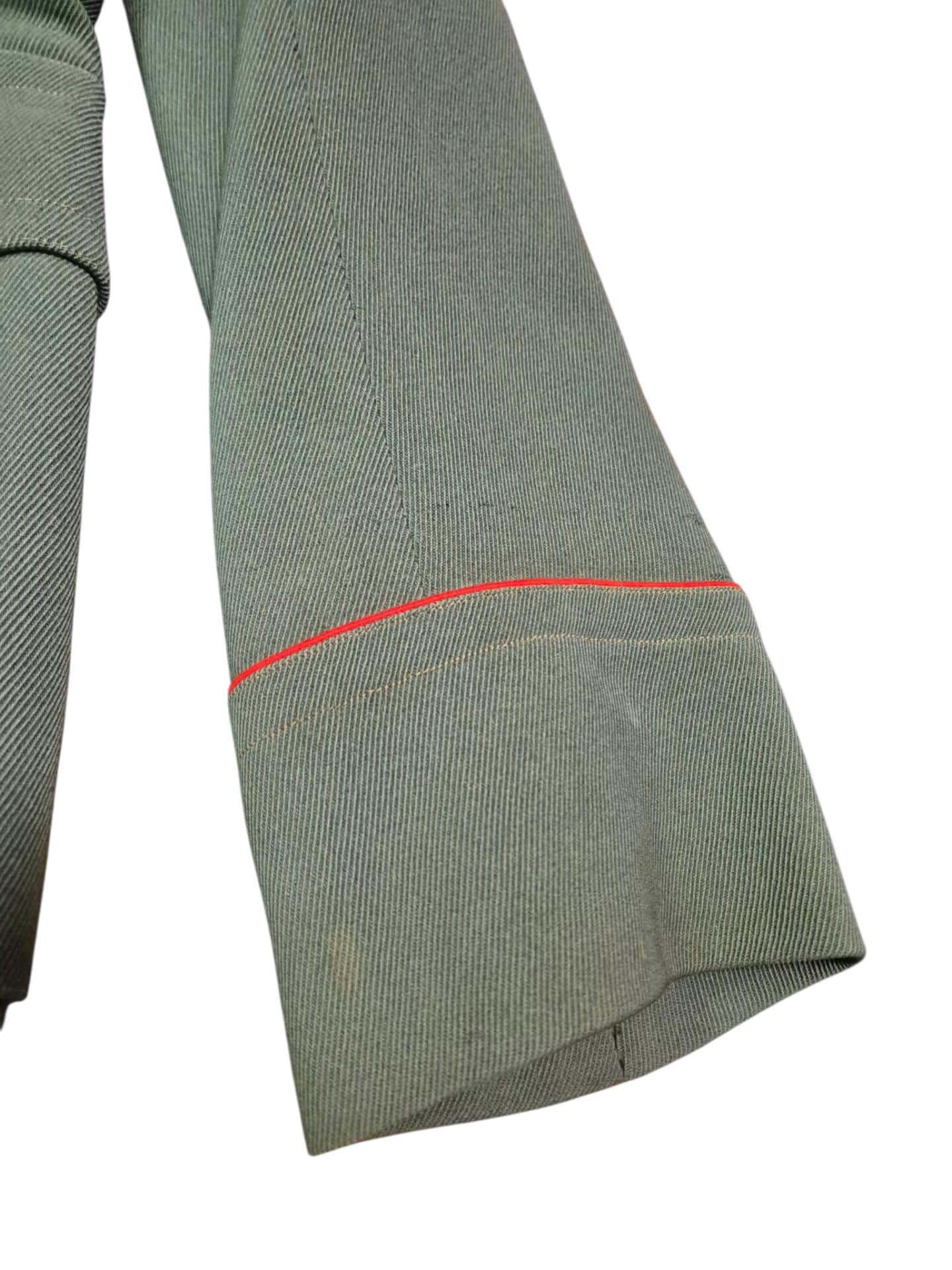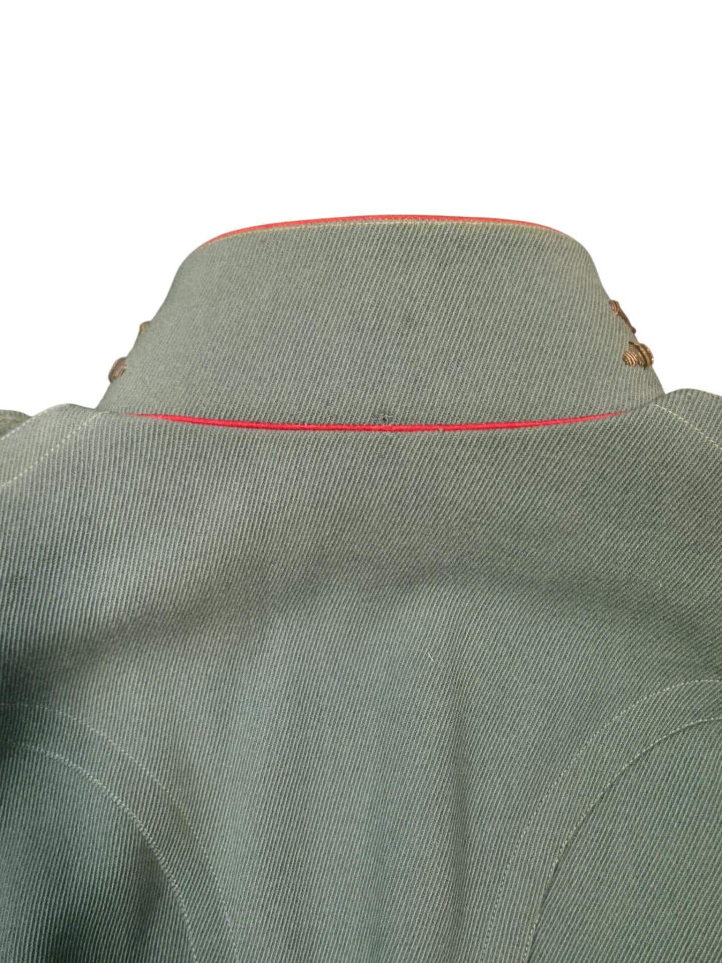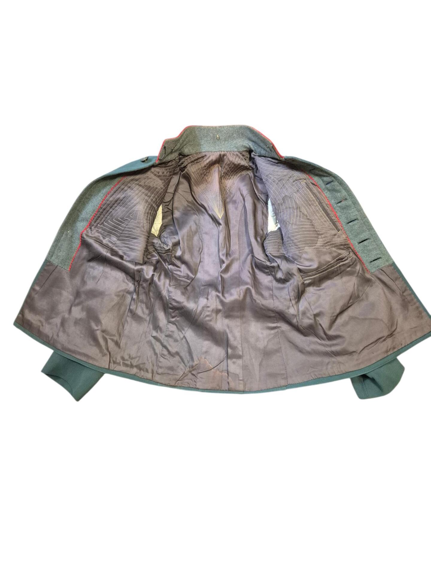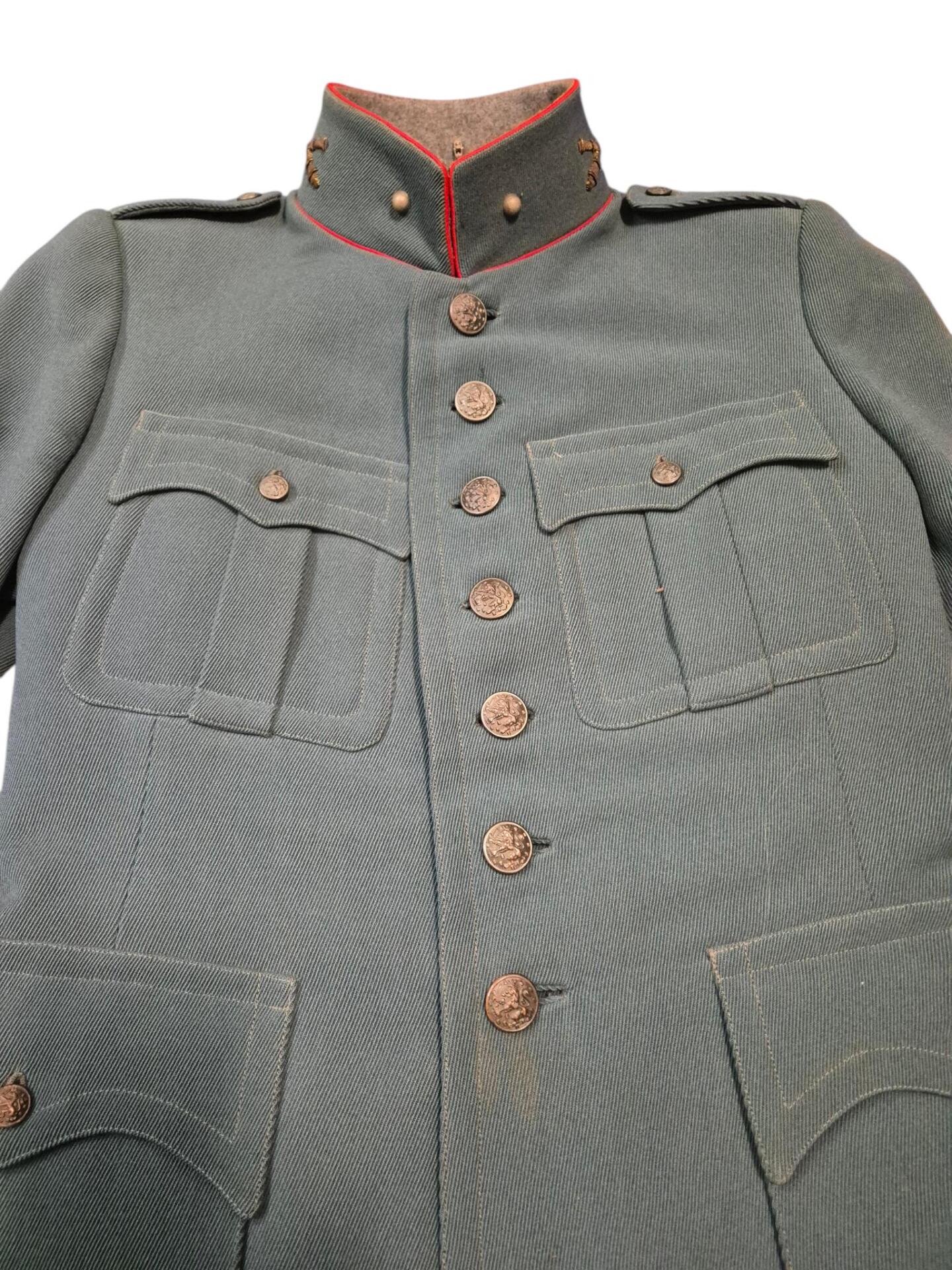 Prachtige set van een vaandrig der artillerie, dit betreft een der laagste officiersrangen. Het pak is gemaakt van een laat jaren 30 blauwgrijze whipcord stof. Op de foto´s komt de kleur niet helemaal goed naar voren. De Jas is in een zeer goede conditie met enkele kleine slijtageplekjes, geen motgaten. De kraag  met de in geborduurde kanonnen is in een zeer goede conditie. De broek heeft een iets lichtere kleur maar is wel gemaakt van exact dezelfde stof en is zo als set gevonden. De broek heeft 1 klein motgaatje in het kruis. Mooie  pofbroek met felrode biezen, met nog de originele bindveters. Mooie set van een adjudant van het wapen der artillerie