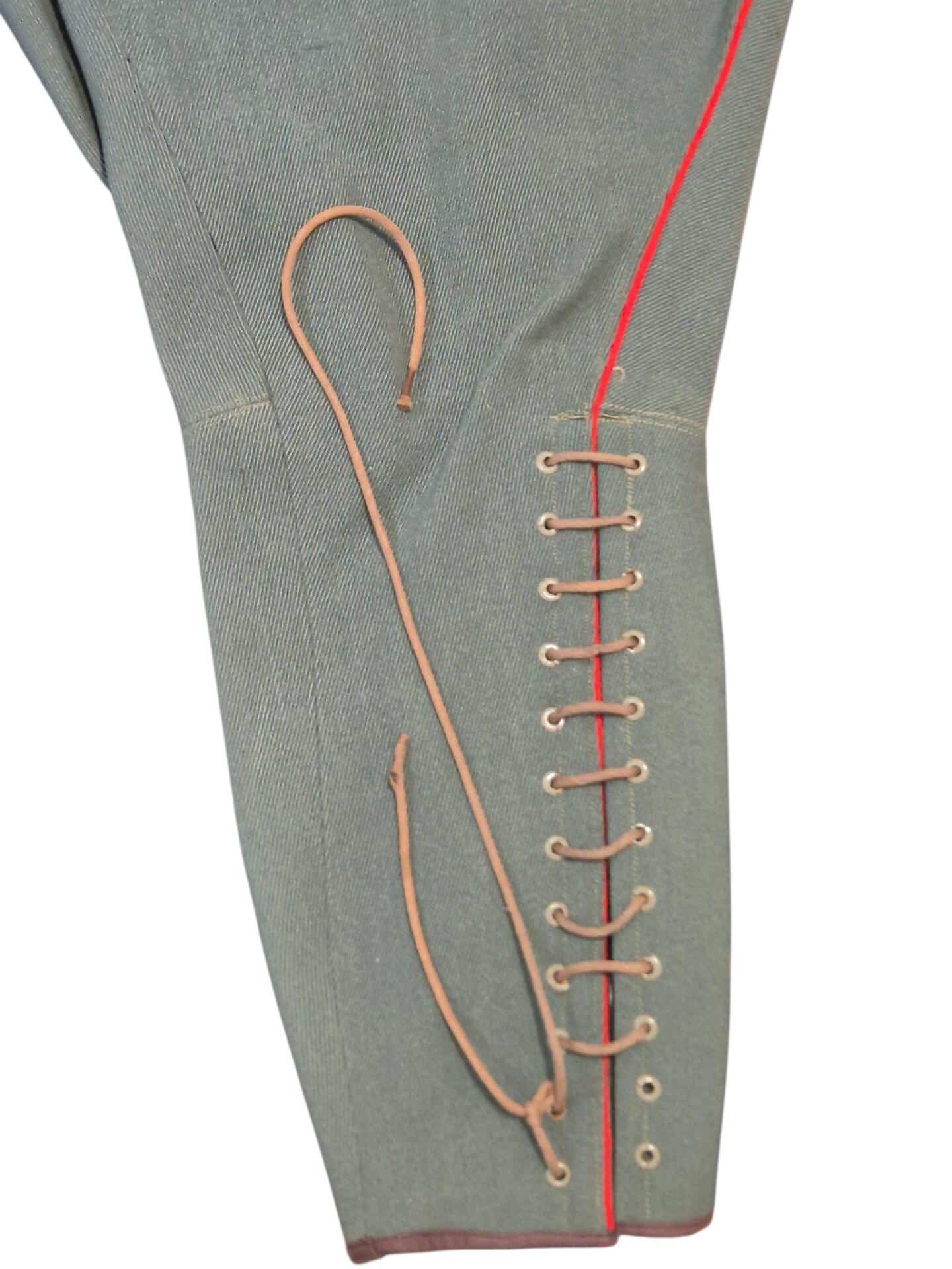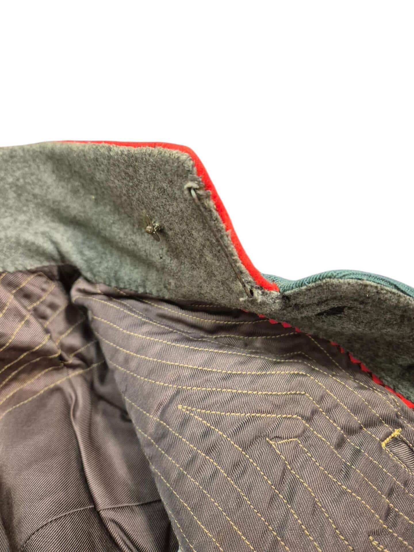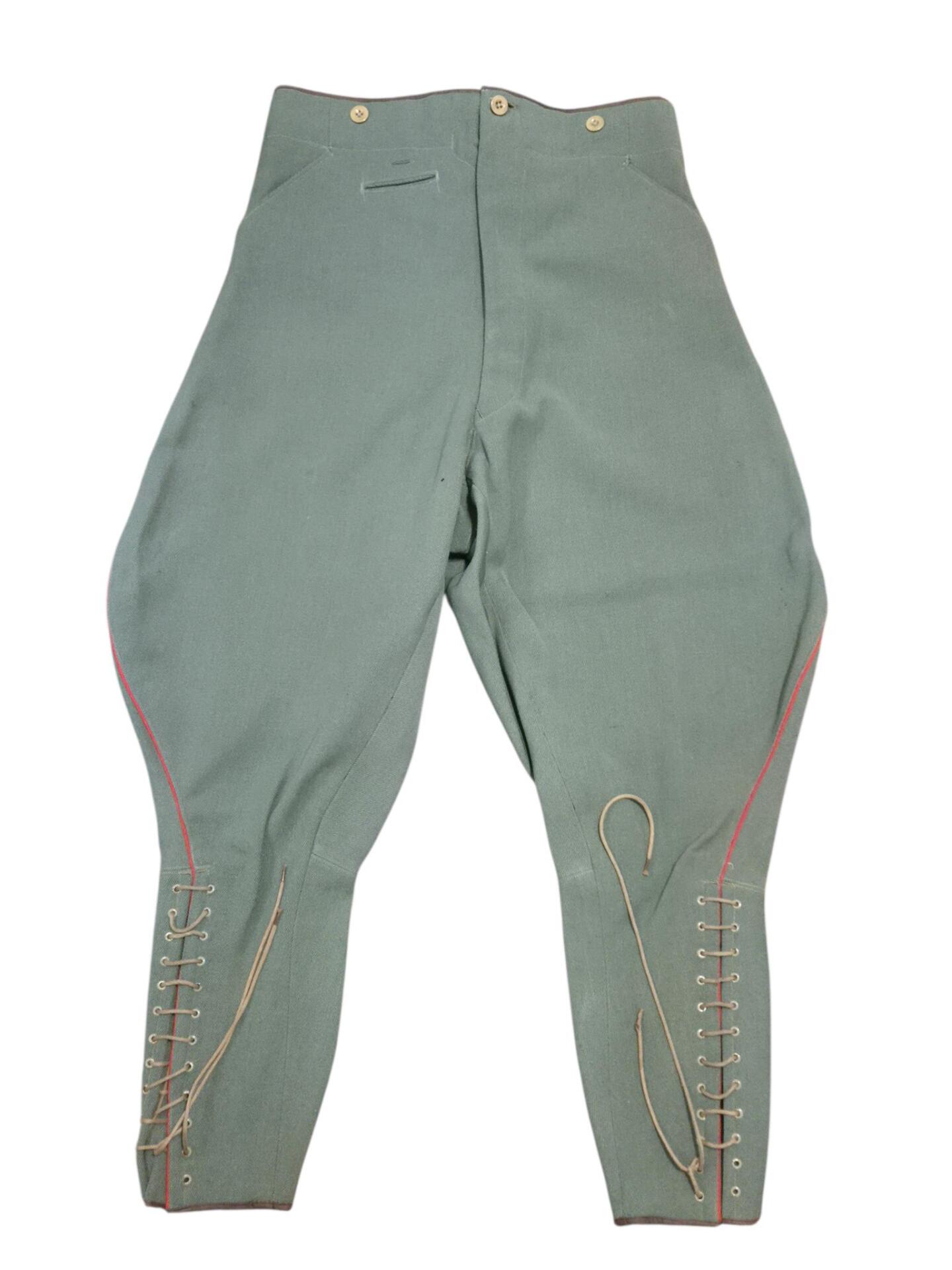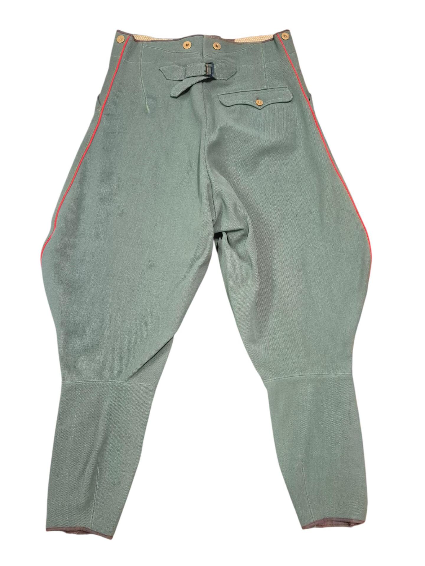 Prachtige set van een vaandrig der artillerie, dit betreft een der laagste officiersrangen. Het pak is gemaakt van een laat jaren 30 blauwgrijze whipcord stof. Op de foto´s komt de kleur niet helemaal goed naar voren. De Jas is in een zeer goede conditie met enkele kleine slijtageplekjes, geen motgaten. De kraag  met de in geborduurde kanonnen is in een zeer goede conditie. De broek heeft een iets lichtere kleur maar is wel gemaakt van exact dezelfde stof en is zo als set gevonden. De broek heeft 1 klein motgaatje in het kruis. Mooie  pofbroek met felrode biezen, met nog de originele bindveters. Mooie set van een adjudant van het wapen der artillerie