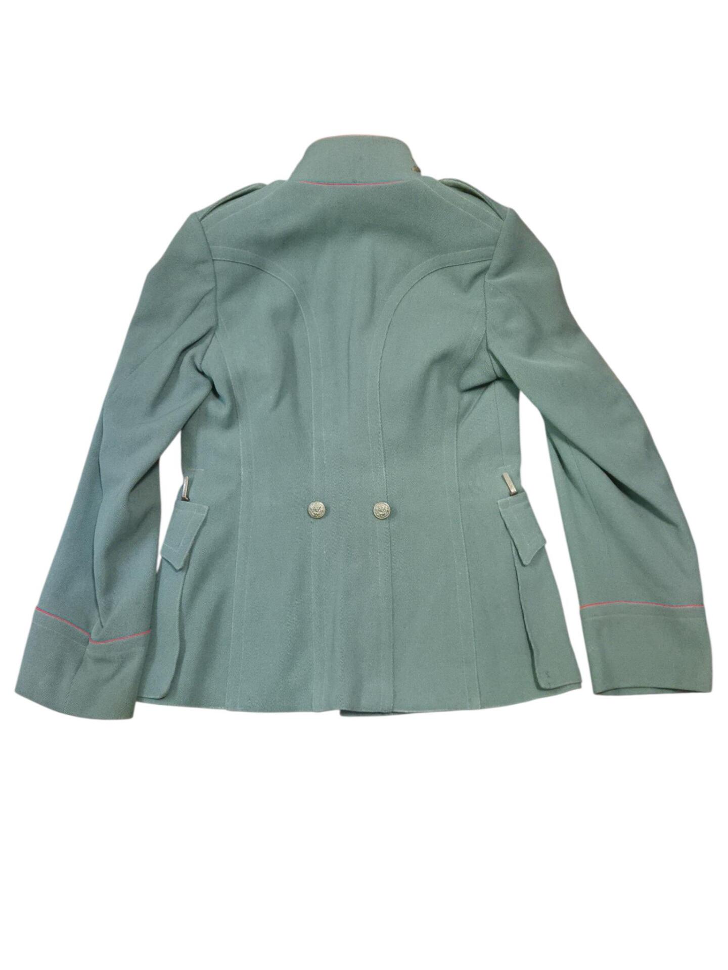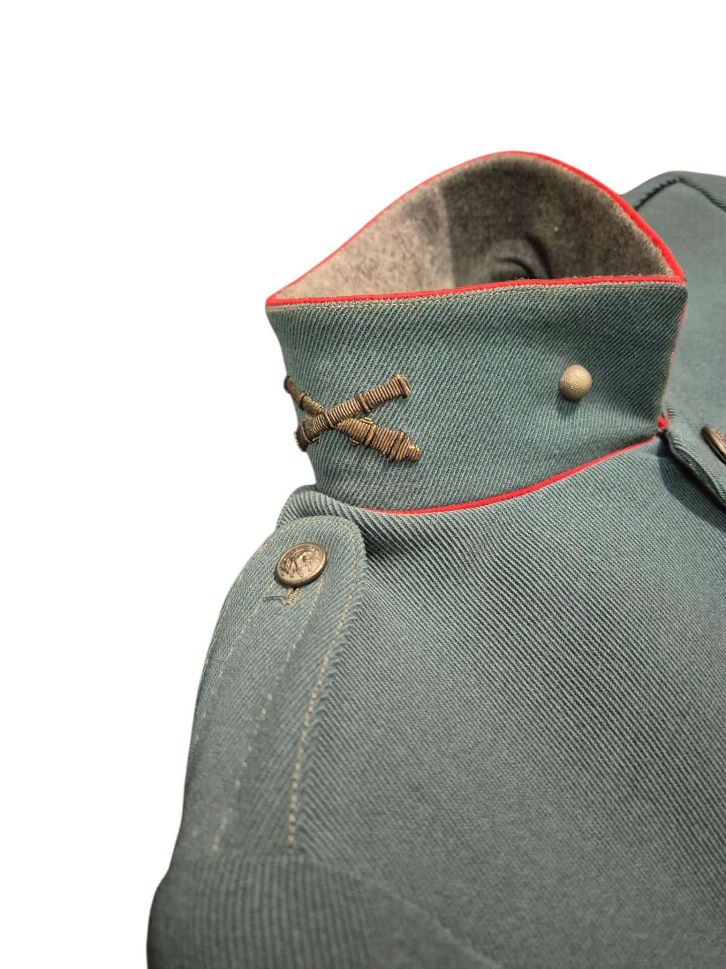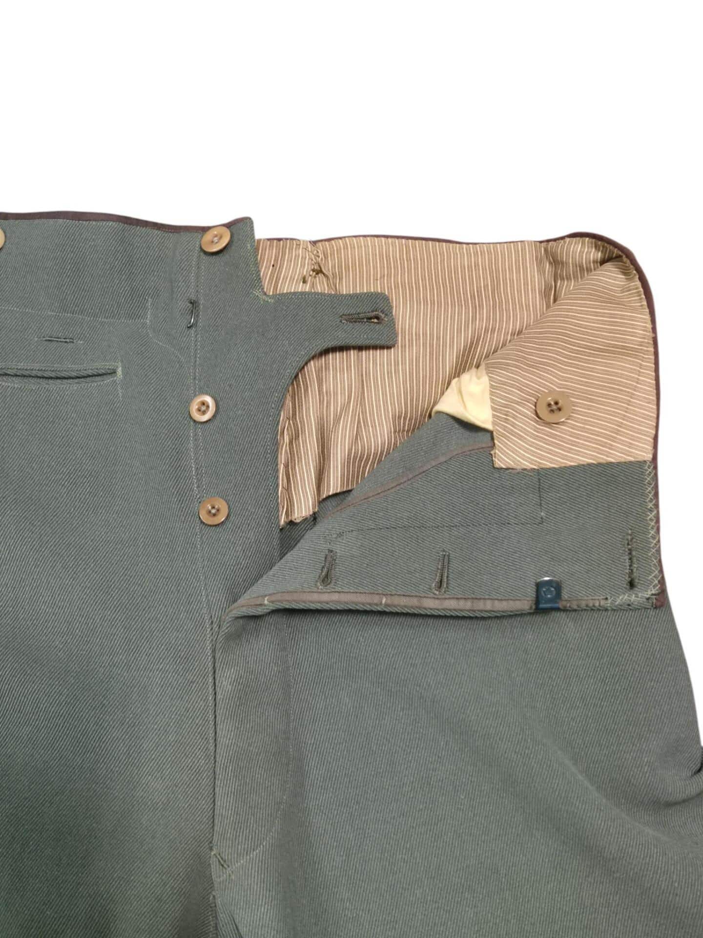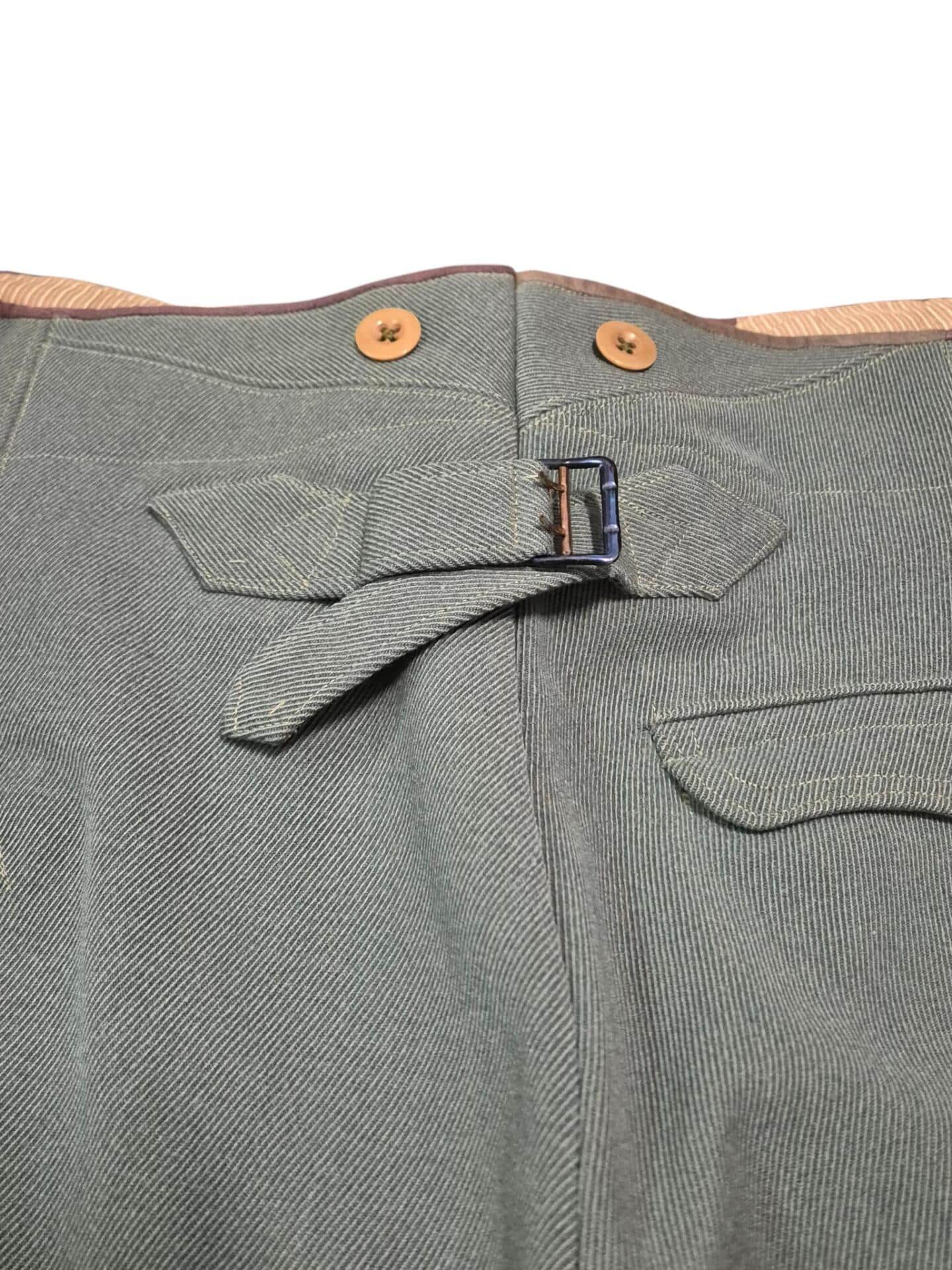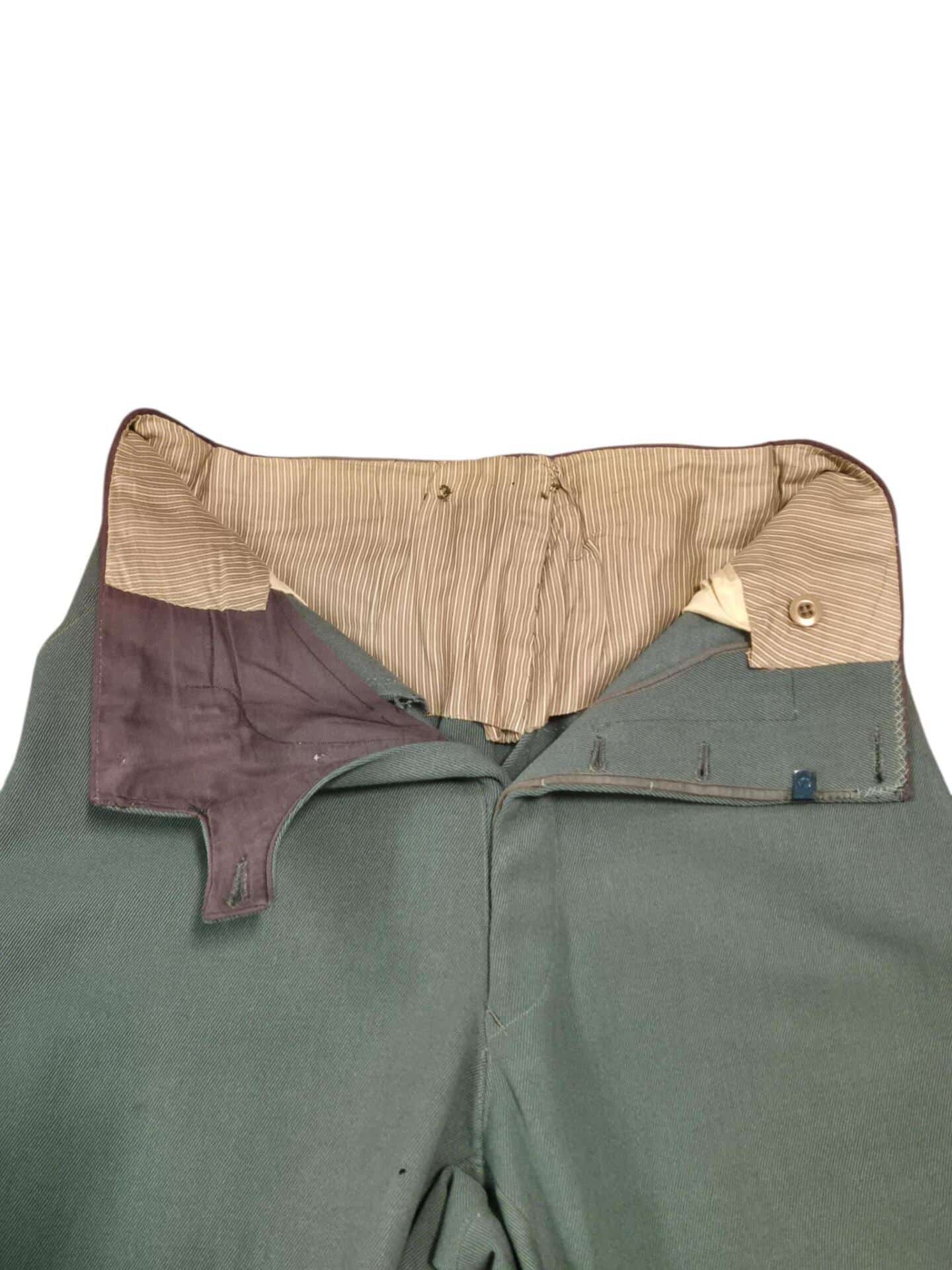 Prachtige set van een vaandrig der artillerie, dit betreft een der laagste officiersrangen. Het pak is gemaakt van een laat jaren 30 blauwgrijze whipcord stof. Op de foto´s komt de kleur niet helemaal goed naar voren. De Jas is in een zeer goede conditie met enkele kleine slijtageplekjes, geen motgaten. De kraag  met de in geborduurde kanonnen is in een zeer goede conditie. De broek heeft een iets lichtere kleur maar is wel gemaakt van exact dezelfde stof en is zo als set gevonden. De broek heeft 1 klein motgaatje in het kruis. Mooie  pofbroek met felrode biezen, met nog de originele bindveters. Mooie set van een adjudant van het wapen der artillerie